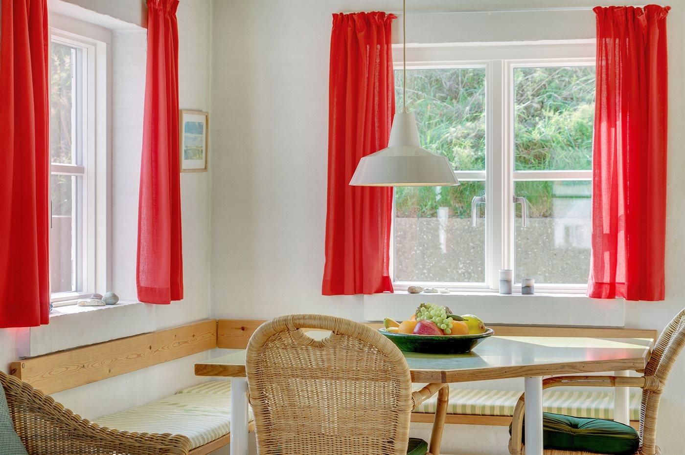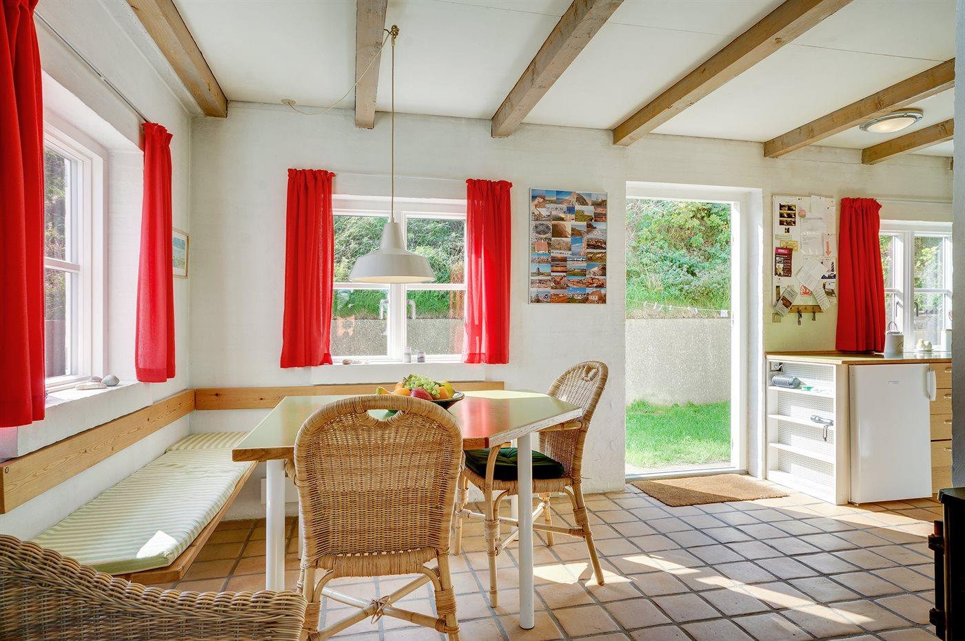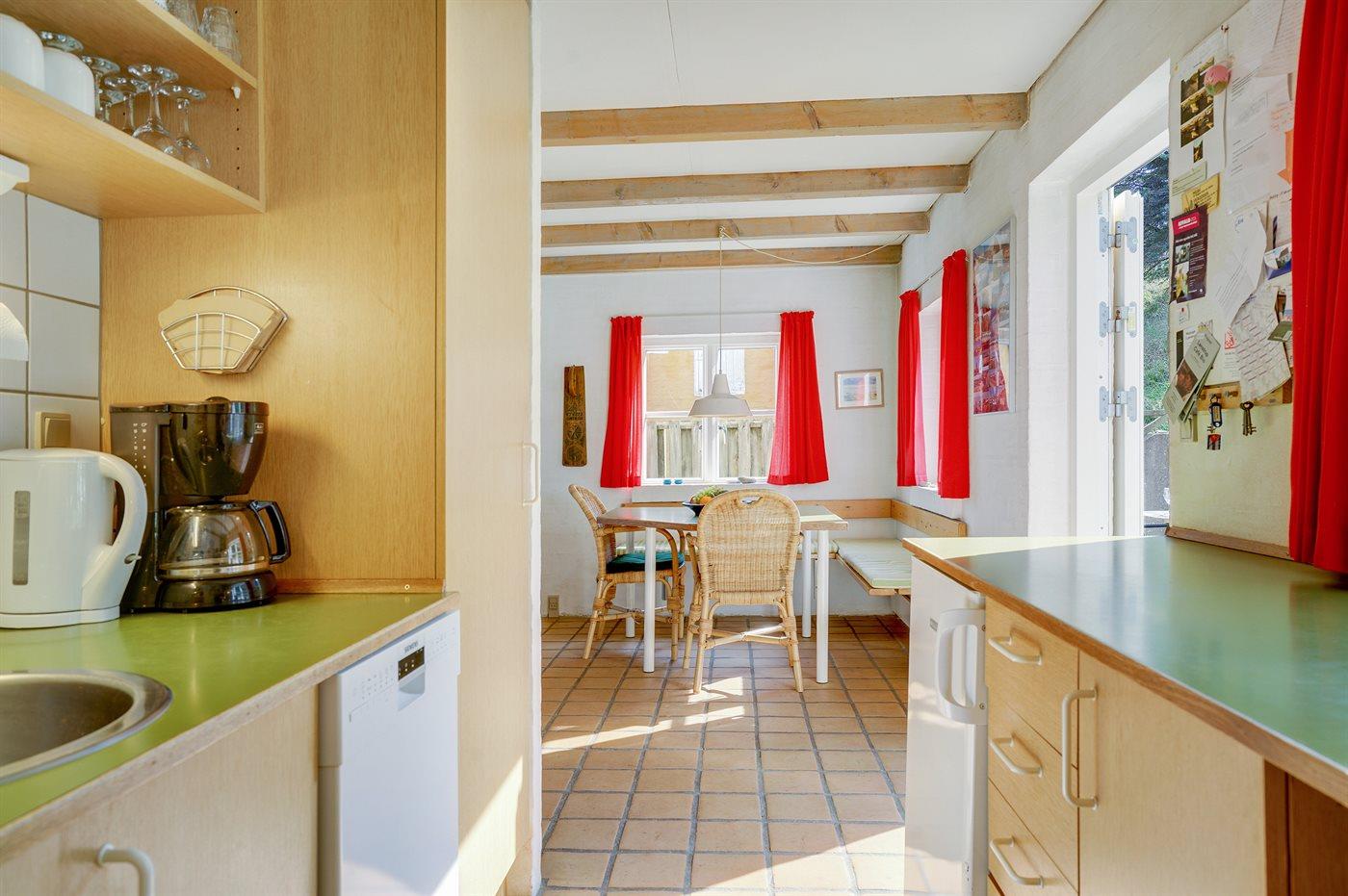 Køkkenet er udstyret med 1 køleskab. Der er 4 keramiske kogeplader, bageovn, mikrobølgeovn samt opvaskemaskine.