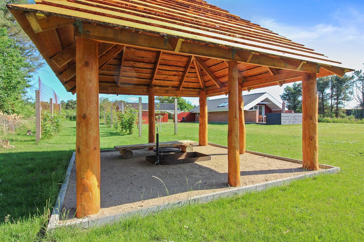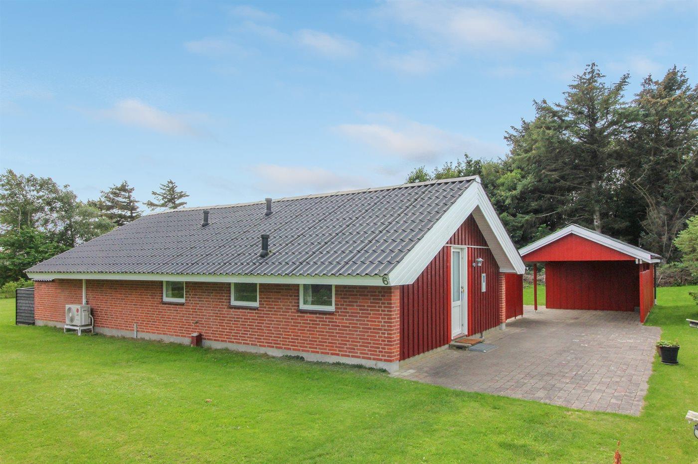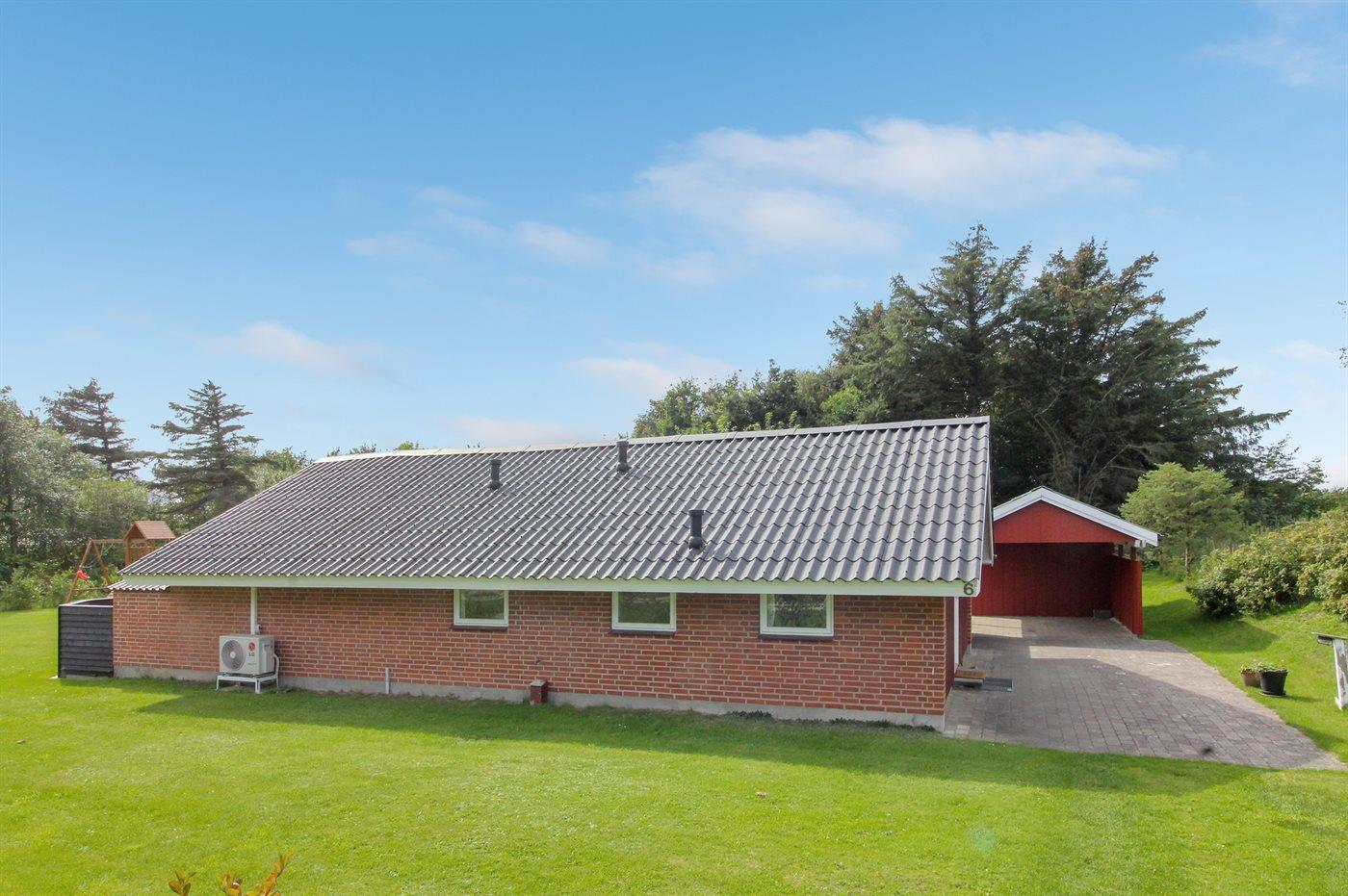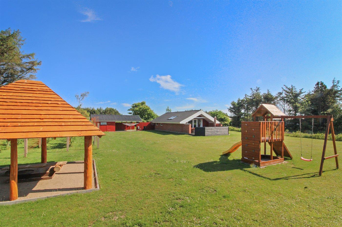 Ferieboligen er beliggende på en 1600 m² stor naturgrund. Der er 700 m til havet. Nærmeste forretning er beliggende i en afstand af 700 m. Til ferieboligen hører 18 m² terrasseareal. Desuden er der 12 m² overdækket terrasse. Gynge. Sandkasse. Legehus. Legetårn. Bålsted. Der er carport til rådighed. Der er installeret stik til opladning af elbil. Parkering ved ferieboligen.