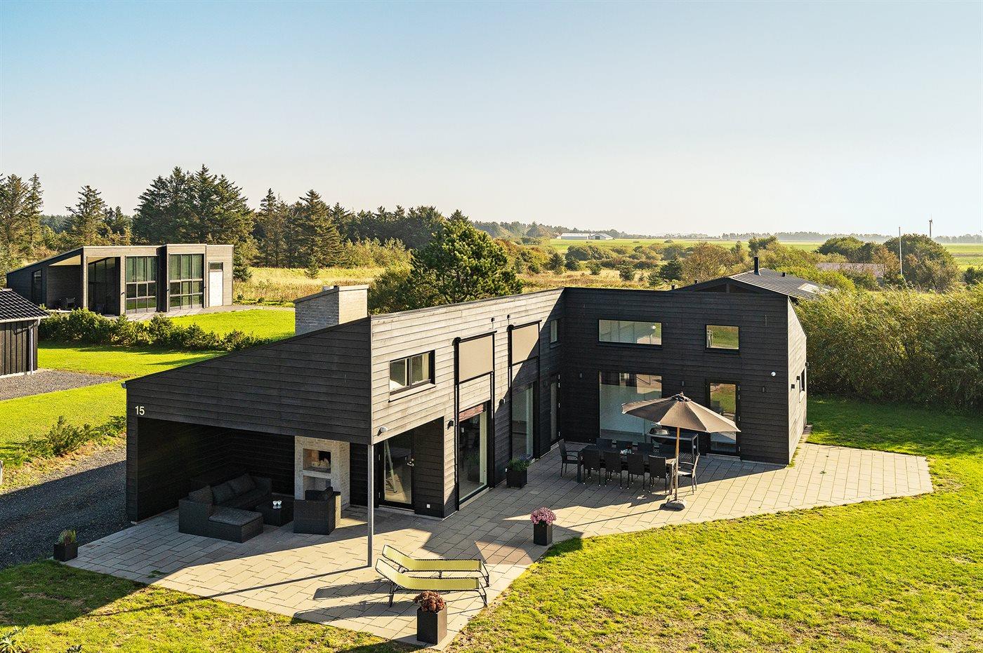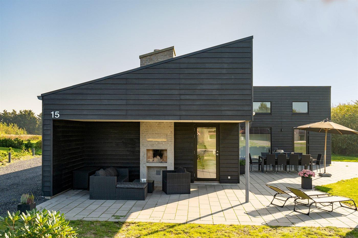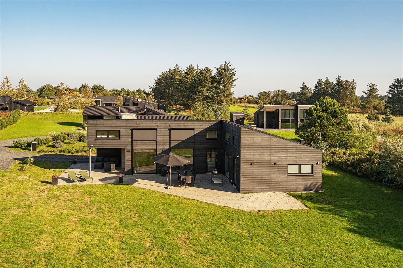 Ferieboligen er beliggende på en 1225 m² stor naturgrund. Der er 998 m til havet. Nærmeste forretning er beliggende i en afstand af 500 m. Til ferieboligen hører 105 m² terrasseareal. Desuden er der 15 m² overdækket terrasse. På lune aftener sørger en udendørs pejs for hyggelig stemning. Der er installeret stik til opladning af elbil. Med 11 kW ladeeffekt. Parkering ved ferieboligen. Udvendigt på husets vinduer er der monteret screens, så det er muligt at skærme af for sol og varme på meget solrige dage.