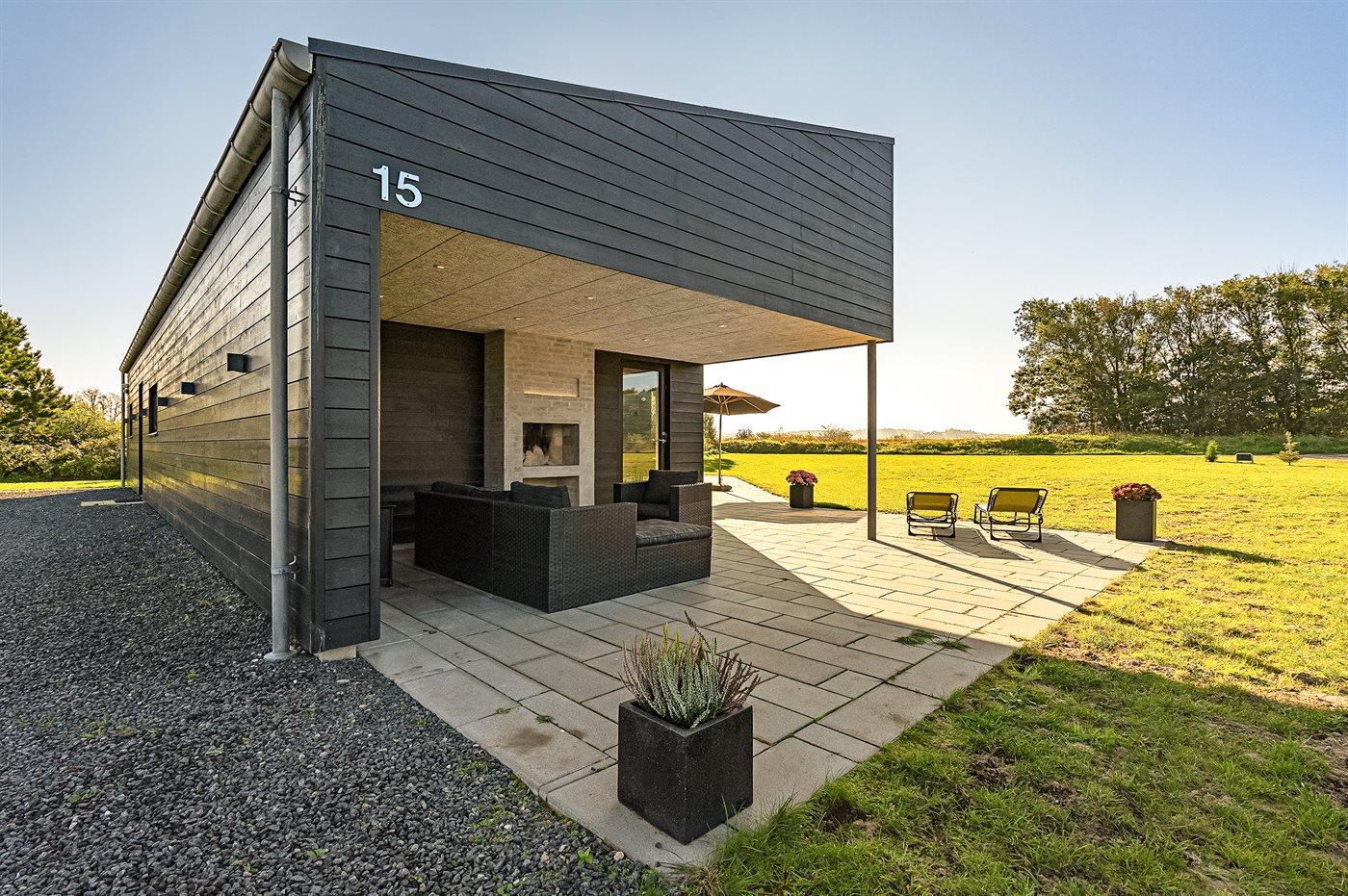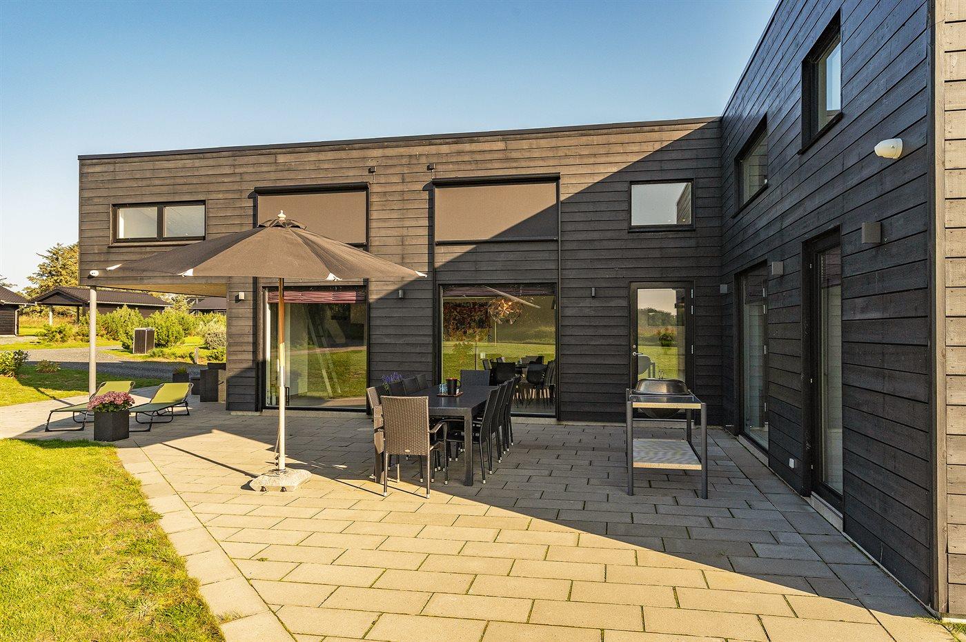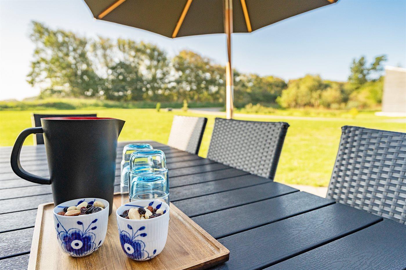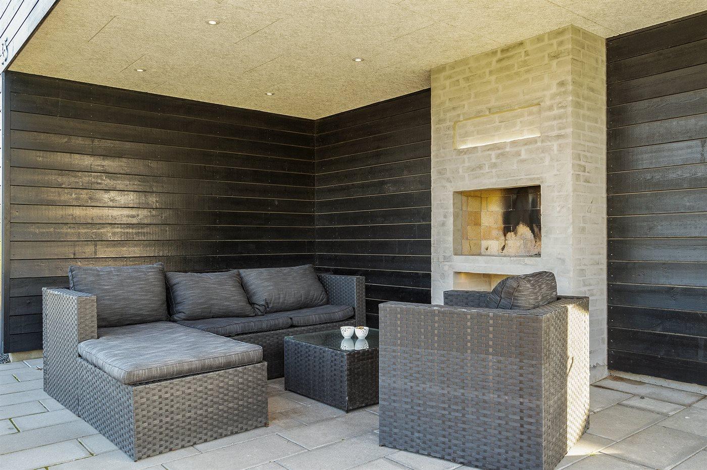 Ferieboligen er beliggende på en 1225 m² stor naturgrund. Der er 998 m til havet. Nærmeste forretning er beliggende i en afstand af 500 m. Til ferieboligen hører 105 m² terrasseareal. Desuden er der 15 m² overdækket terrasse. På lune aftener sørger en udendørs pejs for hyggelig stemning. Der er installeret stik til opladning af elbil. Med 11 kW ladeeffekt. Parkering ved ferieboligen. Udvendigt på husets vinduer er der monteret screens, så det er muligt at skærme af for sol og varme på meget solrige dage.