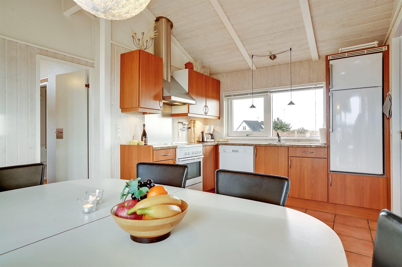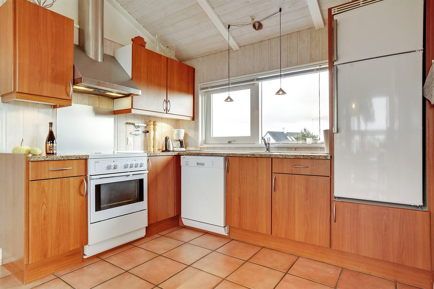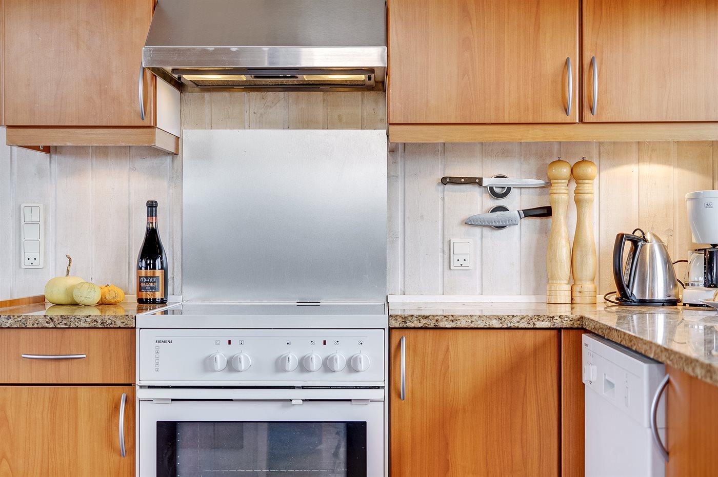 Køkkenet er udstyret med 1 køleskab. Der er 4 keramiske kogeplader, varmluftovn, mikrobølgeovn samt opvaskemaskine Der er gulvvarme i køkkenet.