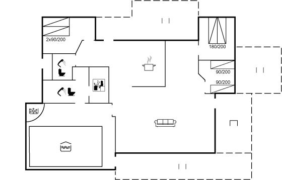 Der er 2 badeværelser med bruseniche og 2 toiletter. Der er gulvvarme på 1 badeværelse. I saunaen er der mulighed for afslapning.
