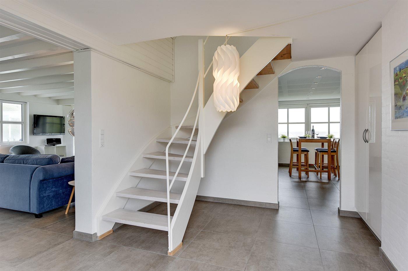 Skønt og rummeligt sommerhus med en fantastisk beliggenhed i første klitrække og med en pragtfuld havudsigt fra næsten alle rum. Huset ligger på en privat blind vej, på en meget stor og kuperet grund direkte ud til stranden og lige bag det gamle centrum af Lønstrup by. Fra de 3 terrasser er der udsigt til byen, de fredede arealer ved Bækslugten samt til stranden og Vesterhavet. Huset er indrettet lyst og venligt med gulvvarme i hele stueetagen.