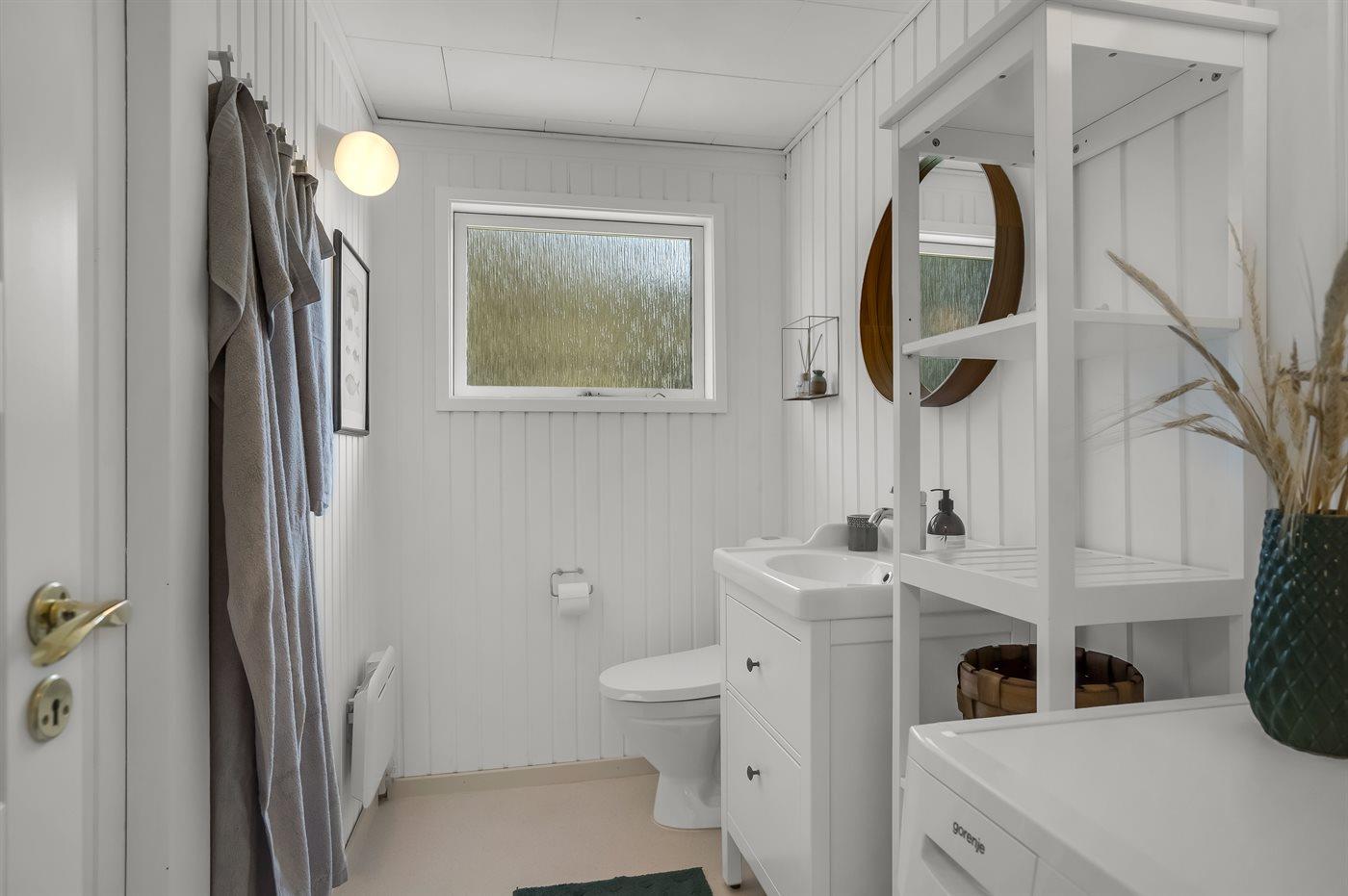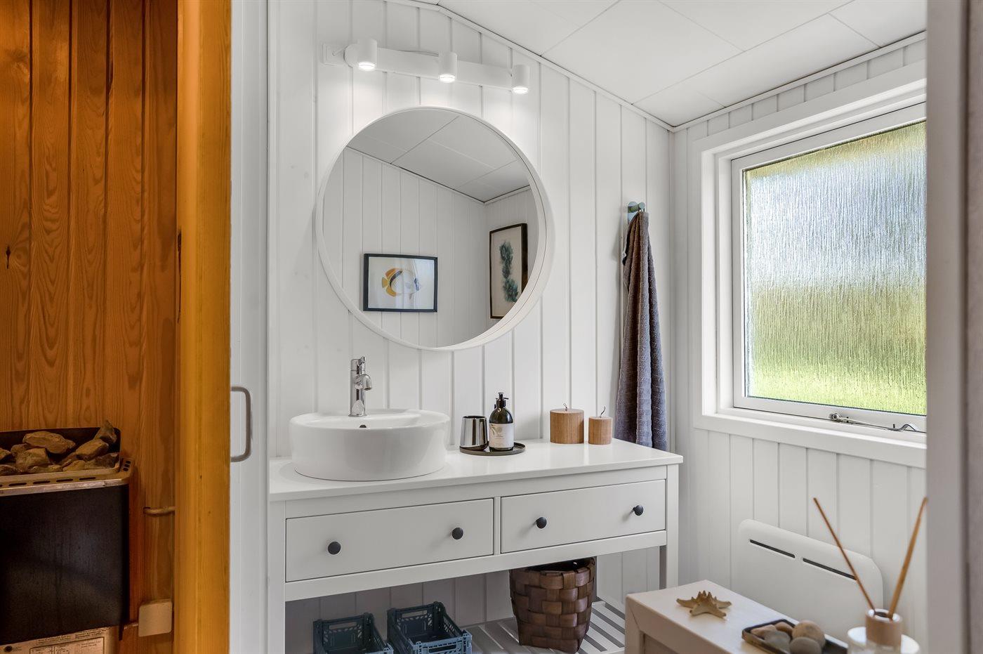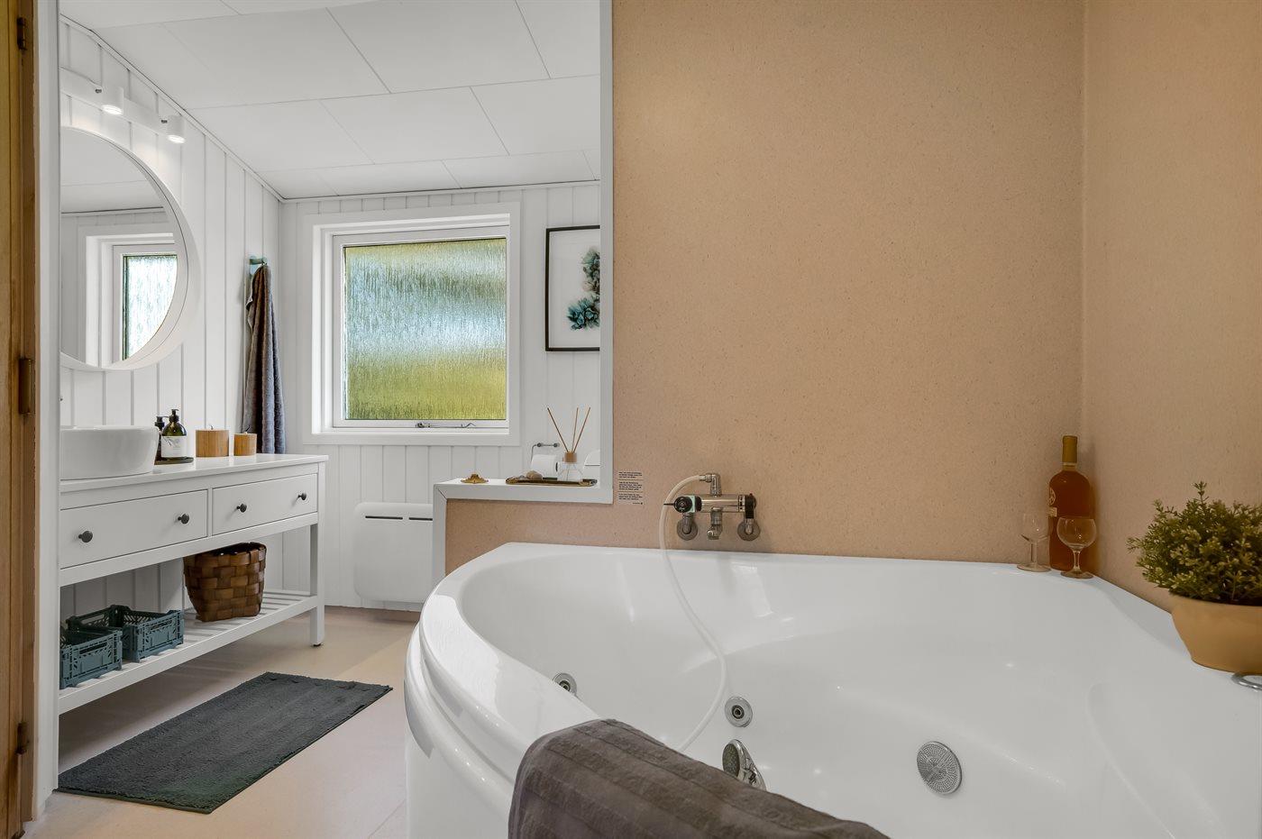 Der er 1 badeværelse med bruseniche, sauna og spa. 2 toiletter, heraf 1 gæstetoilet