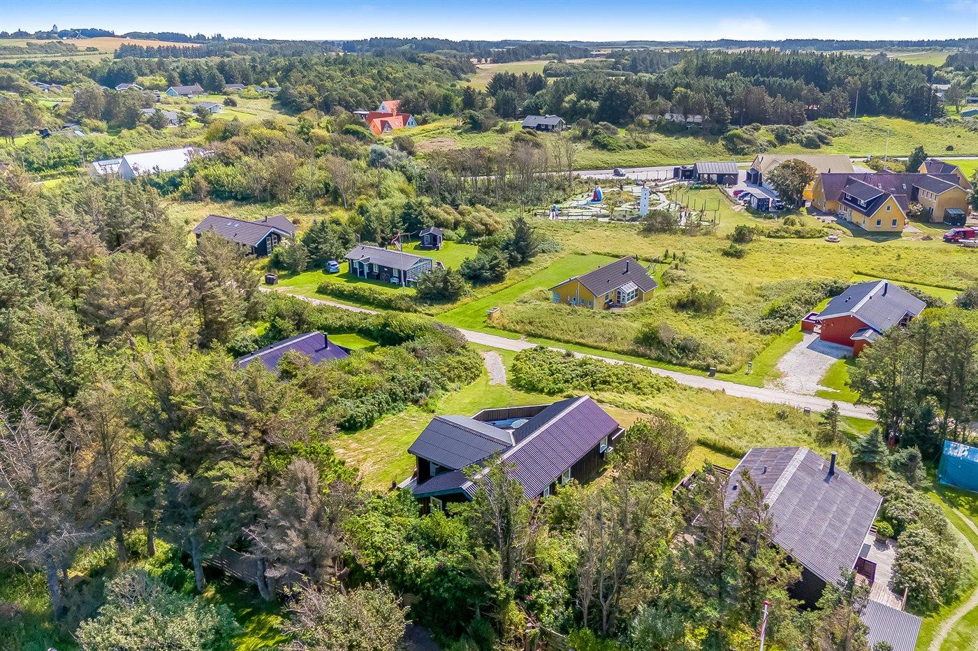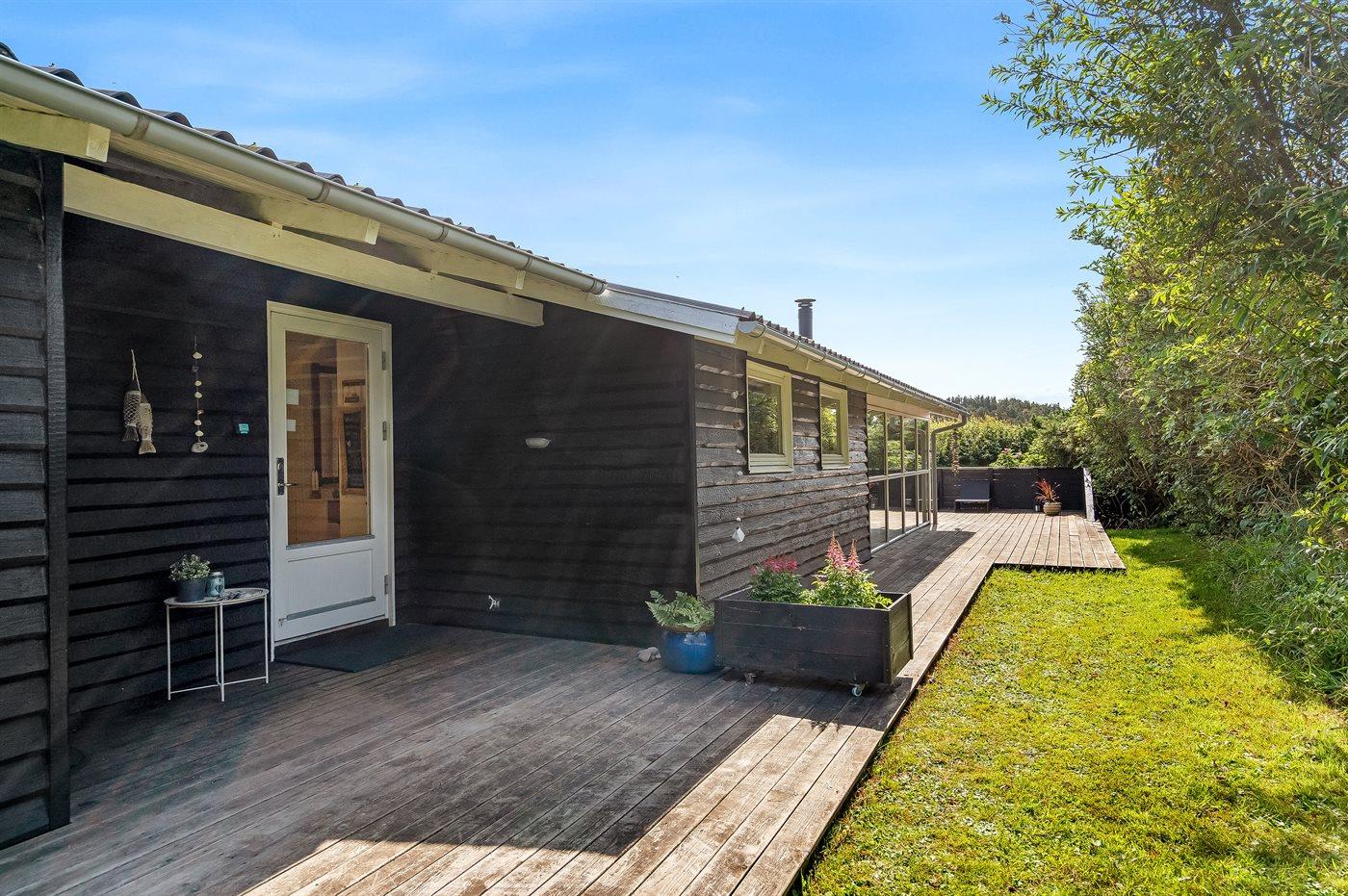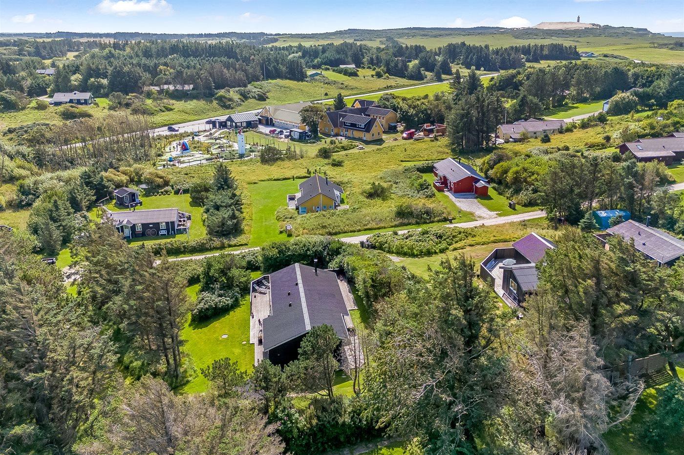Sommerhuset er beliggende på en 1590 m² stor naturgrund. Der er 400 m til havet, samt 800 m til nærmeste trappenedgang til vandet. Nærmeste forretning er beliggende i en afstand af 500 m. Til ferieboligen hører 60 m² åbent terrasseareal. Desuden er der 5 m² overdækket terrasse. Der er redskabsrum. Parkering ved ferieboligen. Der er installeret stik til opladning af elbil med 11 kW ladeeffekt.