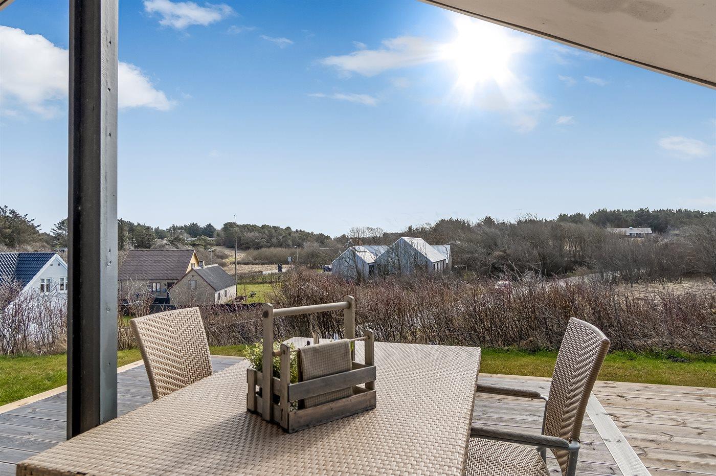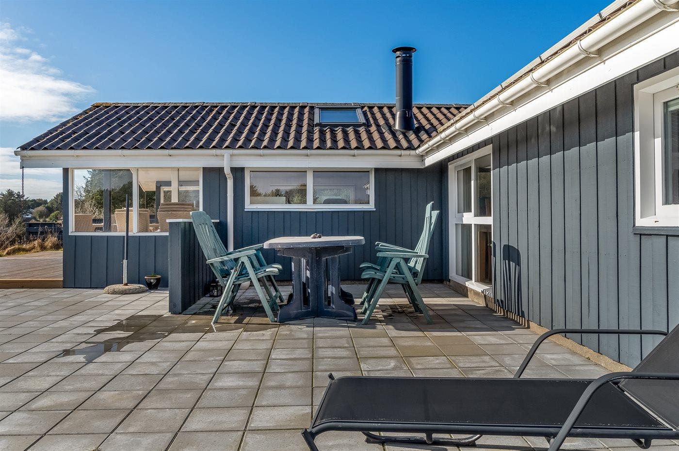 Der er store og gode terrasseforhold og specielt den overdækkede i forlængelse af stuen gør opholdet dejligt. På vestsiden findes bord med vask, hvor den nyfangede fisk kan tilberedes.