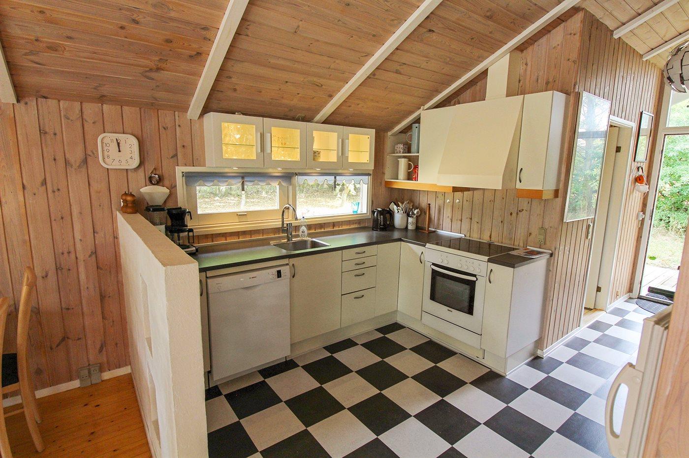 Køkkenet er udstyret med 1 køleskab. Der er 4 keramiske kogeplader, varmluftovn, mikrobølgeovn samt opvaskemaskine.