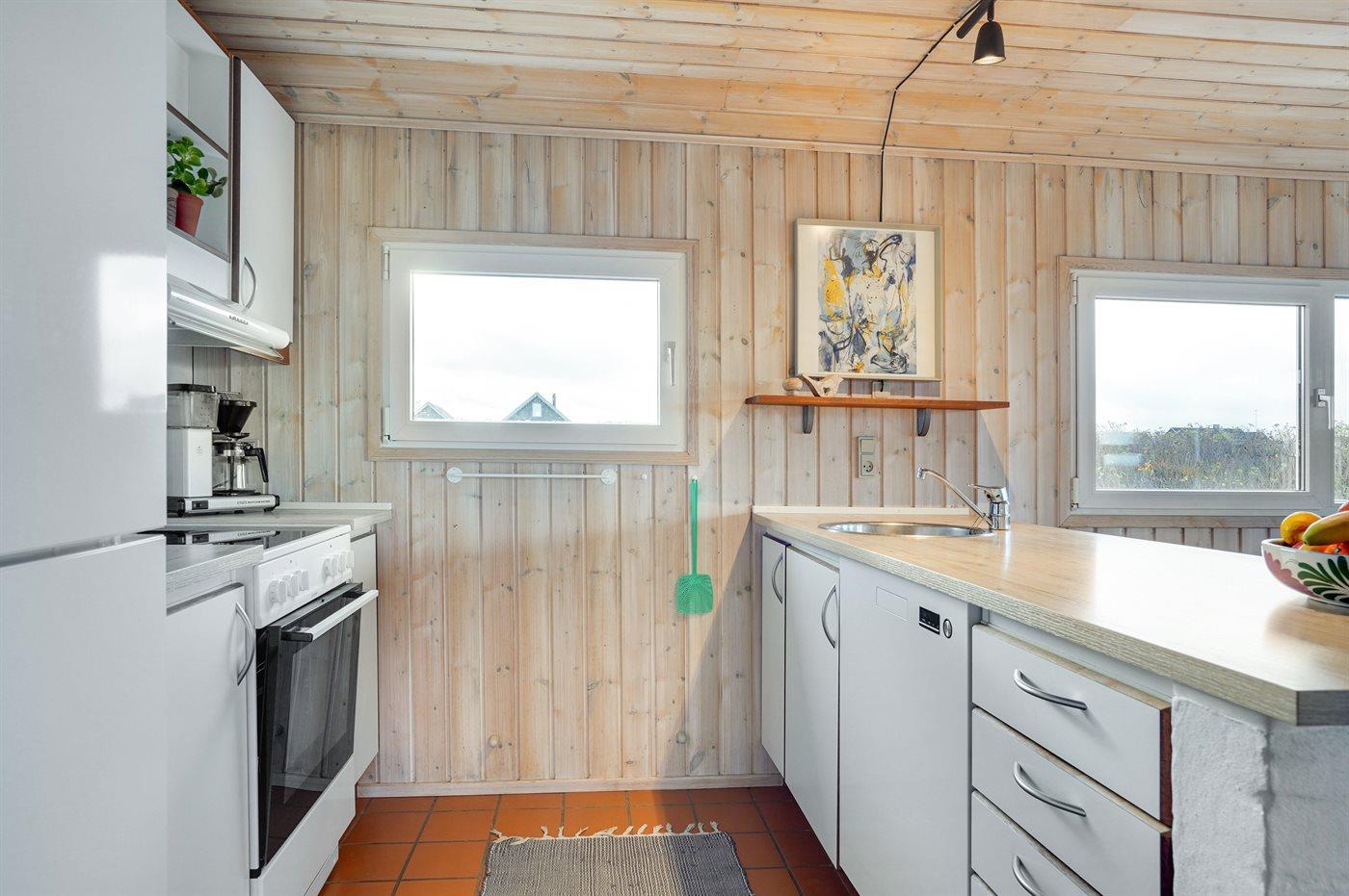 Køkkenet er udstyret med 1 køleskab. Der er 4 keramiske kogeplader, varmluftovn samt opvaskemaskine.