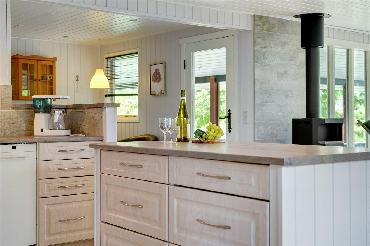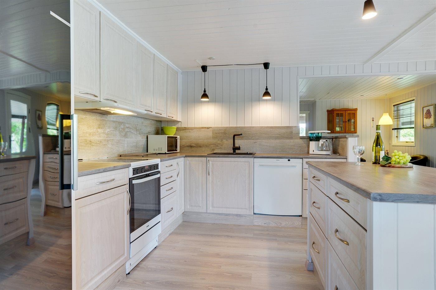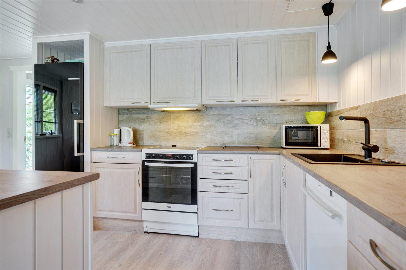 Køkkenet er udstyret med 1 køleskab. Der er 4 keramiske kogeplader, varmluftovn, mikrobølgeovn samt opvaskemaskine.