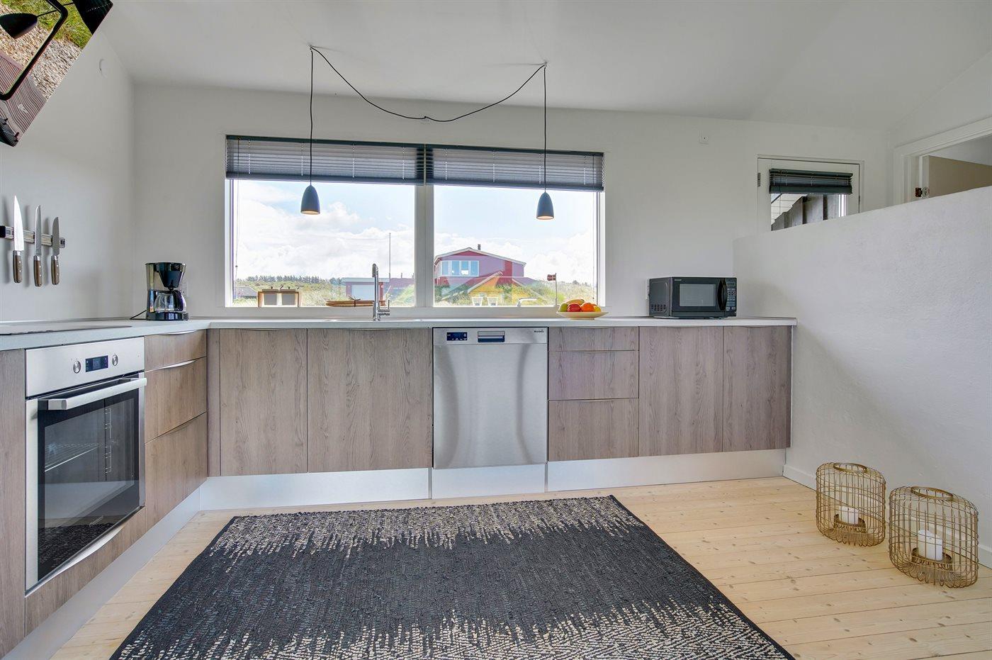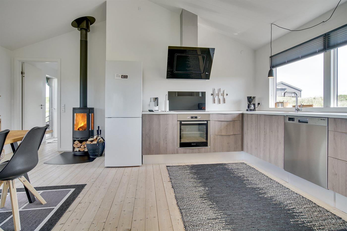 Køkkenet er udstyret med 1 køleskab. Der er 4 keramiske kogeplader, varmluftovn, mikrobølgeovn samt opvaskemaskine.