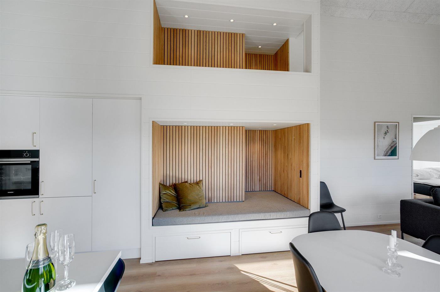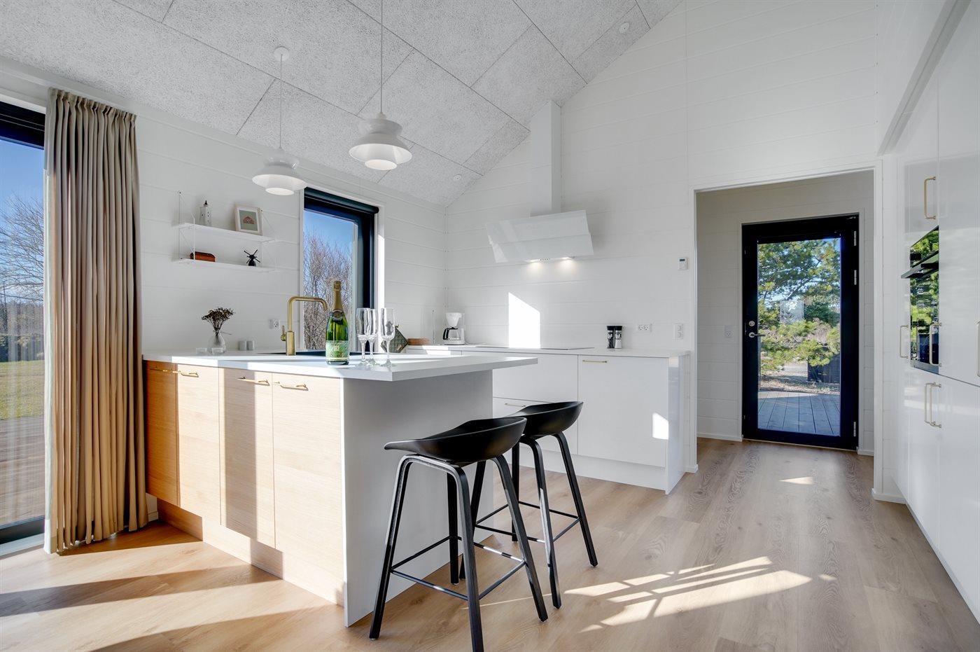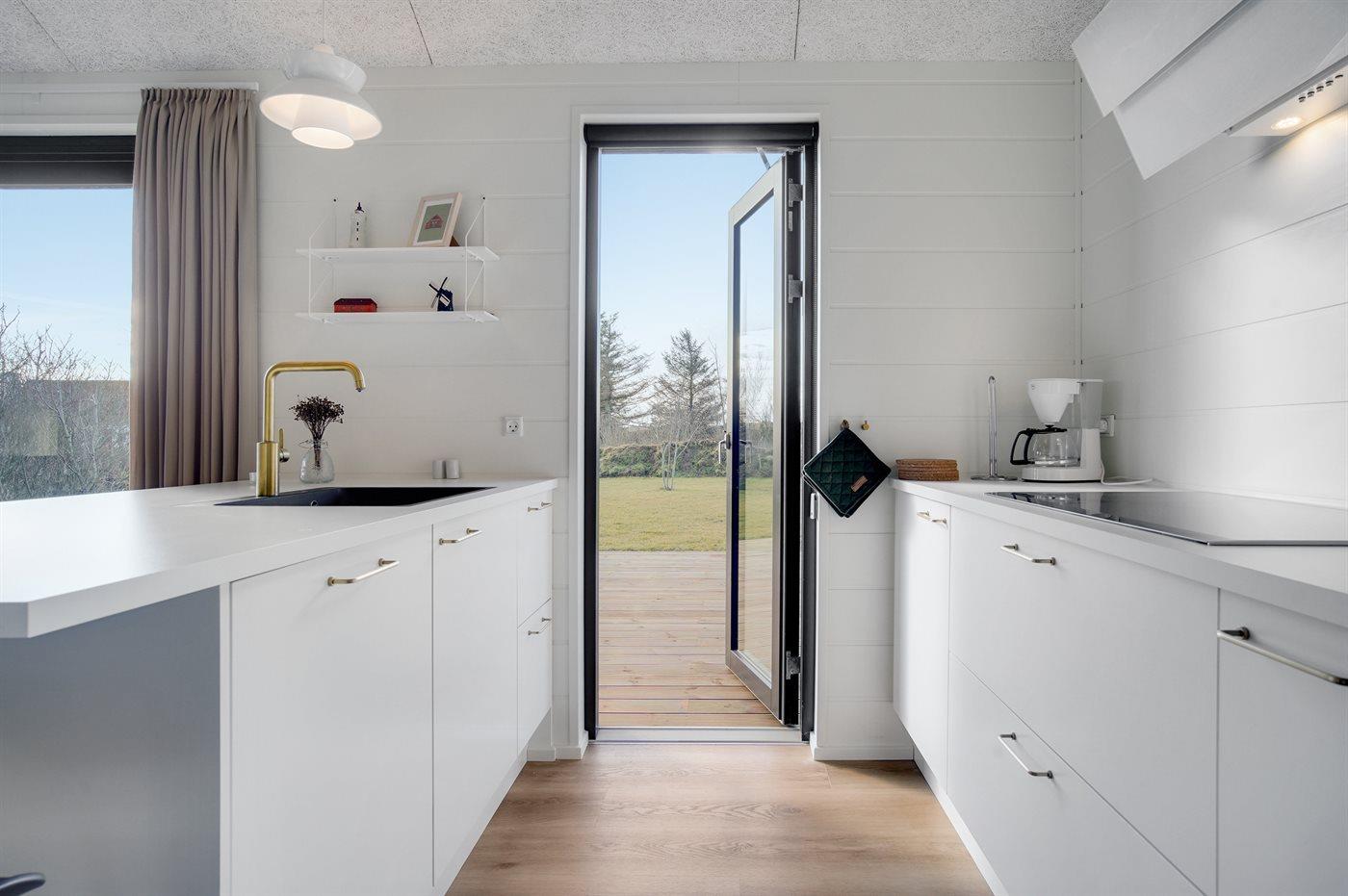 Køkkenet er udstyret med 1 køleskab. Der er 4 induktionskogeplader, varmluftovn, mikrobølgeovn samt opvaskemaskine.