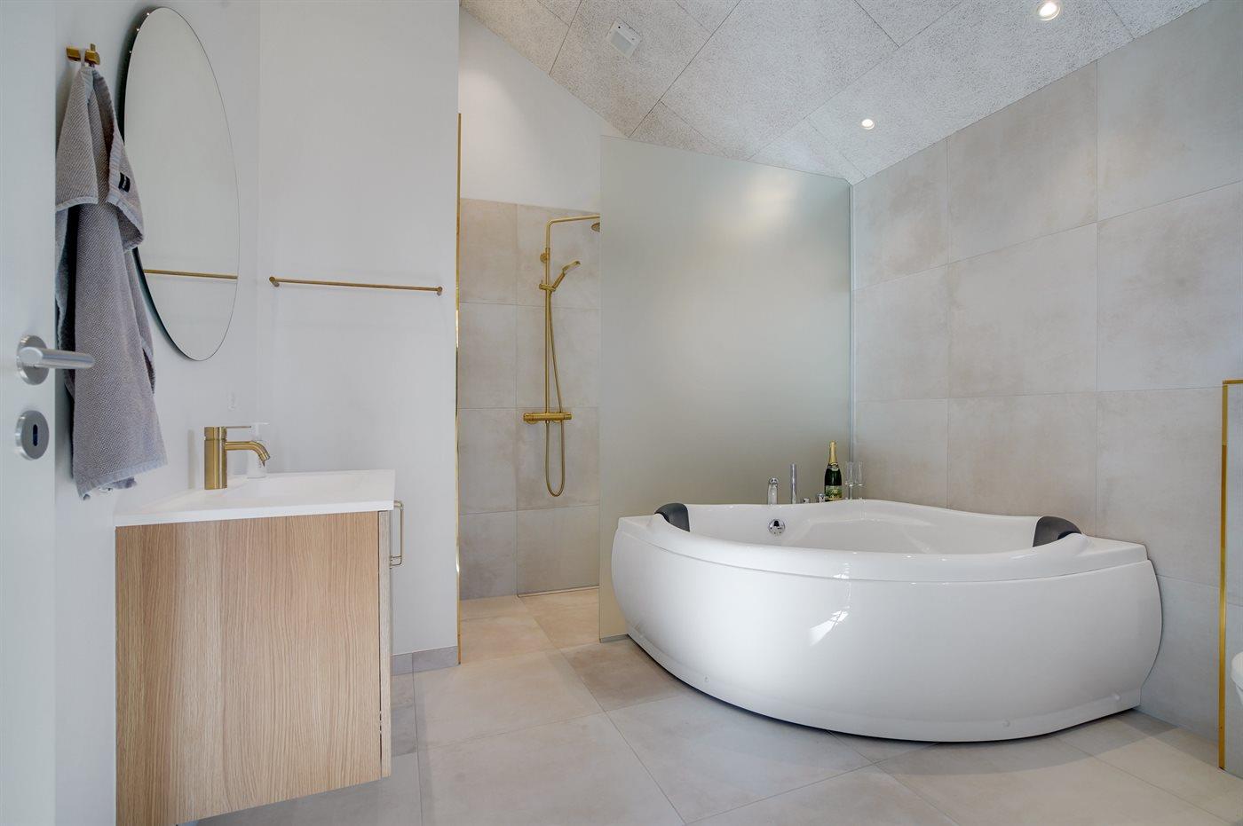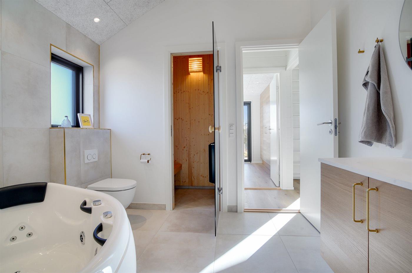 Der er 2 badeværelser med bruseniche og 2 toiletter. Der er gulvvarme på 2 badeværelser. I saunaen er der mulighed for afslapning.