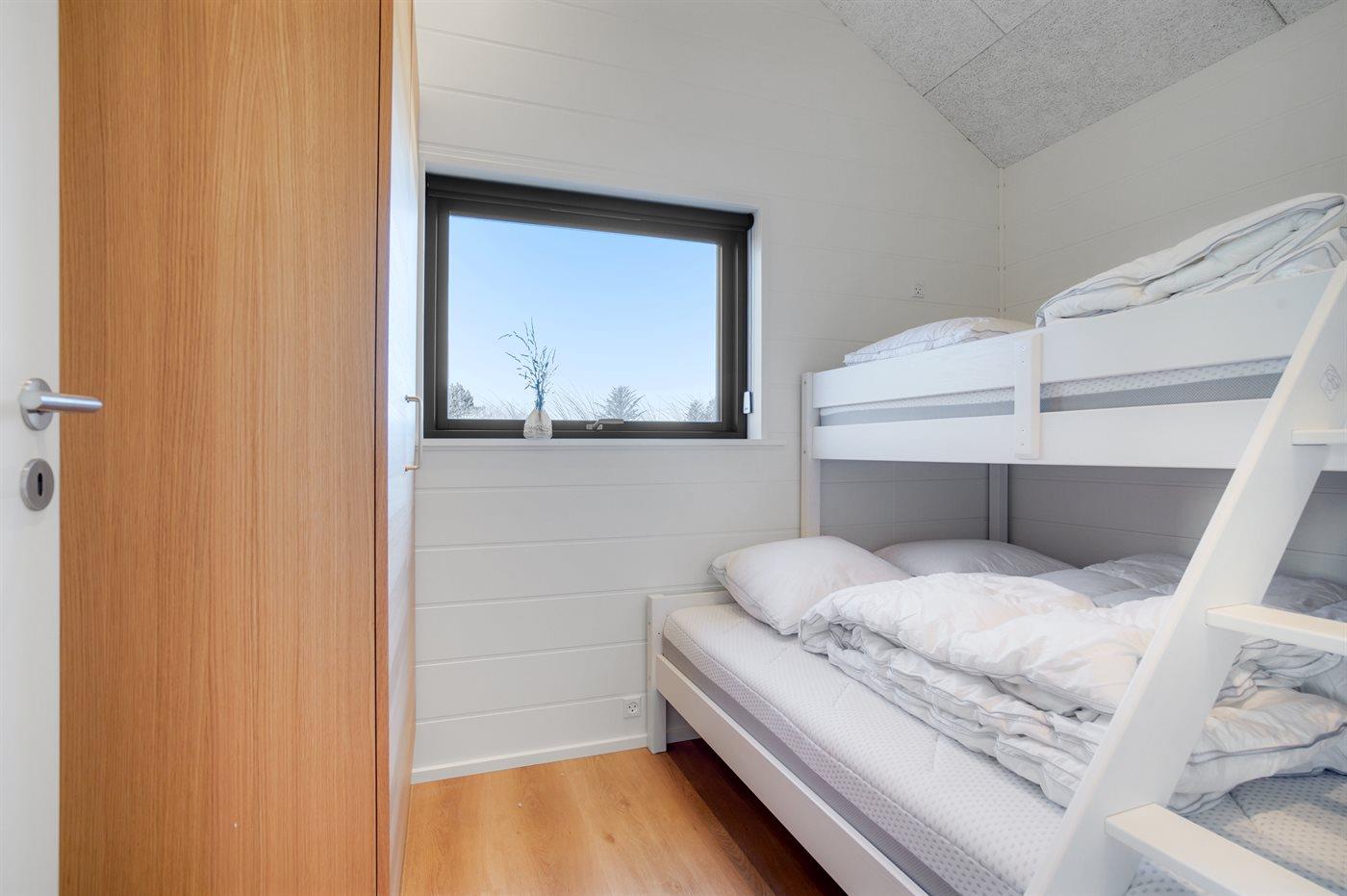Der er i alt 3 soveværelser. Sovepladserne fordeler sig på: 6 sovepladser i dobbeltsenge.1 soveplads i køjeseng. 1 soveplads på madras. Derudover er der 1 stk. barneseng.