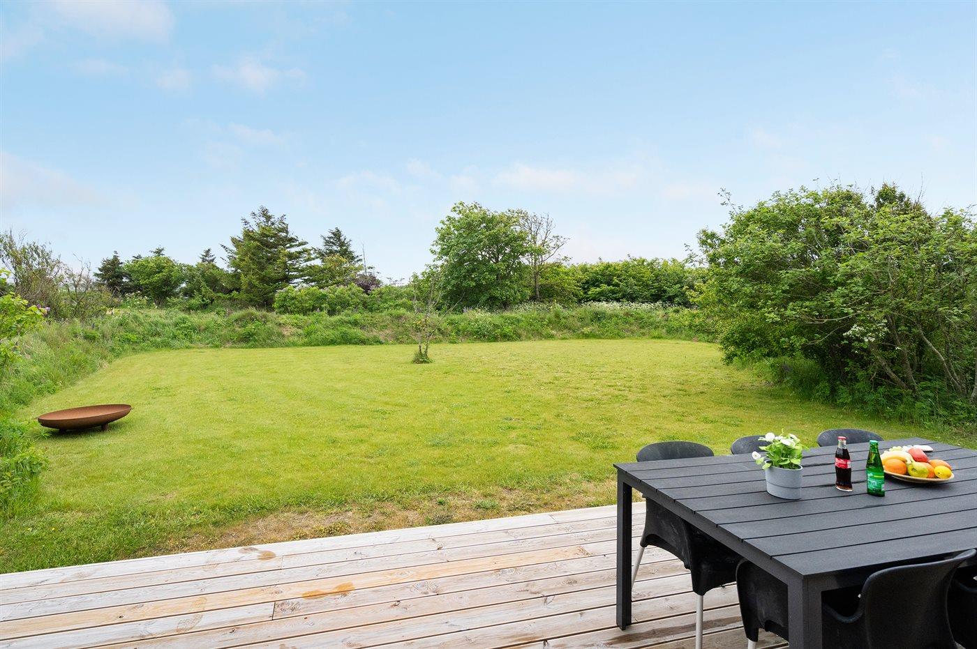 Ferieboligen er beliggende på en 1300 m² stor naturgrund. Der er 1050 m til havet. Nærmeste forretning er beliggende i en afstand af 500 m. Til ferieboligen hører 100 m² terrasseareal. Desuden er der 18 m² overdækket terrasse. Grill til rådighed. Der er installeret stik til opladning af elbil. Parkering ved ferieboligen.