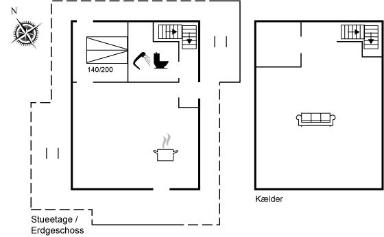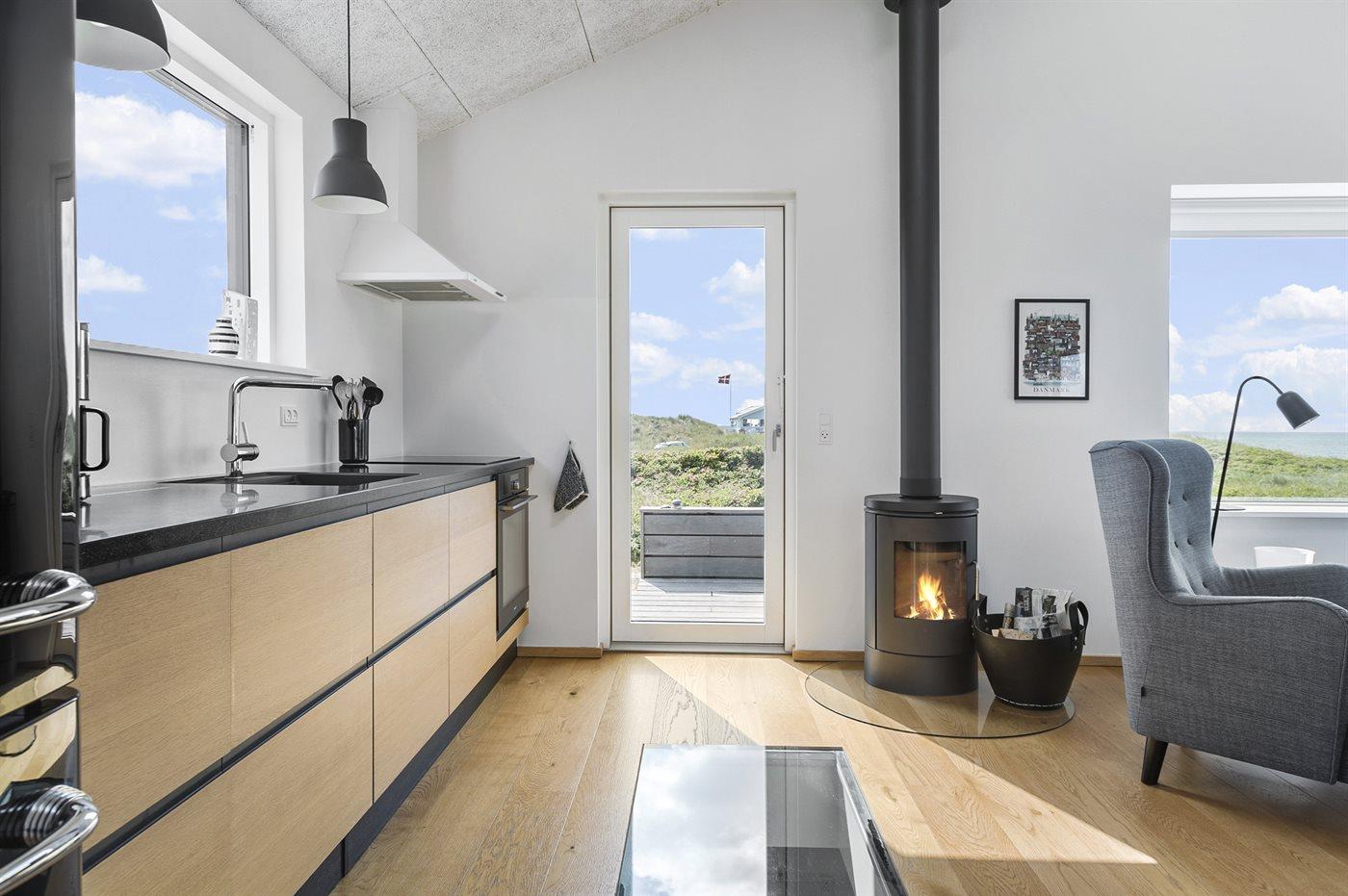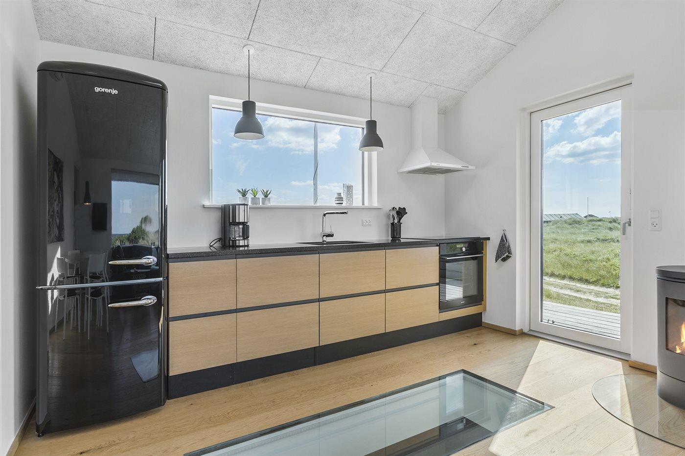 Køkkenet er udstyret med 1 køleskab. Der er 4 induktionskogeplader, varmluftovn samt opvaskemaskine.