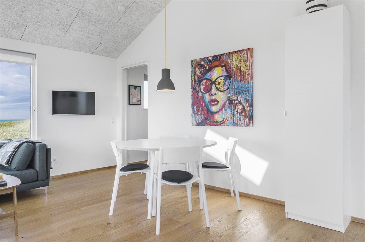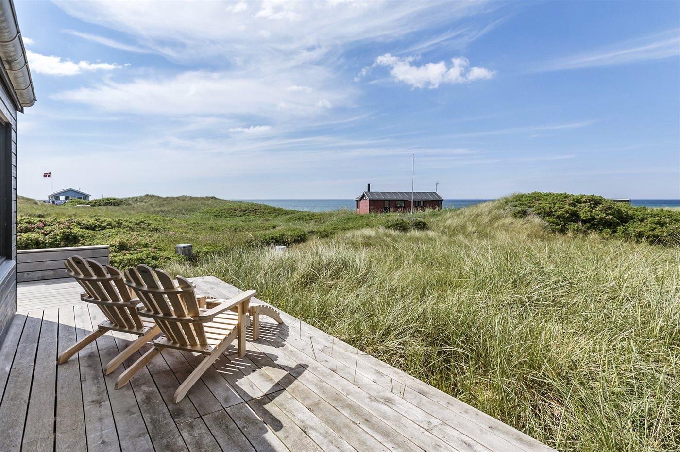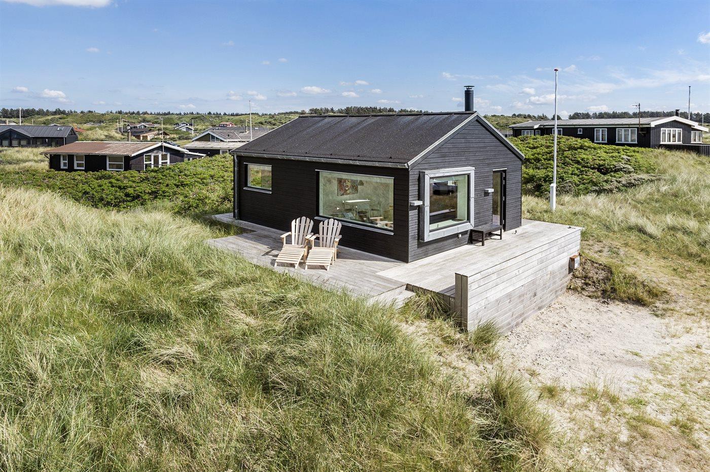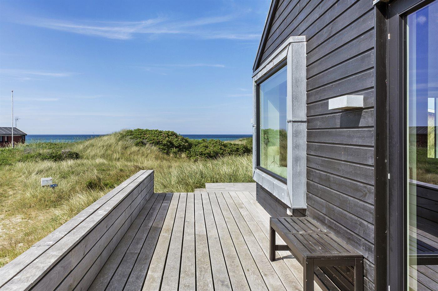 Et velbeliggende, moderne sommerhus med og spændende detaljer og ikke mindst flot havudsigt fra såvel hus som grund. Vesterhavet og naturen kommer helt tæt på, når man sidder i stuen eller på terrassen og kigger direkte ud på stranden og vandet med lyden af bølgerne fra havet.