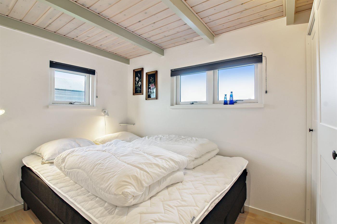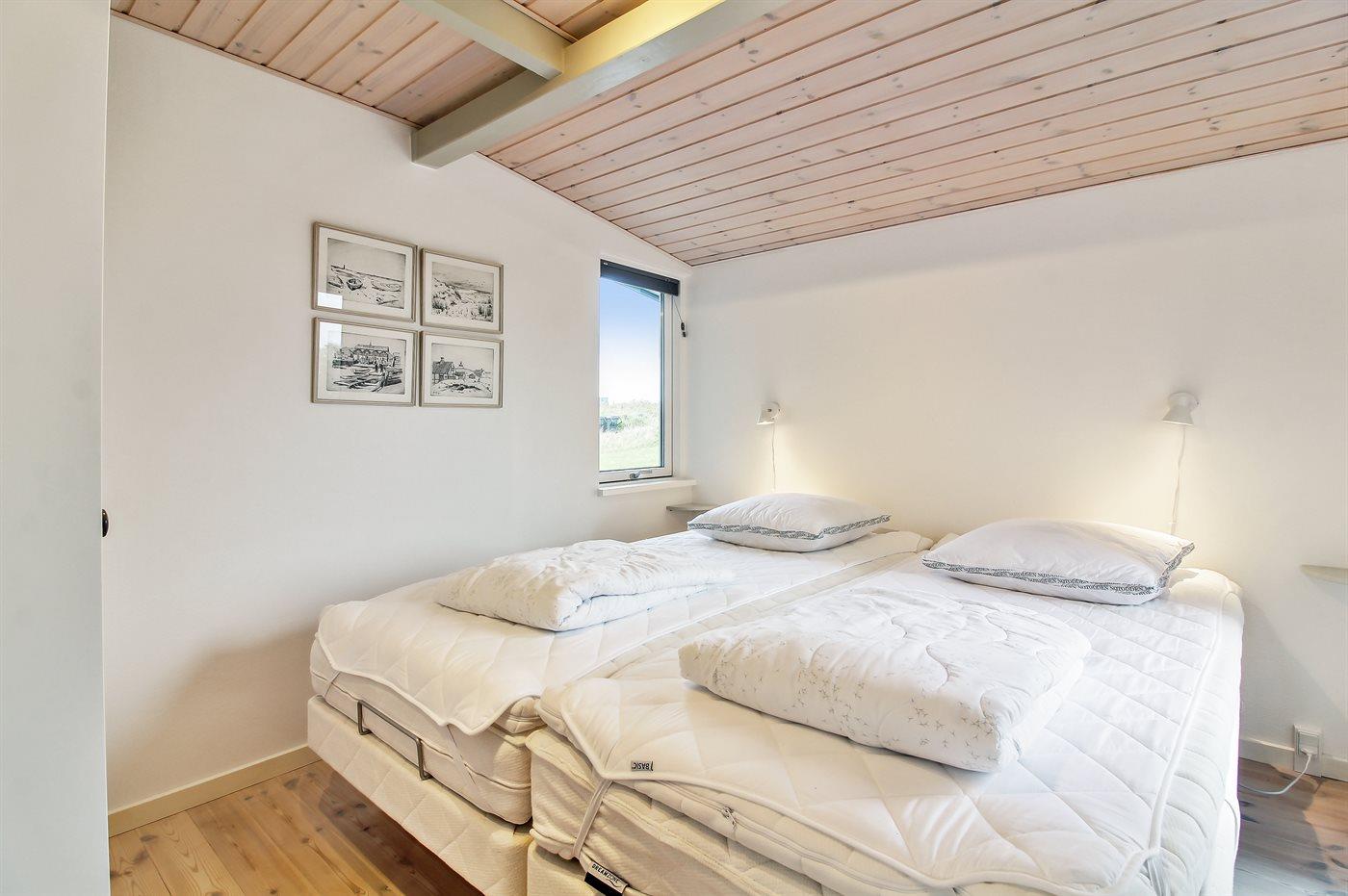 Der er i alt 3 soveværelser. Sovepladserne fordeler sig på: 2 sovepladser i dobbeltseng. 2 sovepladser i køjeseng.2 sovepladser i elevationssenge. Derudover er der 1 stk. barneseng.