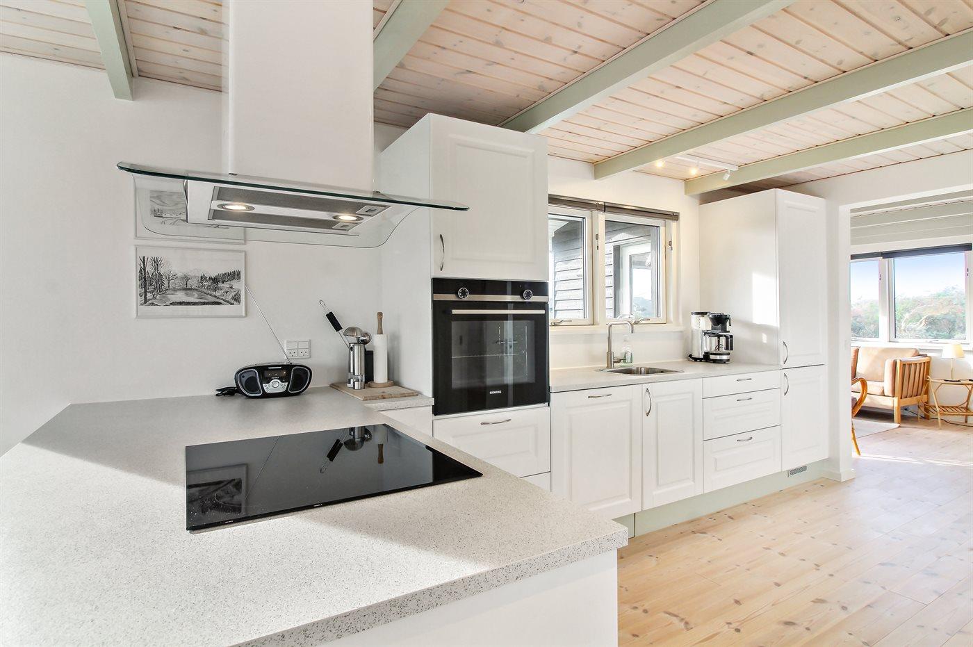 Køkkenet er udstyret med 1 køleskab. Der er 4 induktionskogeplader, varmluftovn, mikrobølgeovn samt opvaskemaskine.