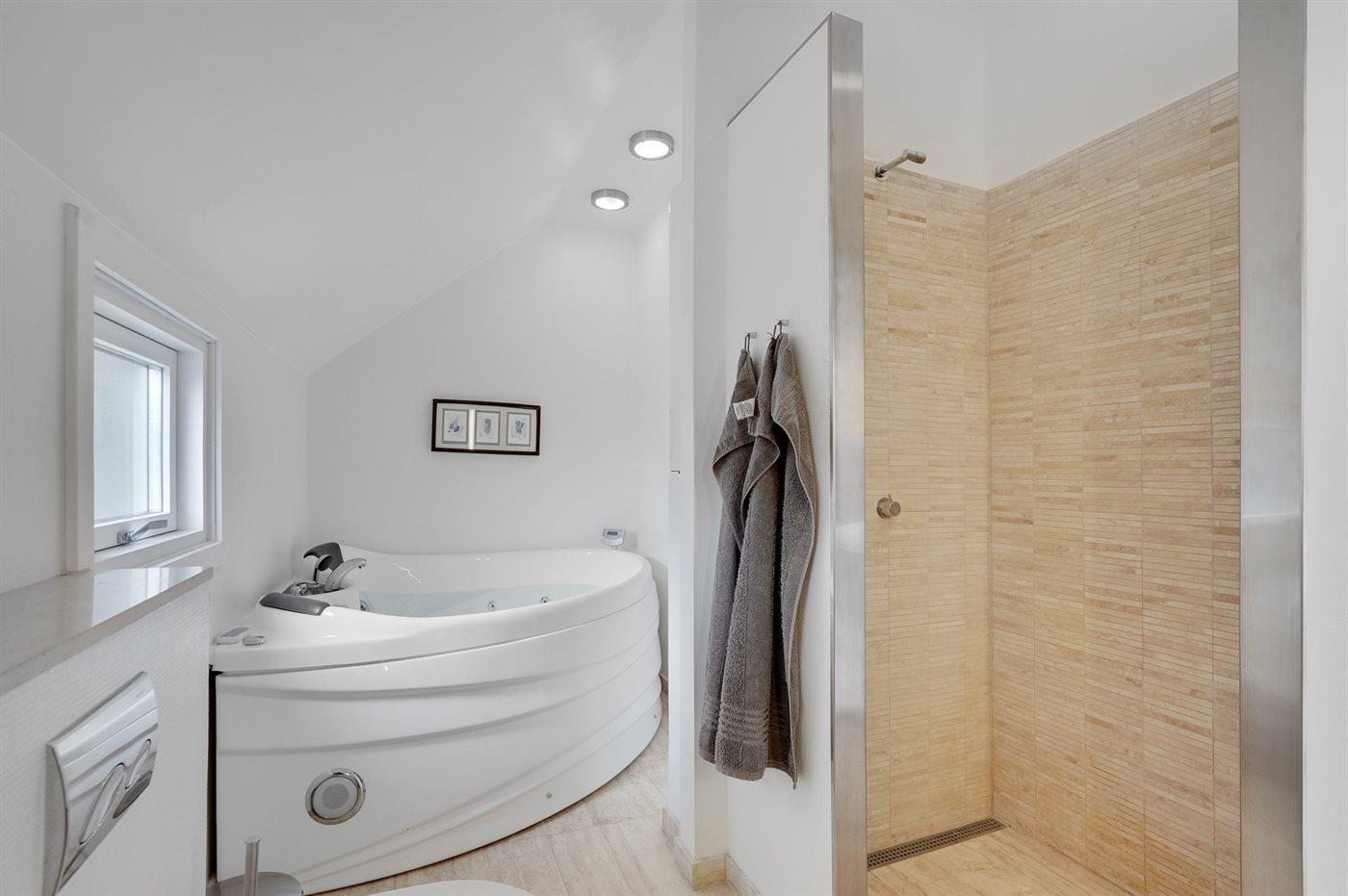 Der er 2 badeværelser med bruseniche og 2 toiletter. Der er gulvvarme på 2 badeværelser.