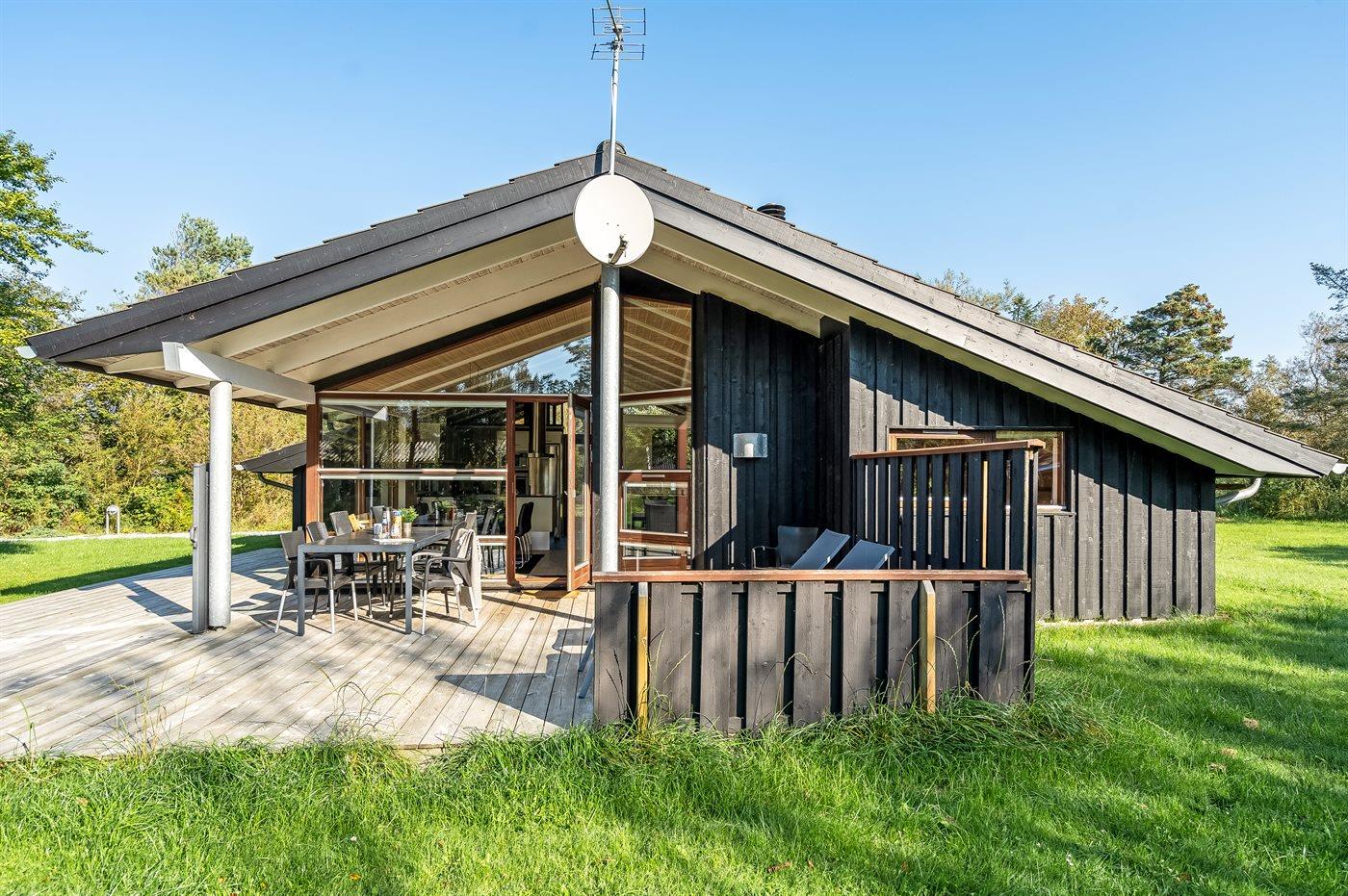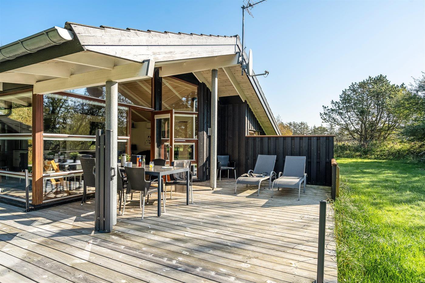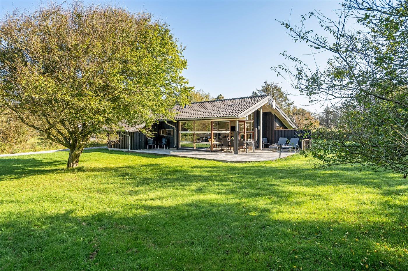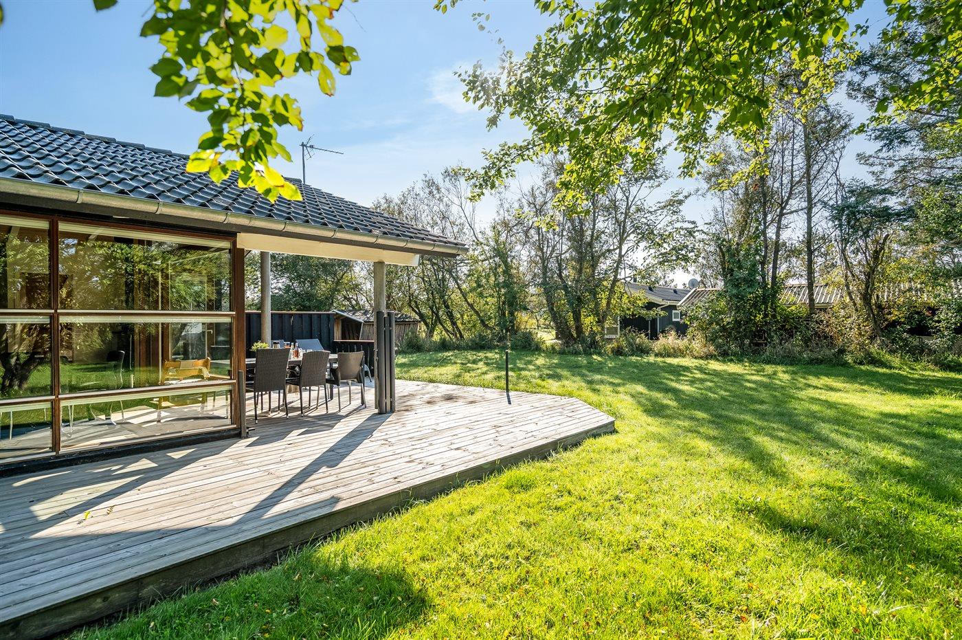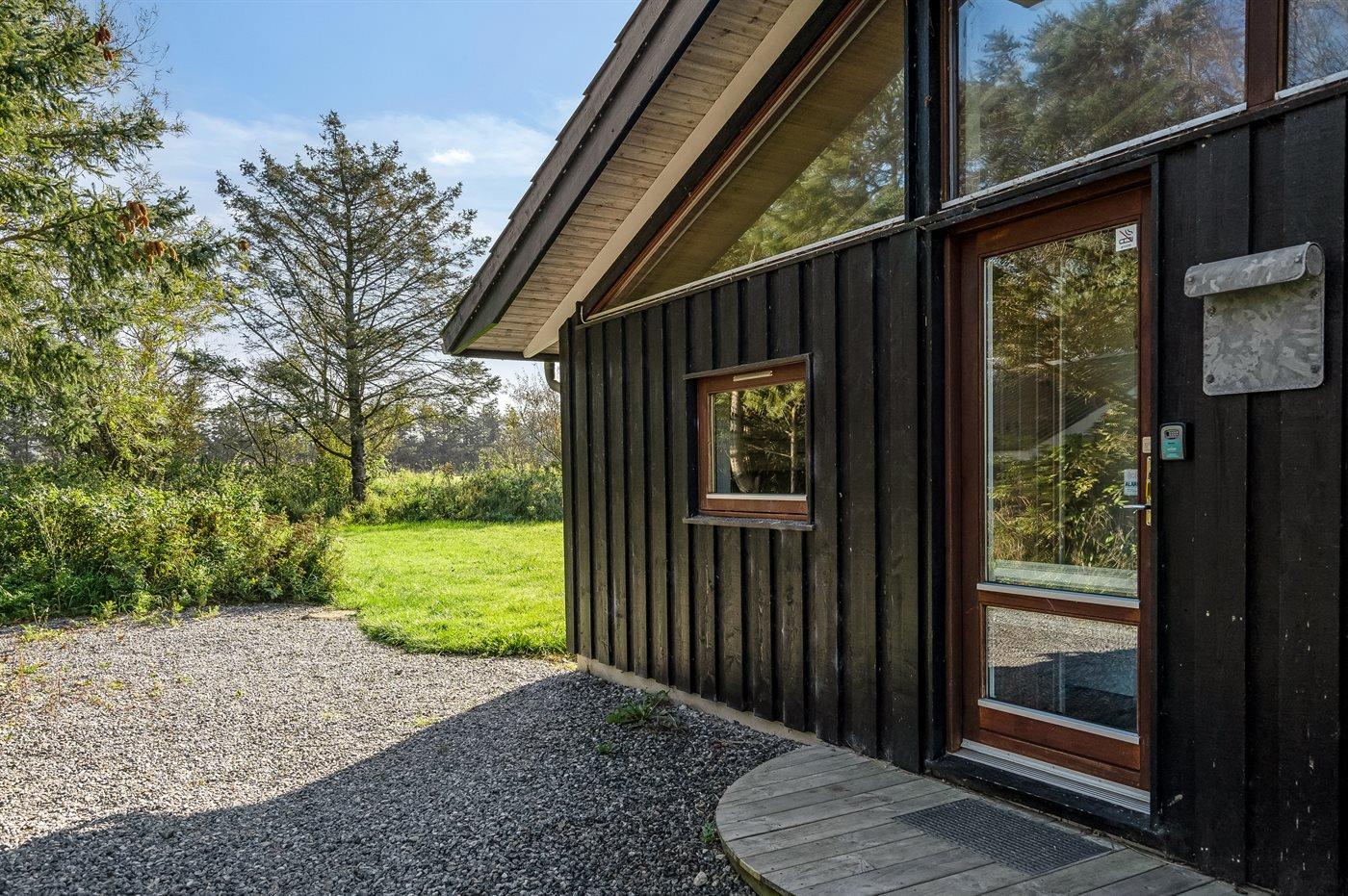 Ferieboligen er beliggende på en 1383 m² stor naturgrund. Der er 1330 m til havet. Nærmeste forretning er beliggende i en afstand af 500 m. Til ferieboligen hører åbent terrasseareal. Desuden er der overdækket terrasse. Der er redskabsrum (6 m2). Shelter (soveareal 320x210 cm, overdækket areal 320x330 cm). Grill til rådighed. Der er installeret stik til opladning af elbil. Type 2 stik. Med 11 kW ladeeffekt. Parkering ved ferieboligen.