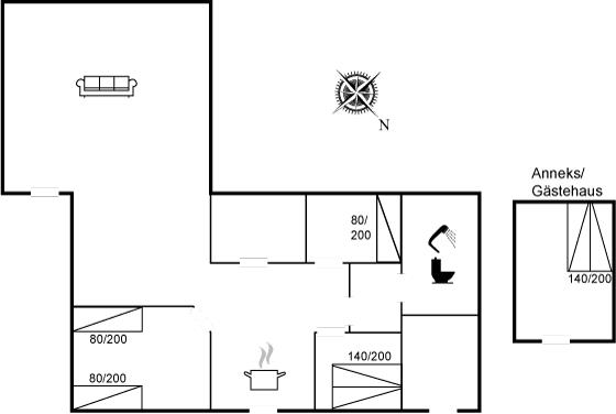 Der er i alt 2 soveværelser. Sovepladserne fordeler sig på: 4 sovepladser i dobbeltsenge. 3 sovepladser i enkeltsenge. 2 af disse sovepladser befinder sig i et anneks. Derudover er der 1 stk. barneseng.