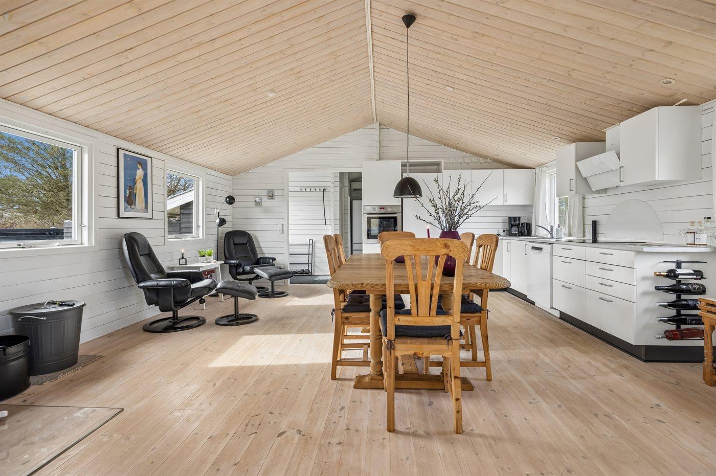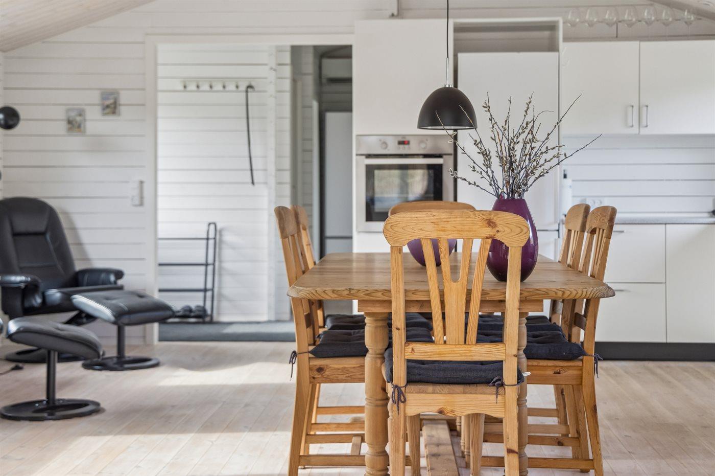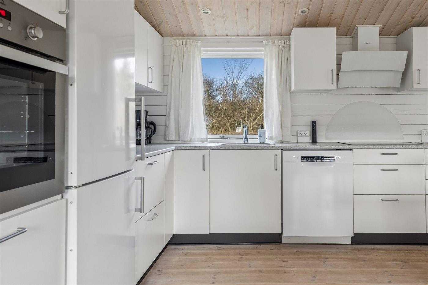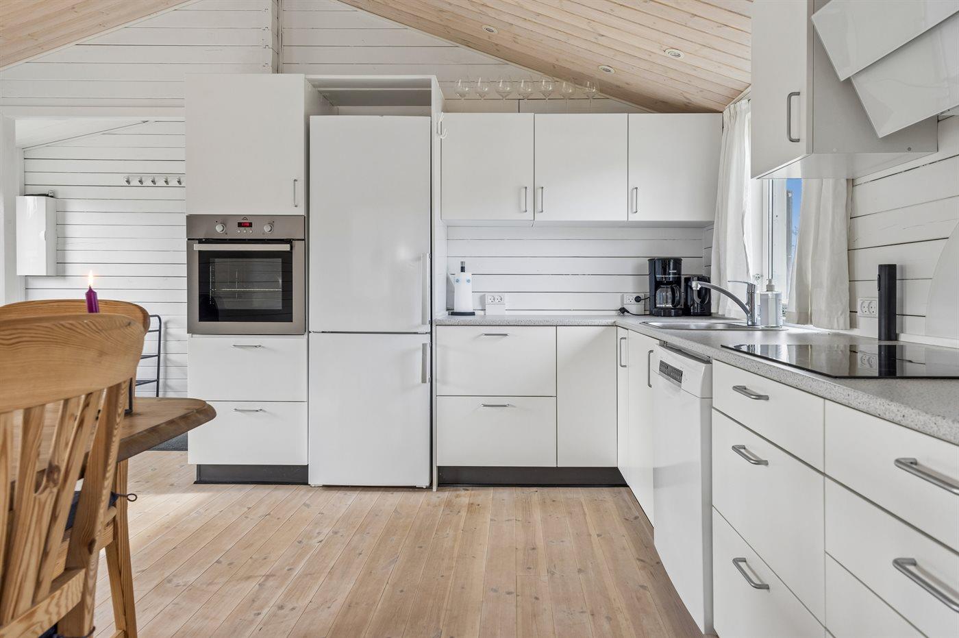 Køkkenet er udstyret med 1 køleskab. Der er 4 induktionskogeplader, varmluftovn, mikrobølgeovn samt opvaskemaskine.