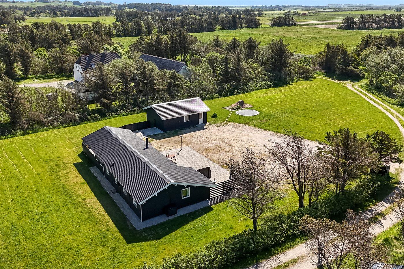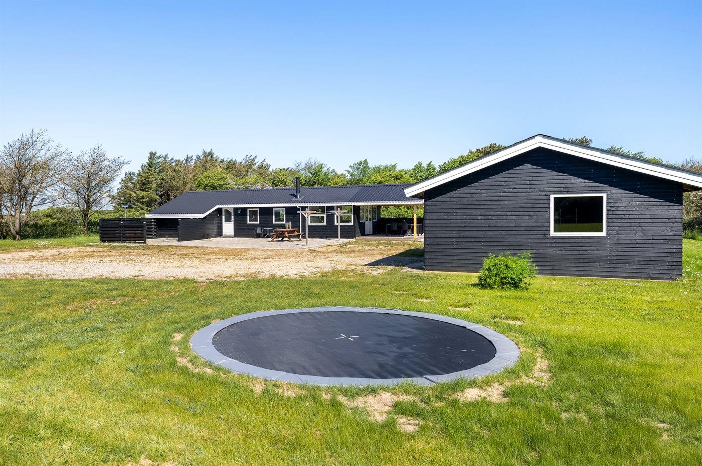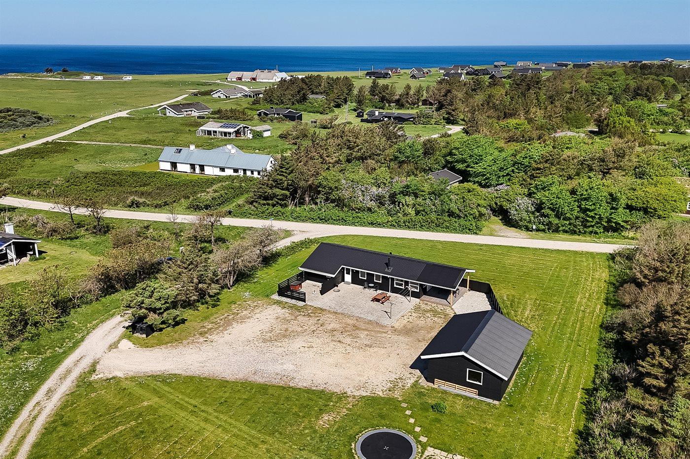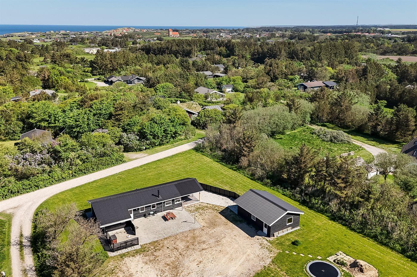 Ferieboligen er beliggende på en 2500 m² stor naturgrund. Der er 500 m til havet. Nærmeste forretning er beliggende i en afstand af 900 m. Til ferieboligen hører delvist lukket terrasse. Der er redskabsrum. Trampolin. Grill til rådighed. Der er installeret stik til opladning af elbil. Med 9 kW ladeeffekt. Parkering ved ferieboligen.