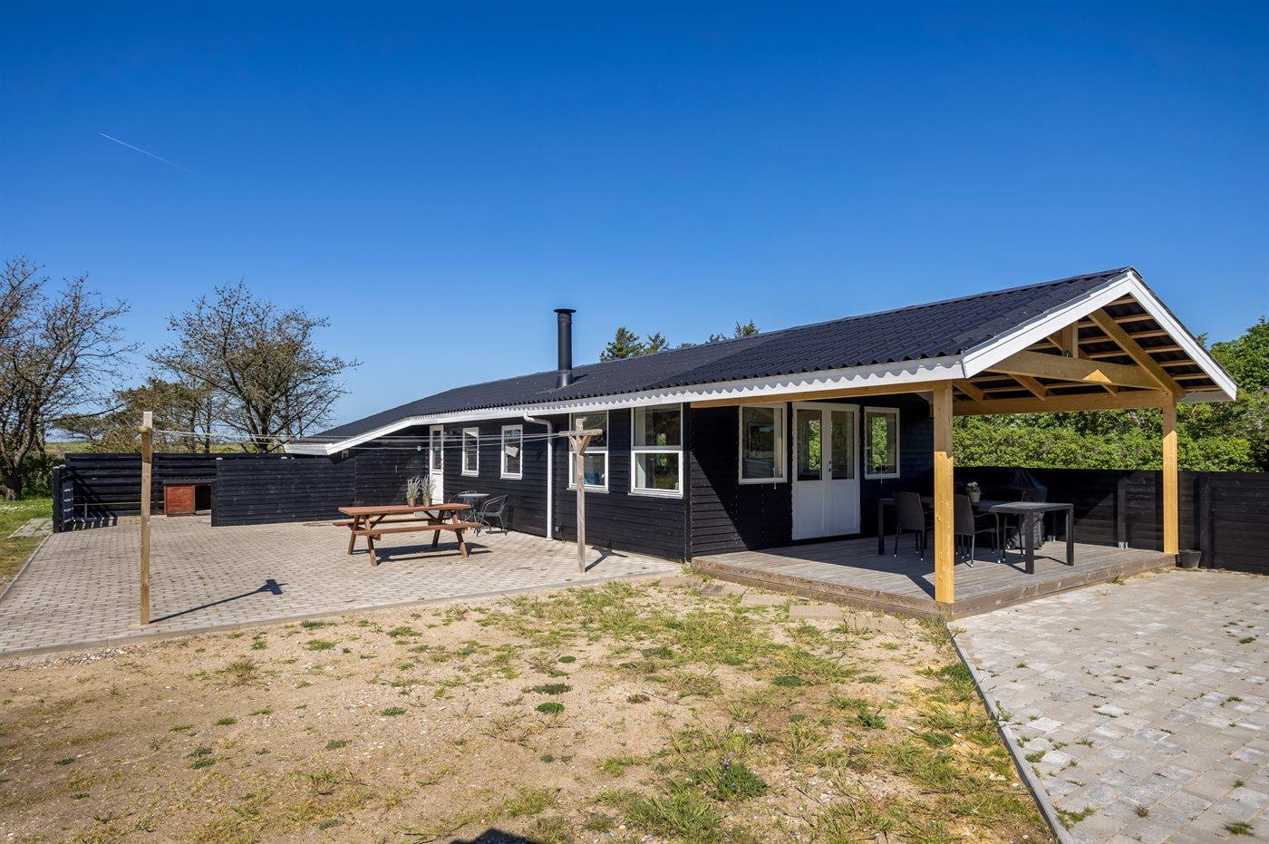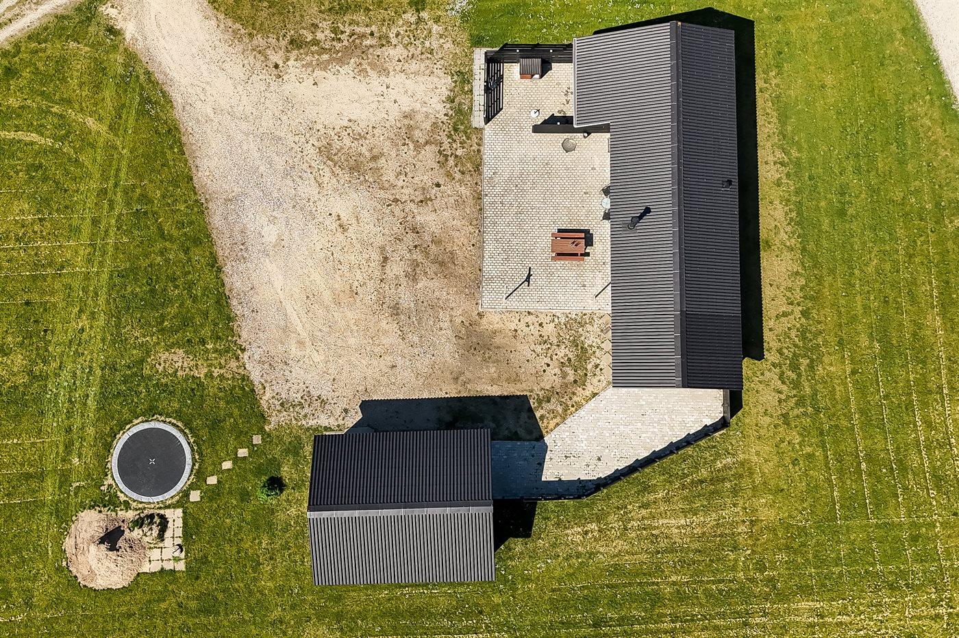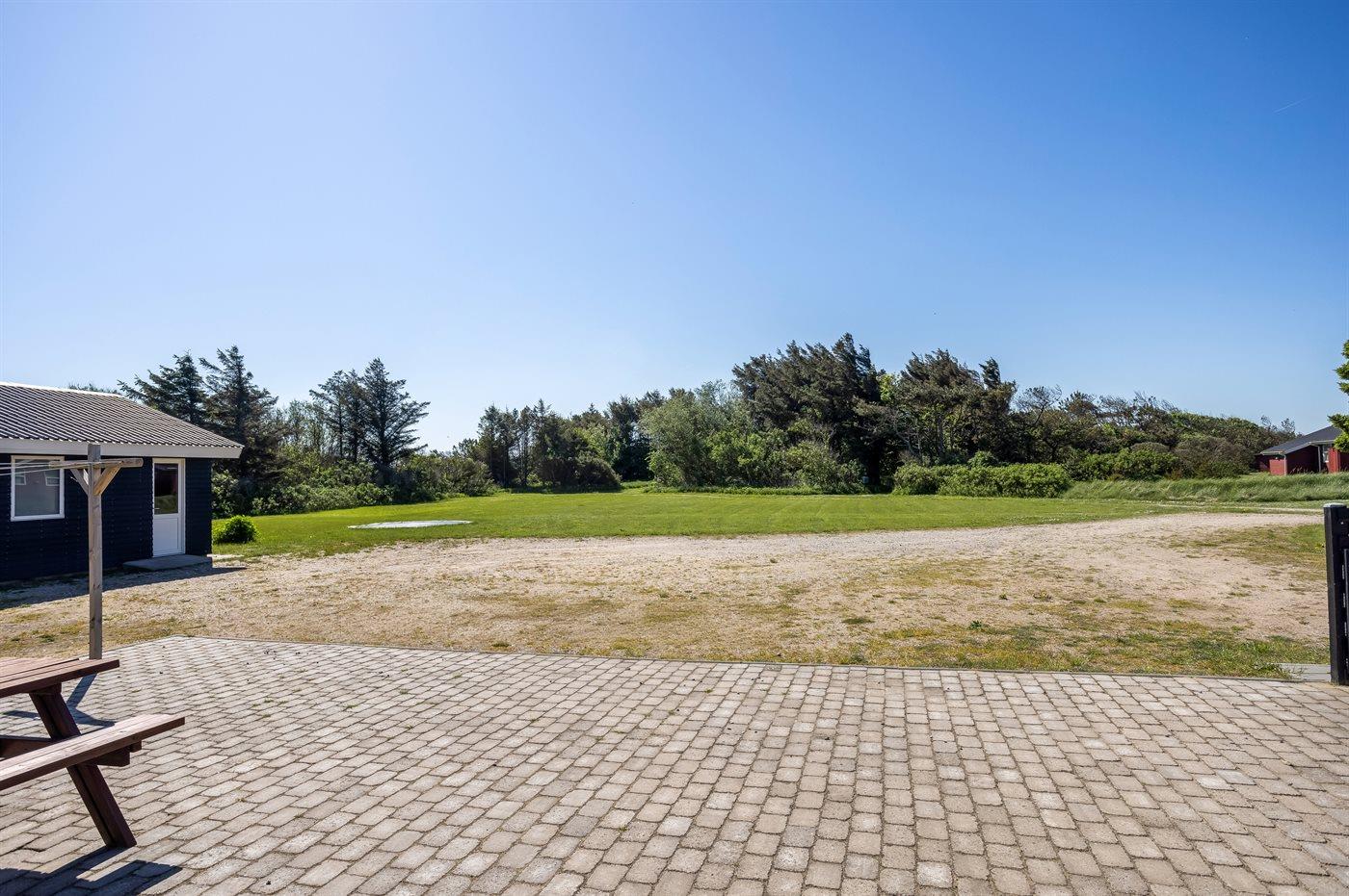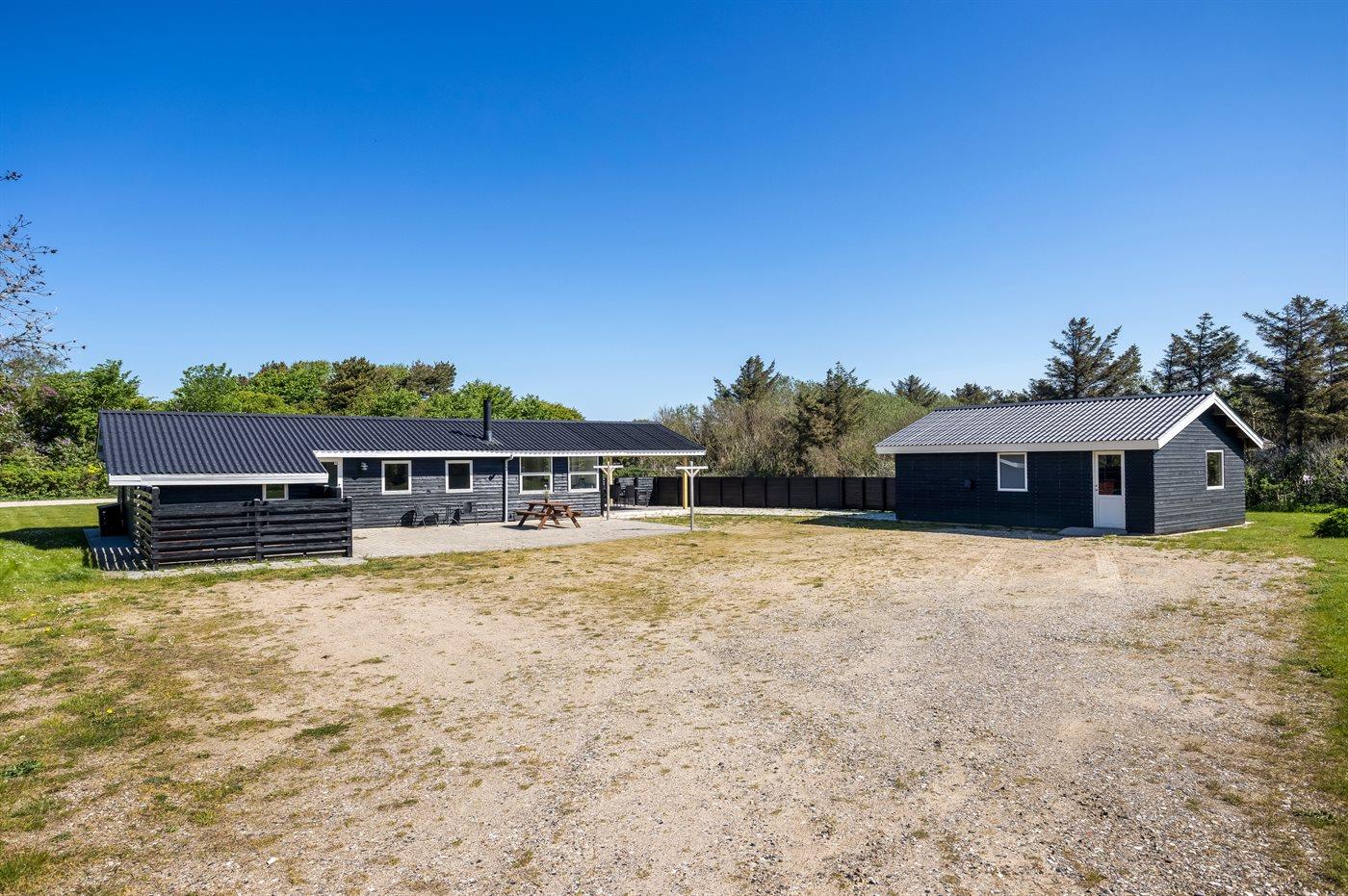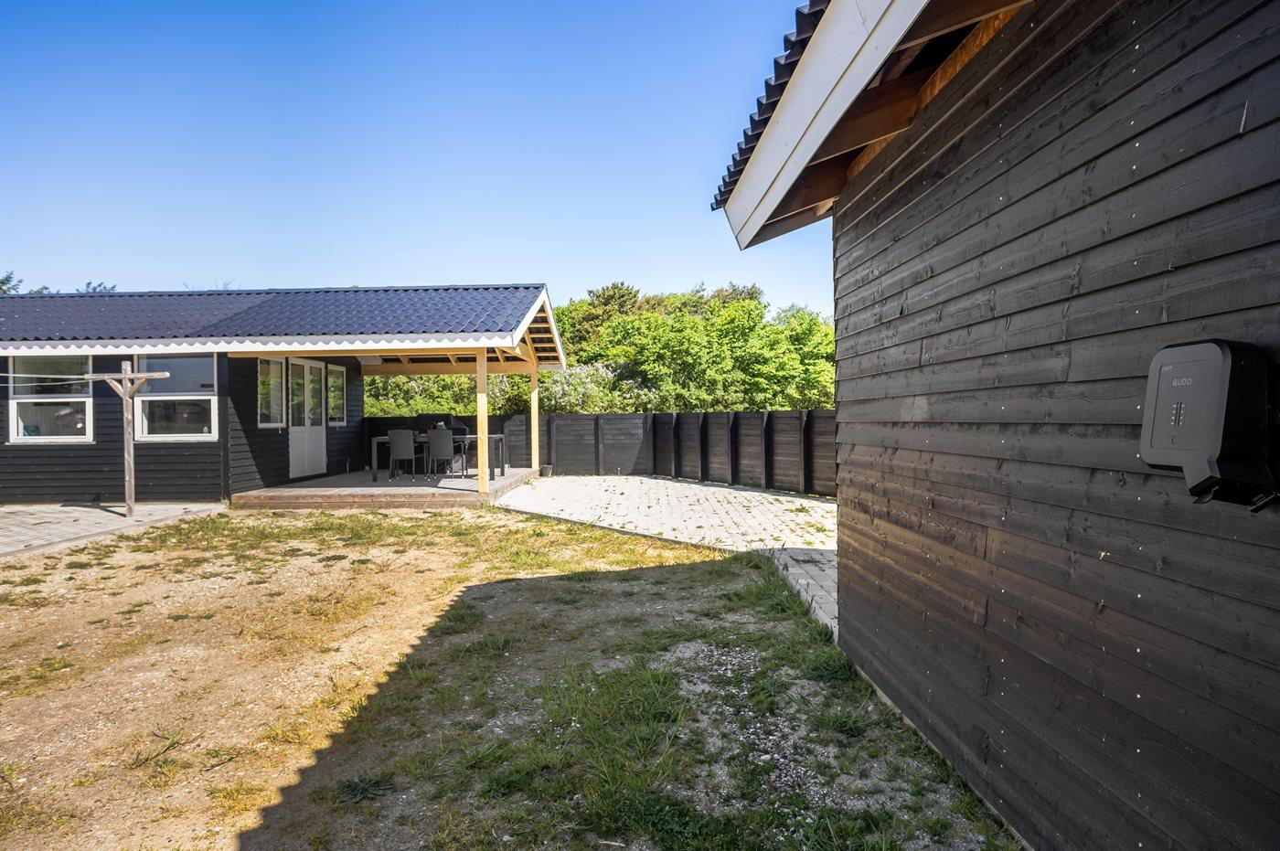 Ferieboligen er beliggende på en 2500 m² stor naturgrund. Der er 500 m til havet. Nærmeste forretning er beliggende i en afstand af 900 m. Til ferieboligen hører delvist lukket terrasse. Der er redskabsrum. Trampolin. Grill til rådighed. Der er installeret stik til opladning af elbil. Med 9 kW ladeeffekt. Parkering ved ferieboligen.