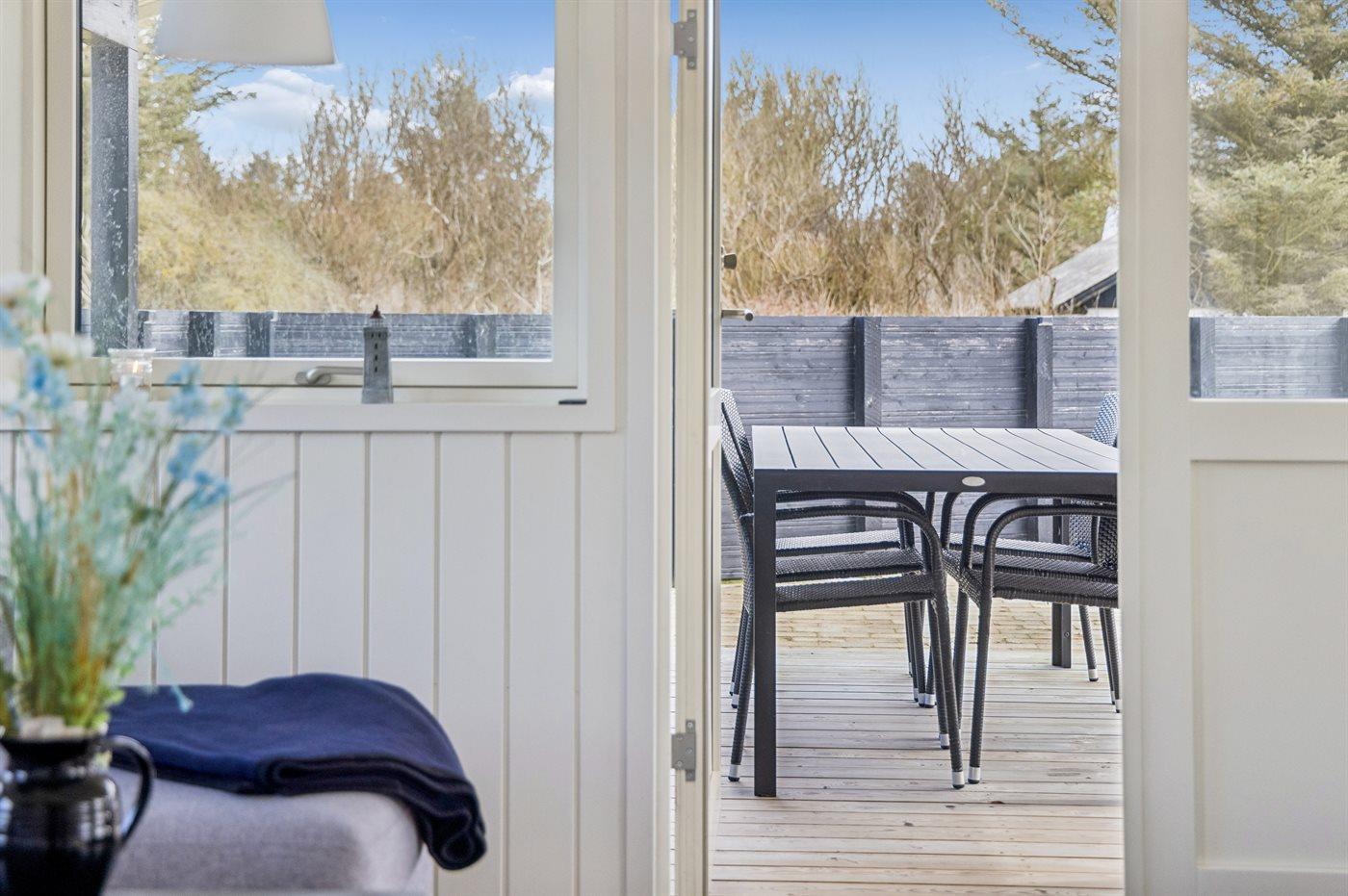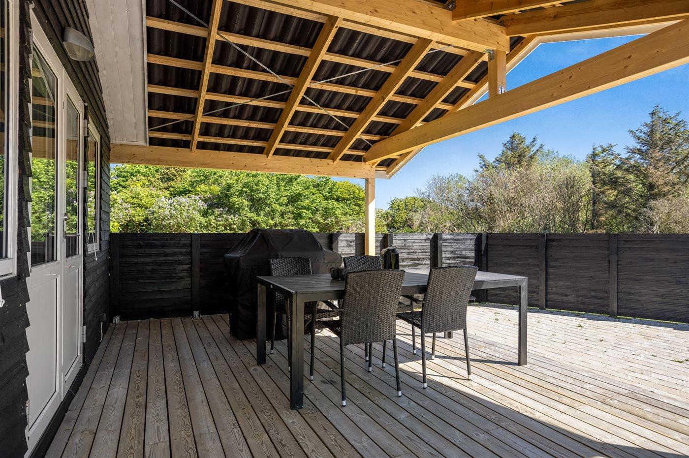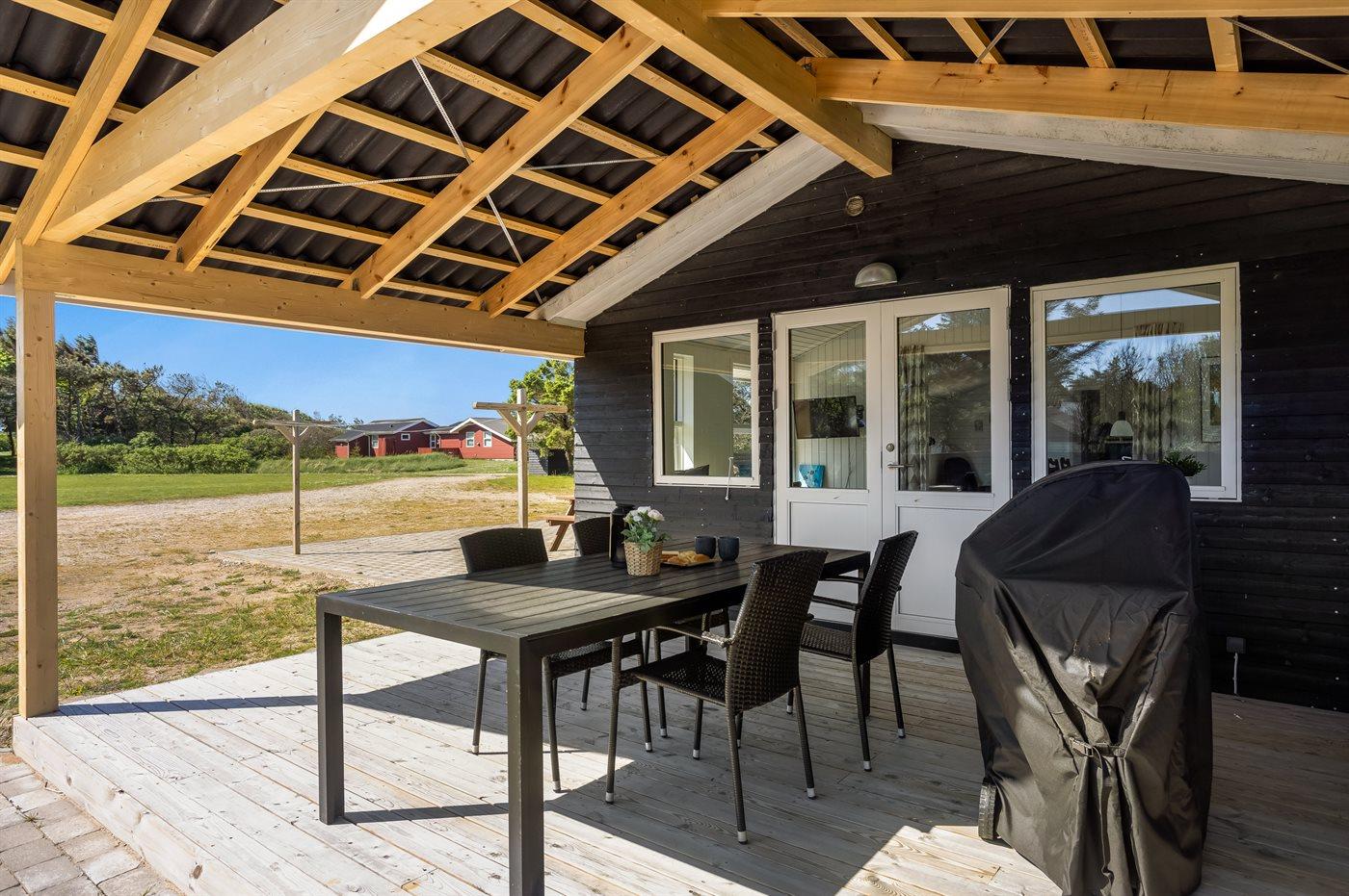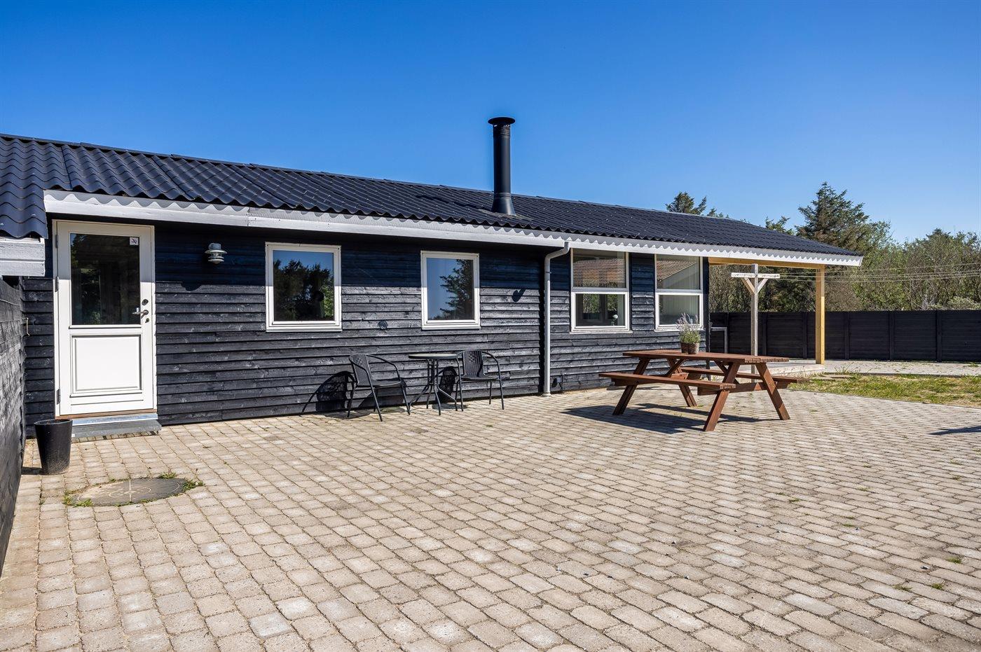 Ferieboligen er beliggende på en 2500 m² stor naturgrund. Der er 500 m til havet. Nærmeste forretning er beliggende i en afstand af 900 m. Til ferieboligen hører delvist lukket terrasse. Der er redskabsrum. Trampolin. Grill til rådighed. Der er installeret stik til opladning af elbil. Med 9 kW ladeeffekt. Parkering ved ferieboligen.