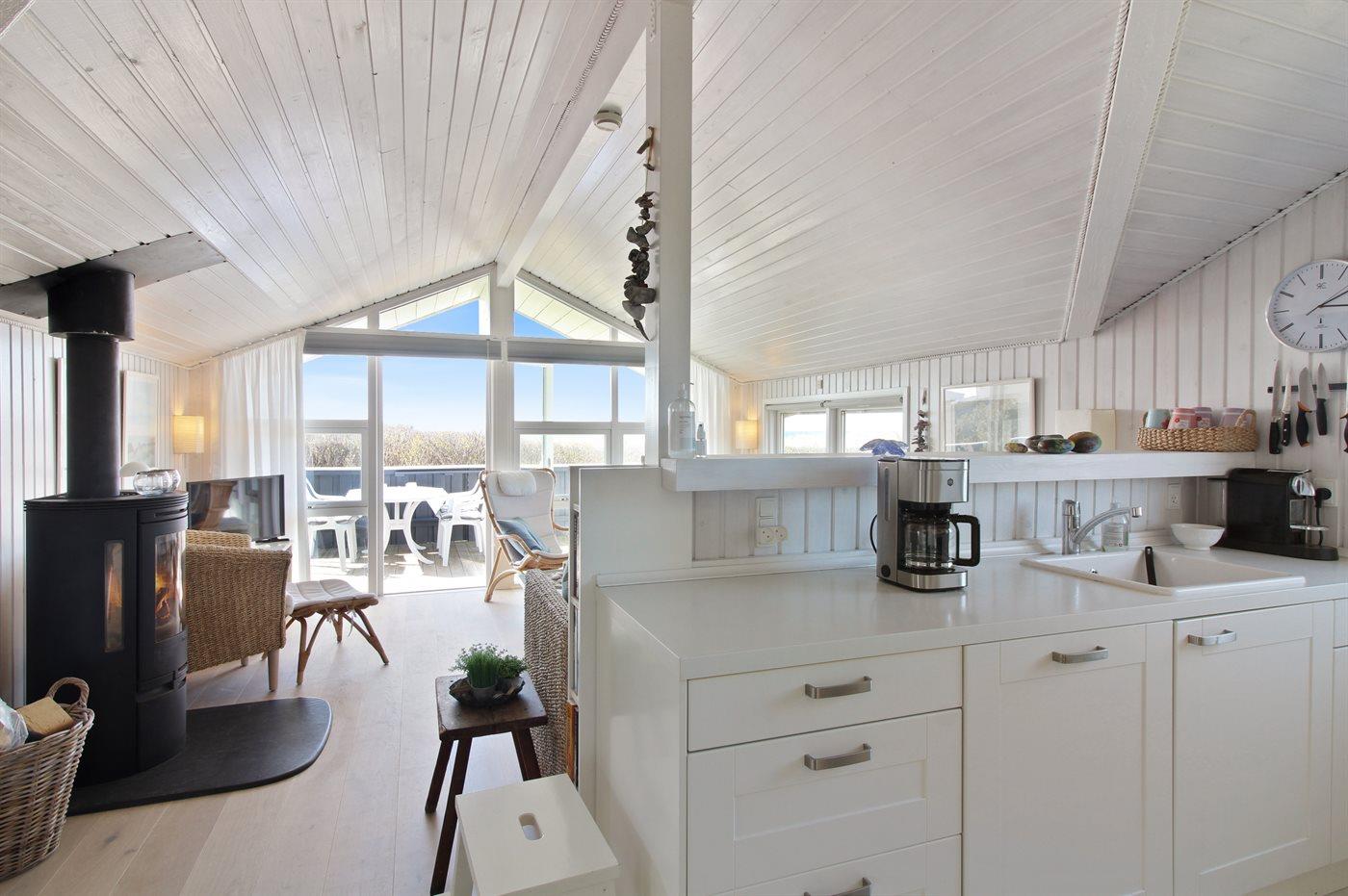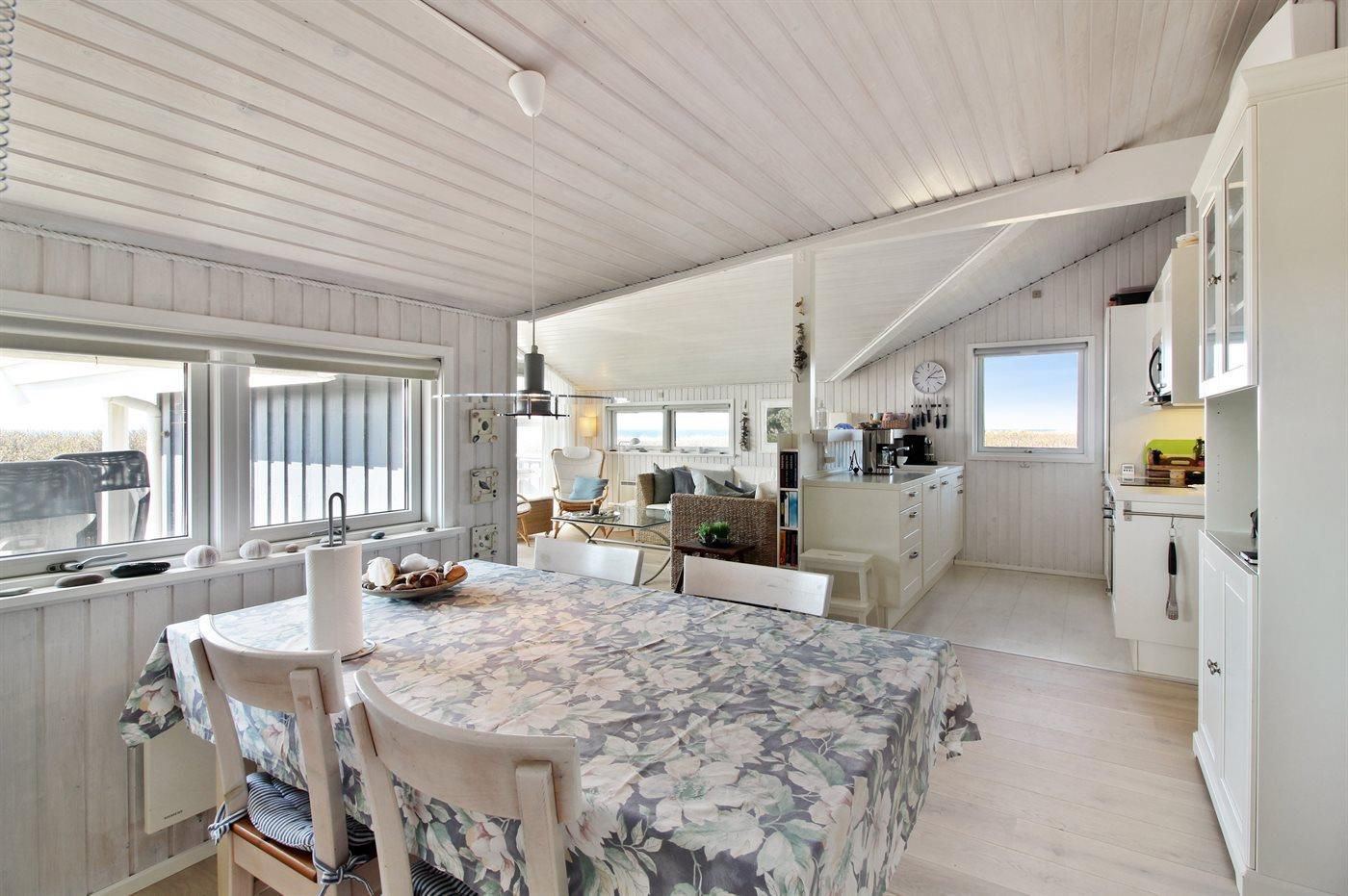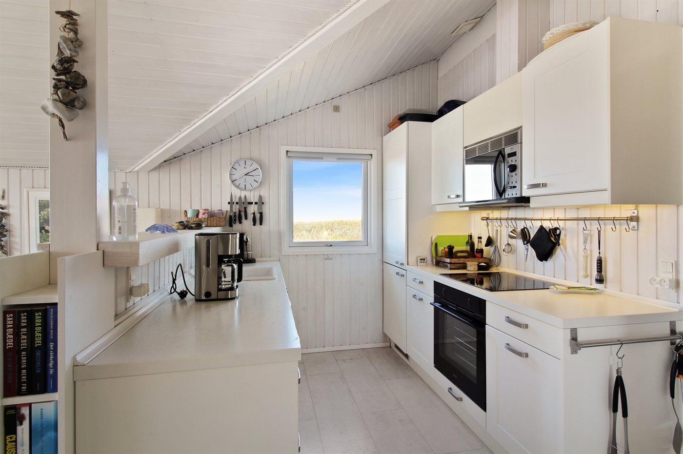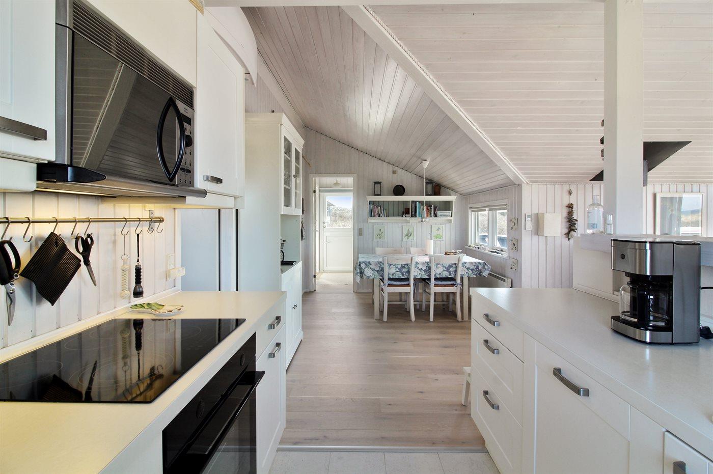 Køkkenet er udstyret med 1 køleskab. Der er 4 elkogeplader, varmluftovn, mikrobølgeovn samt opvaskemaskine.