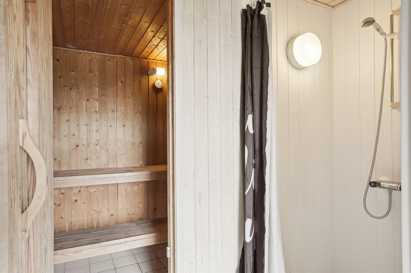 Der er 2 badeværelser med bruseniche og 2 toiletter. Der er gulvvarme på 2 badeværelser. I saunaen er der mulighed for afslapning.