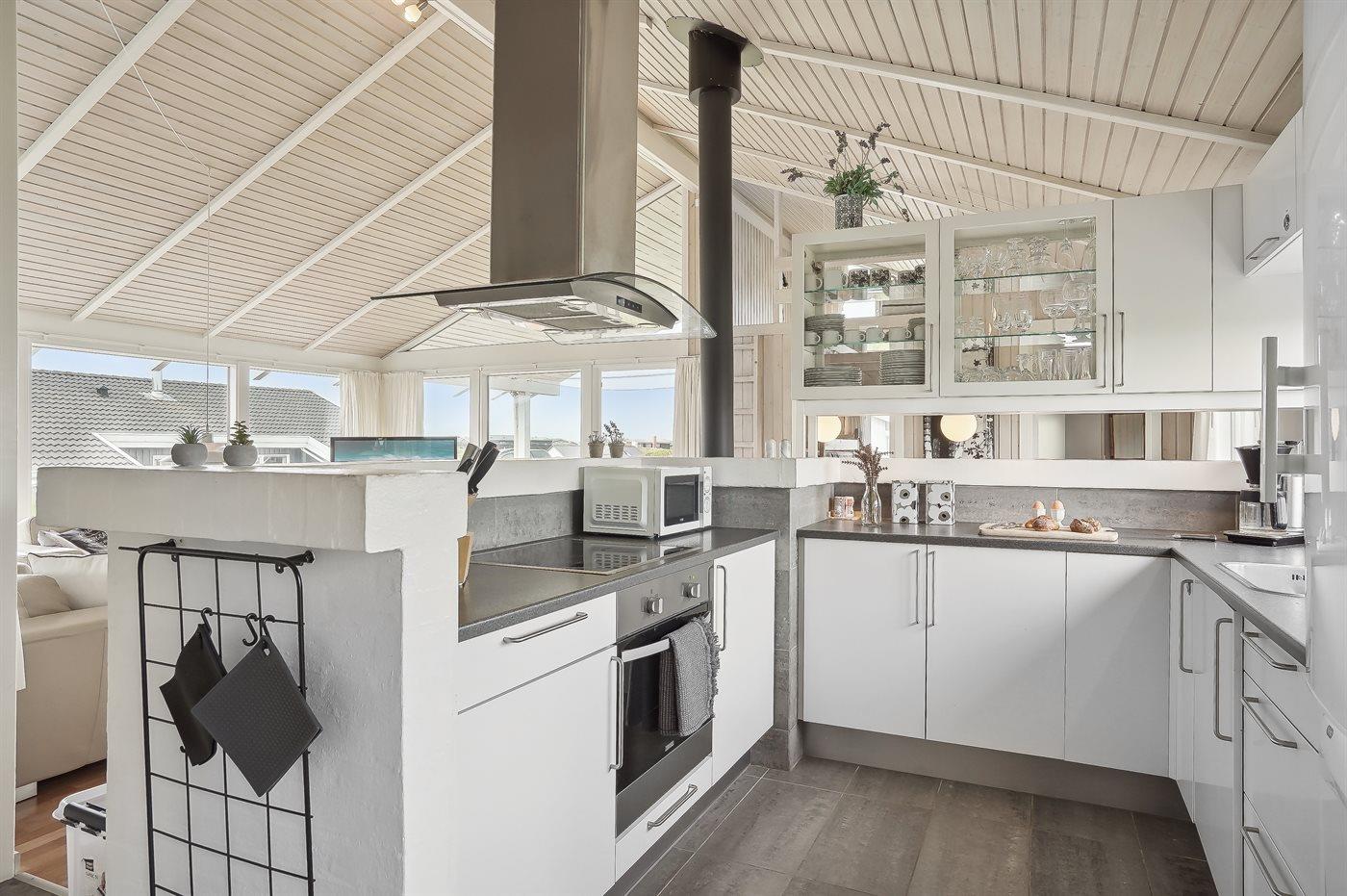 Køkkenet er udstyret med 1 køleskab. Der er 4 keramiske kogeplader, varmluftovn, mikrobølgeovn samt opvaskemaskine.