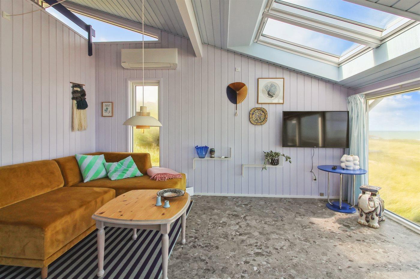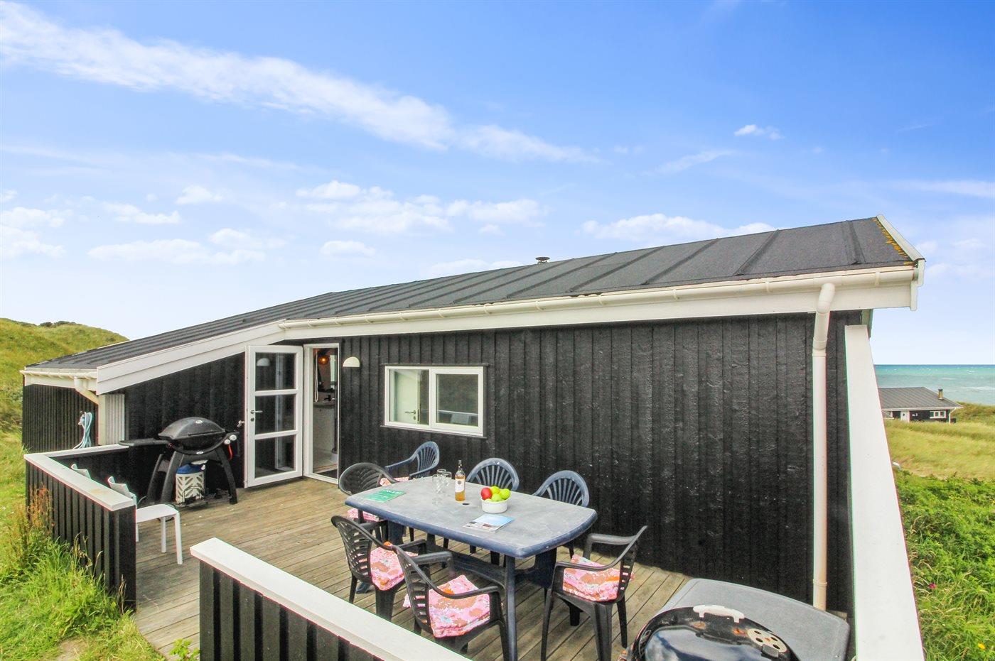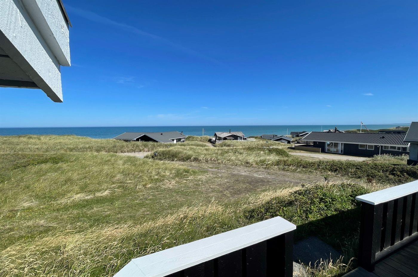 Dejligt sommerhus beliggende i Harerenden med udsigt over Vesterhavet både fra hus og grund. Huset fremtræder lyst og venligt.