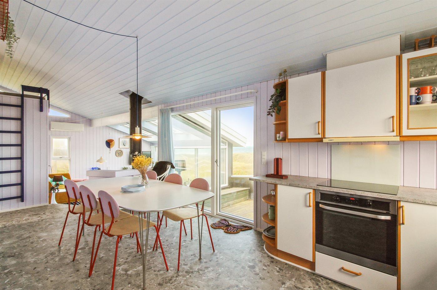 Køkkenet er udstyret med 1 køleskab. Der er 4 induktionskogeplader, varmluftovn samt opvaskemaskine Der er gulvvarme i køkkenet.