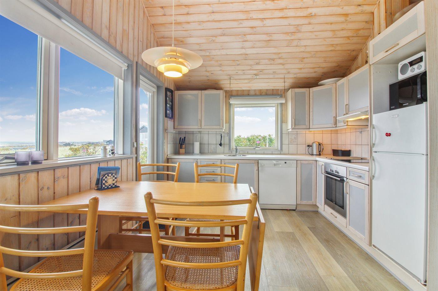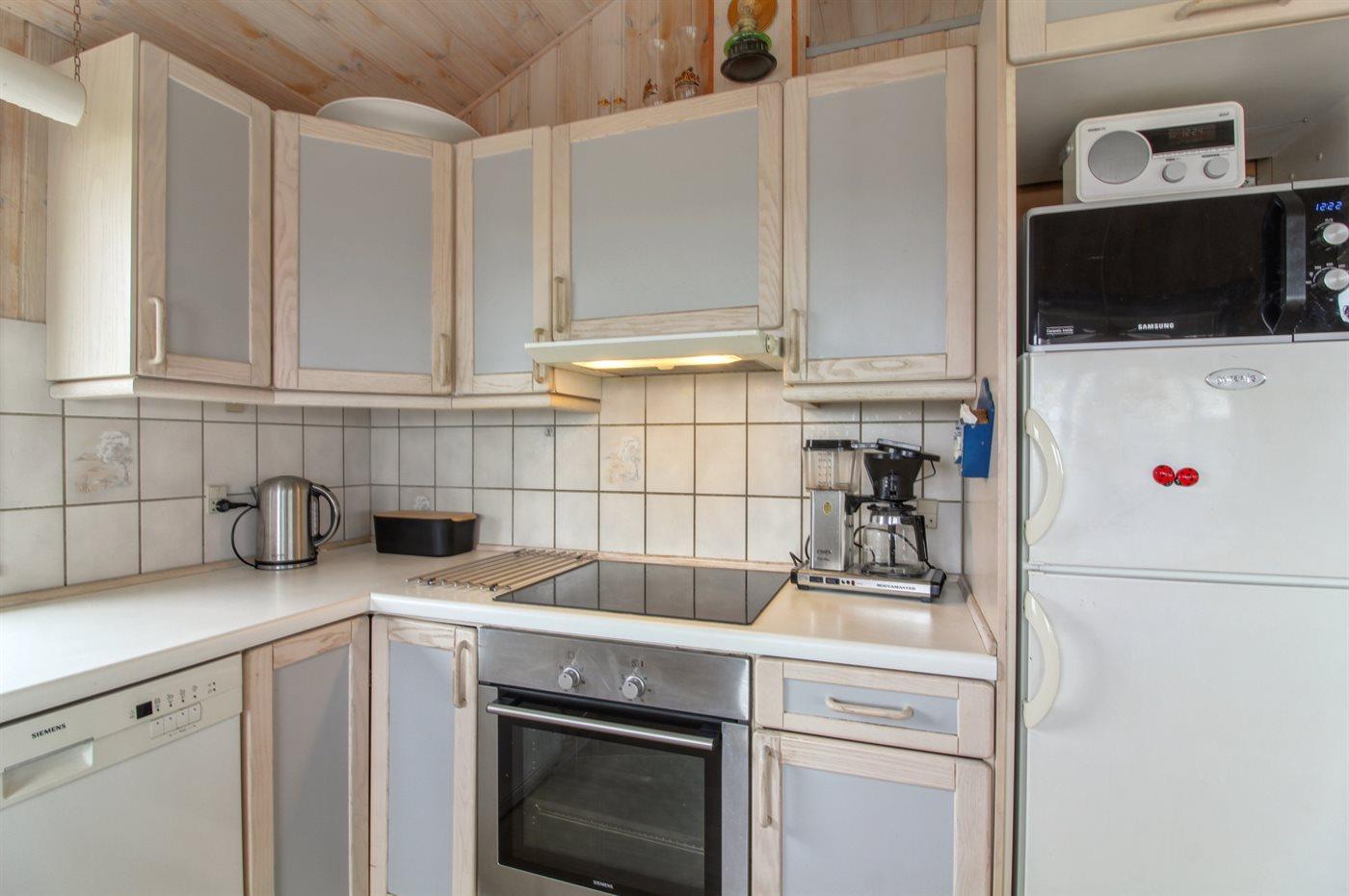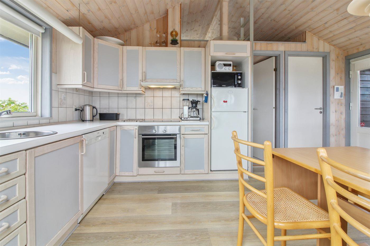Køkkenet er udstyret med 2 køleskabe. Der er 4 elkogeplader, varmluftovn, mikrobølgeovn samt opvaskemaskine.