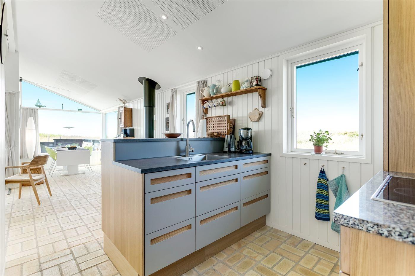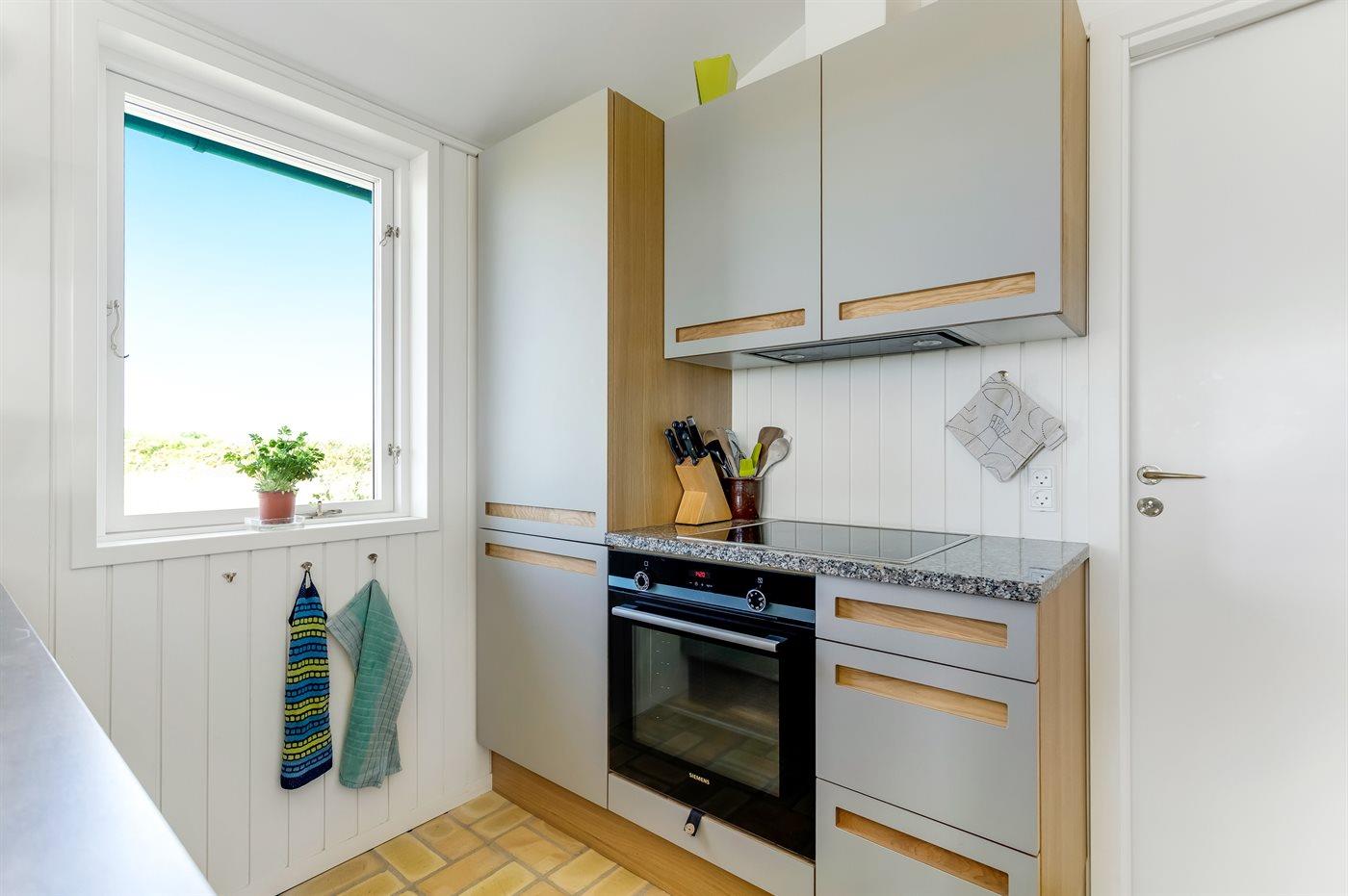 Køkkenet er udstyret med 1 køleskab. Der er 4 keramiske kogeplader, varmluftovn samt opvaskemaskine.