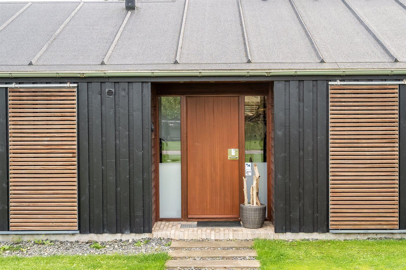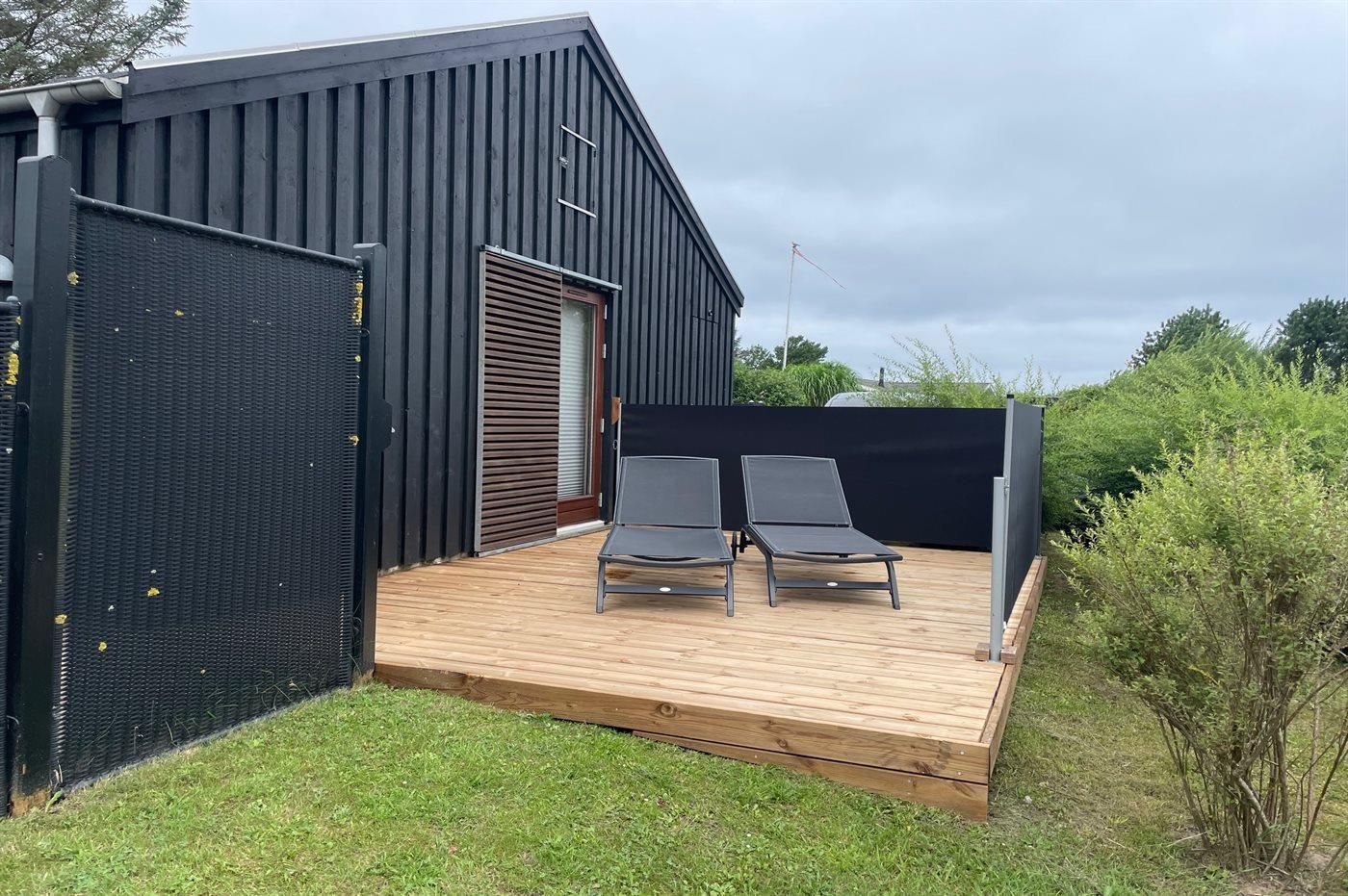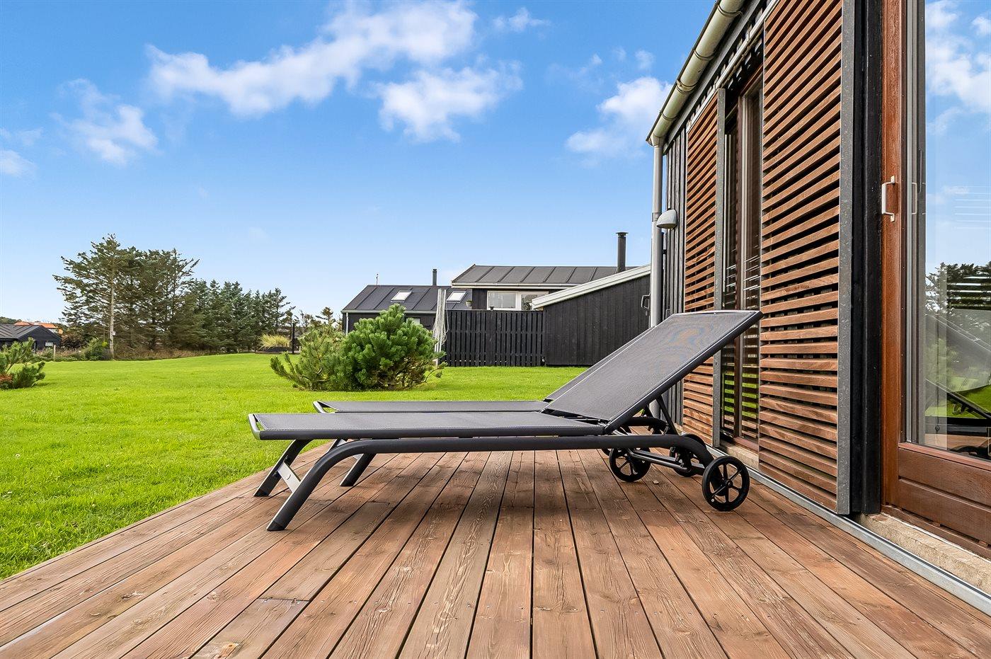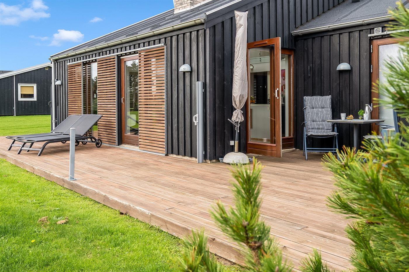 Ferieboligen er beliggende på en 1200 m² stor havegrund. Der er 758 m til havet. Nærmeste forretning er beliggende i en afstand af 300 m. Der er en golfbane i en afstand af 3000 m. Til ferieboligen hører åbent terrasseareal. Desuden er der overdækket terrasse. Der er redskabsrum. Der ligger en legeplads i en afstand af 300 m. Grill til rådighed. Der er installeret stik til opladning af elbil. Type 2 stik. Med 11 kW ladeeffekt. Parkering ved ferieboligen.