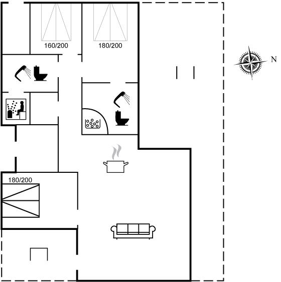 Foruden en hems og de 3 store soveværelser findes der 2 badeværelser, det ene med adgang til mastersuiten og spabadet, og det andet med adgang til sauna. Herudover er der et bryggers med vask og bord, som adskilles fra stuen af et glasparti med skydedør.