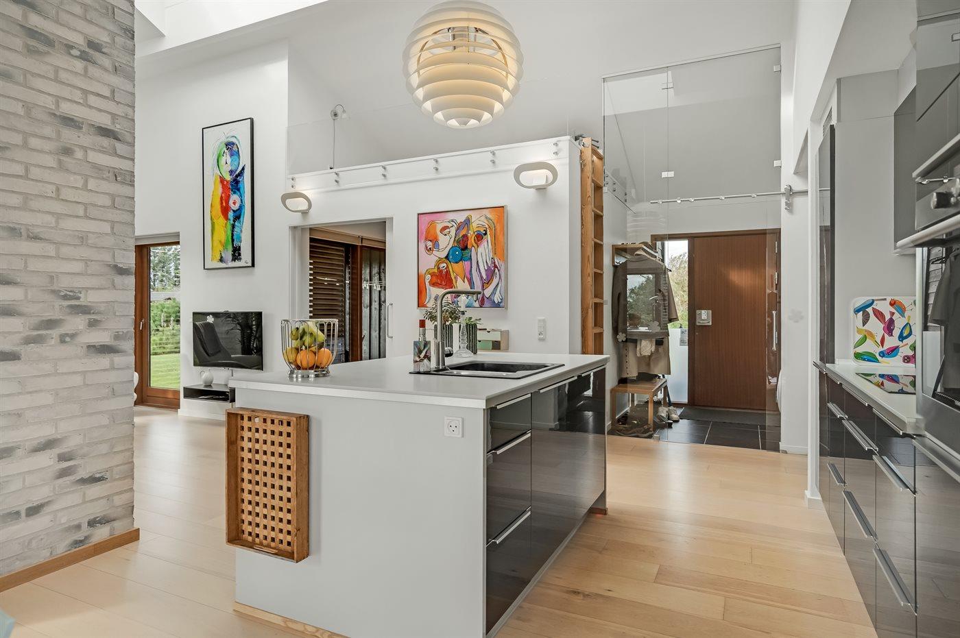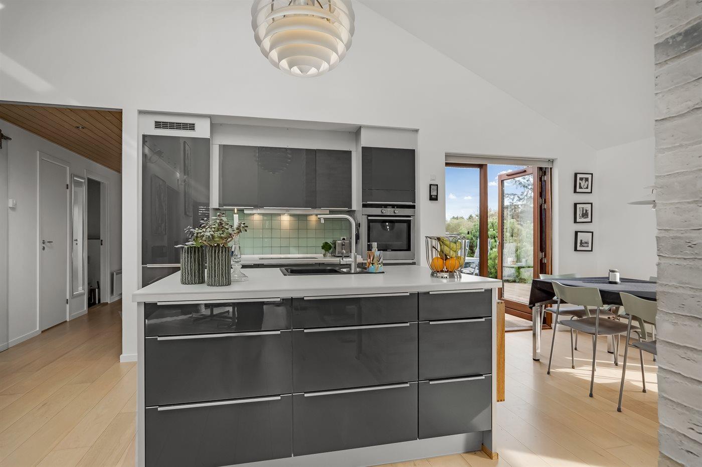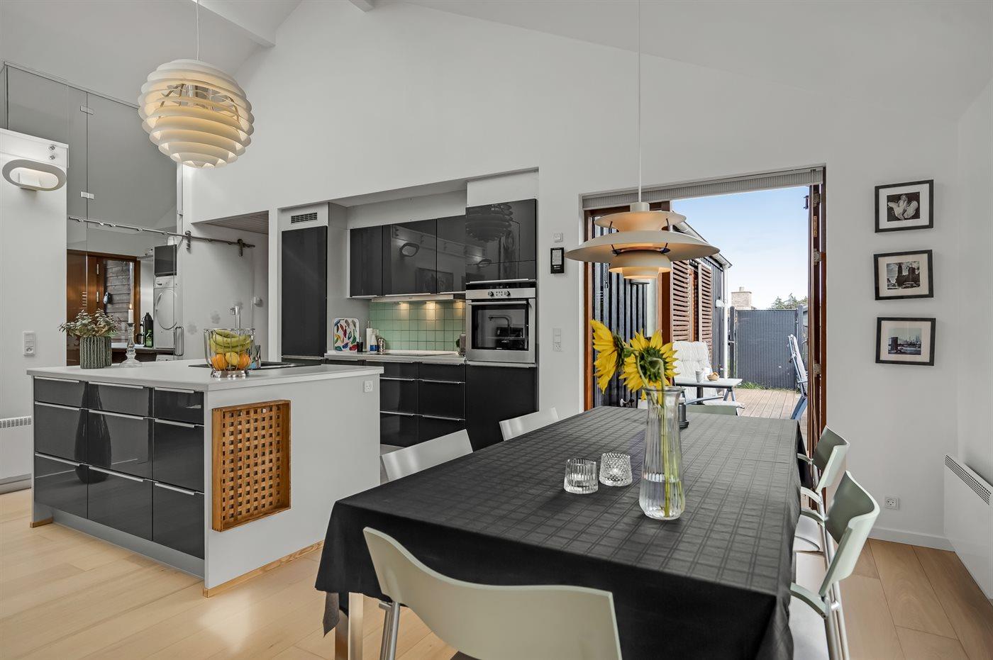 Køkken/stue ligger i åben forbindelse og er særdeles rummelige - med direkte adgang til såvel den overdækkede som den store, solvendte solterrasse.