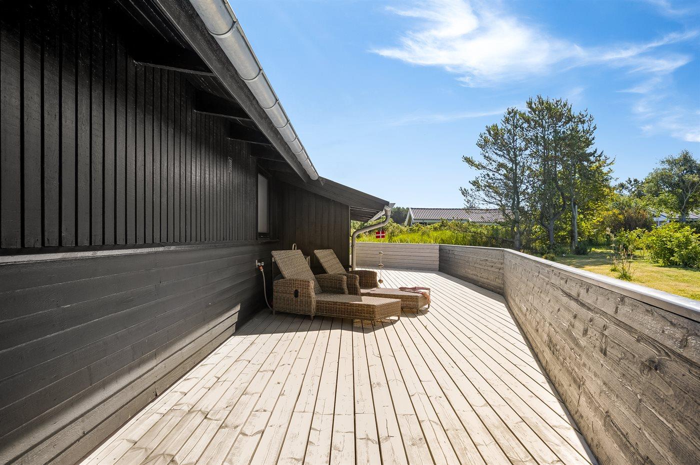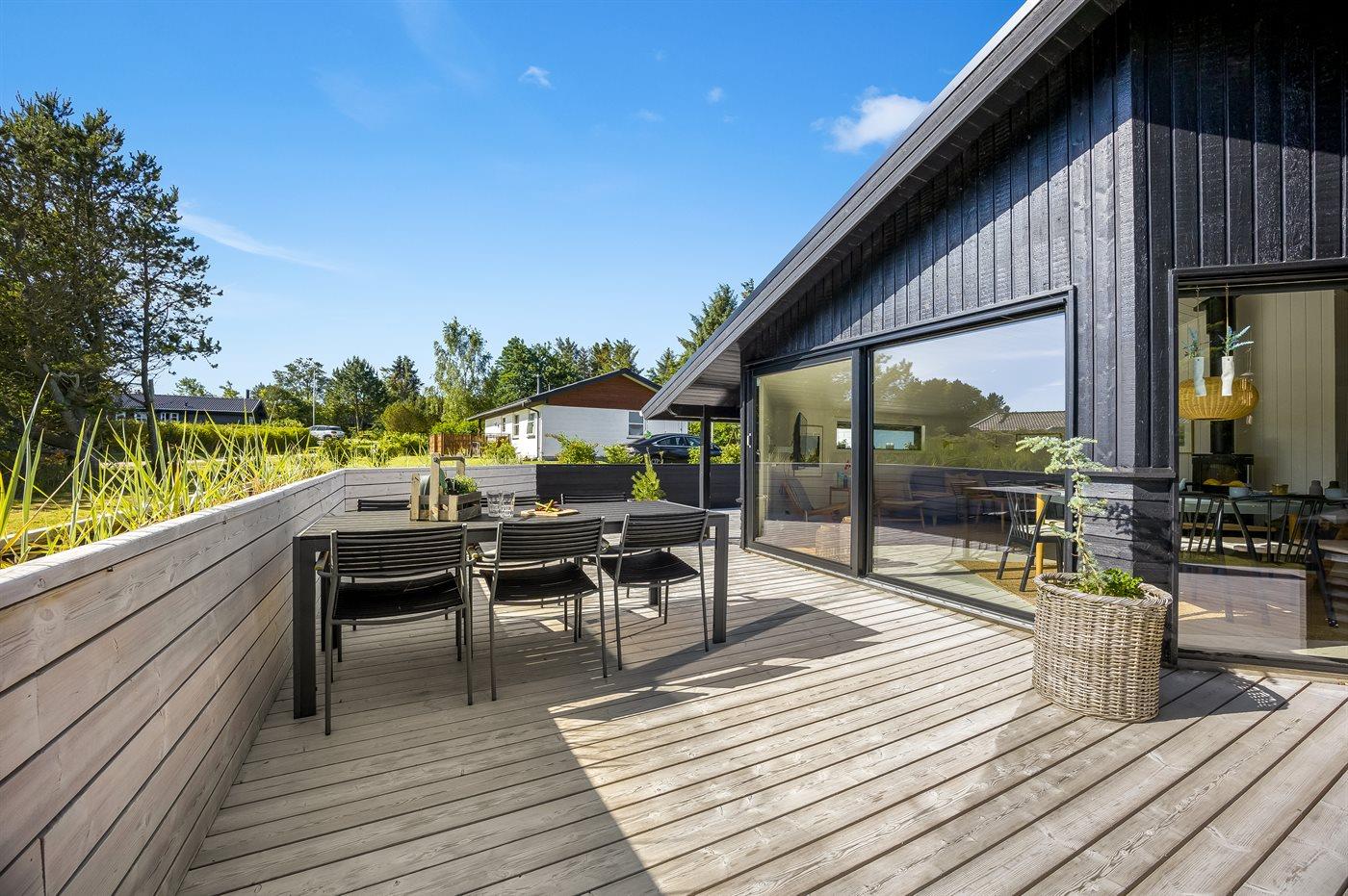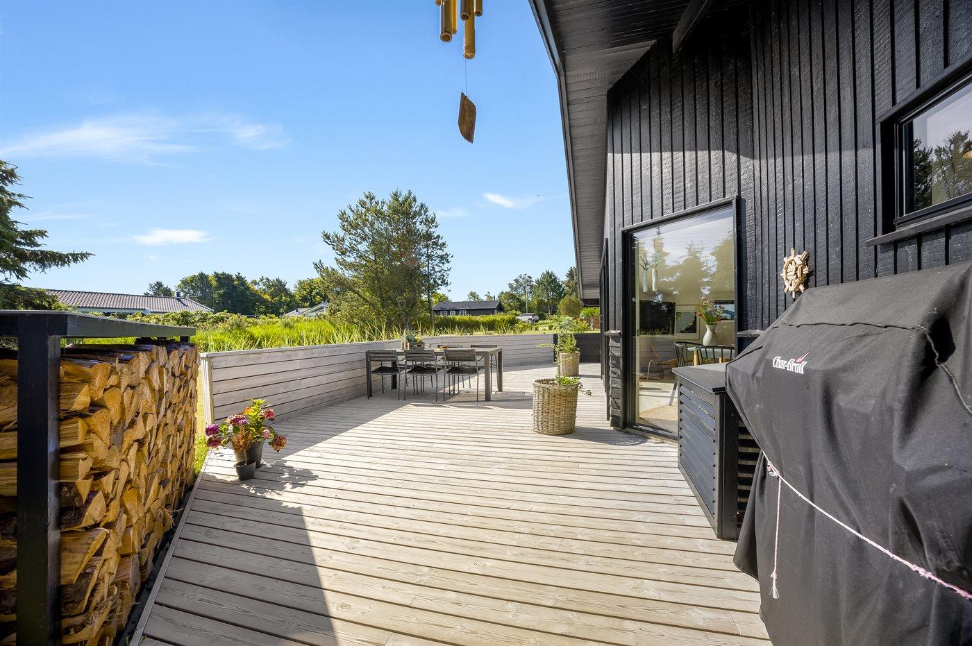 Grunden er på 1.065 m² og byder på en skøn åben og delvist overdækket træterrasse, der fungerer som en naturlig forlængelse af indearealet. Terrassen er opbygget med lægivende elementer hele vejen rundt, hvilket gør den ideel til ophold hele dagen – uanset vindretning. Et dejligt sted at nyde både morgenkaffen og sommeraftenerne, for både børn og voksne. Derudover er der redskabsrum, grill og nem adgang til en legeplads kun 300 meter væk. Parkering findes lige ved huset, og der er elstander til opladning af elbil. Afstanden til hav og indkøb er omkring 990 meter.