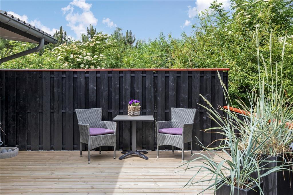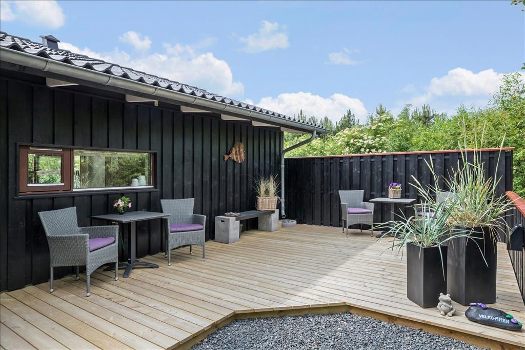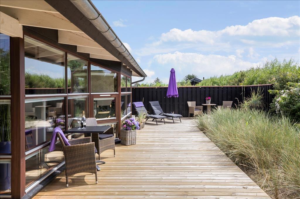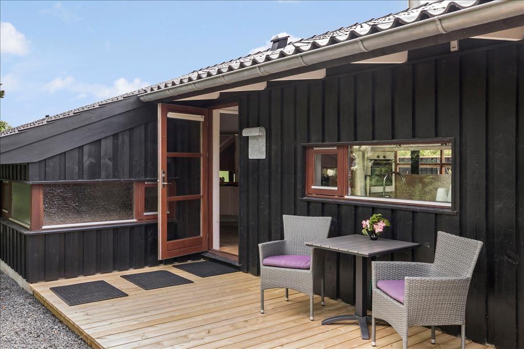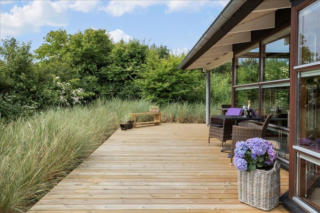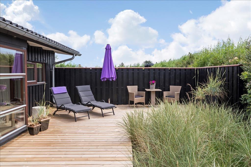 Sommerhuset har en dejlig og delvist overdækket terrasse med gode havemøbler, liggestole og grill. Her kan du sænke skuldrene og bare nyde den friske luft og de smukke omgivelser og i stille vejr lyden fra bølgerne, som slår ind mod kysten.