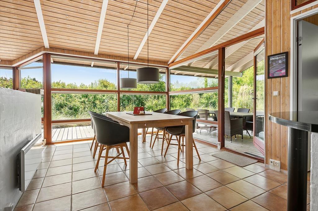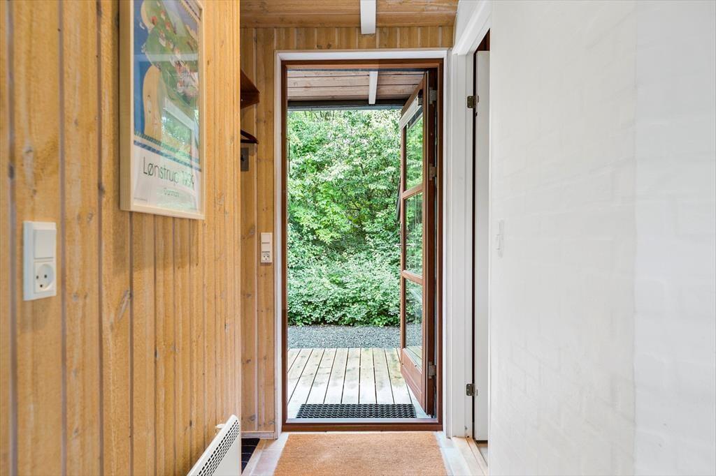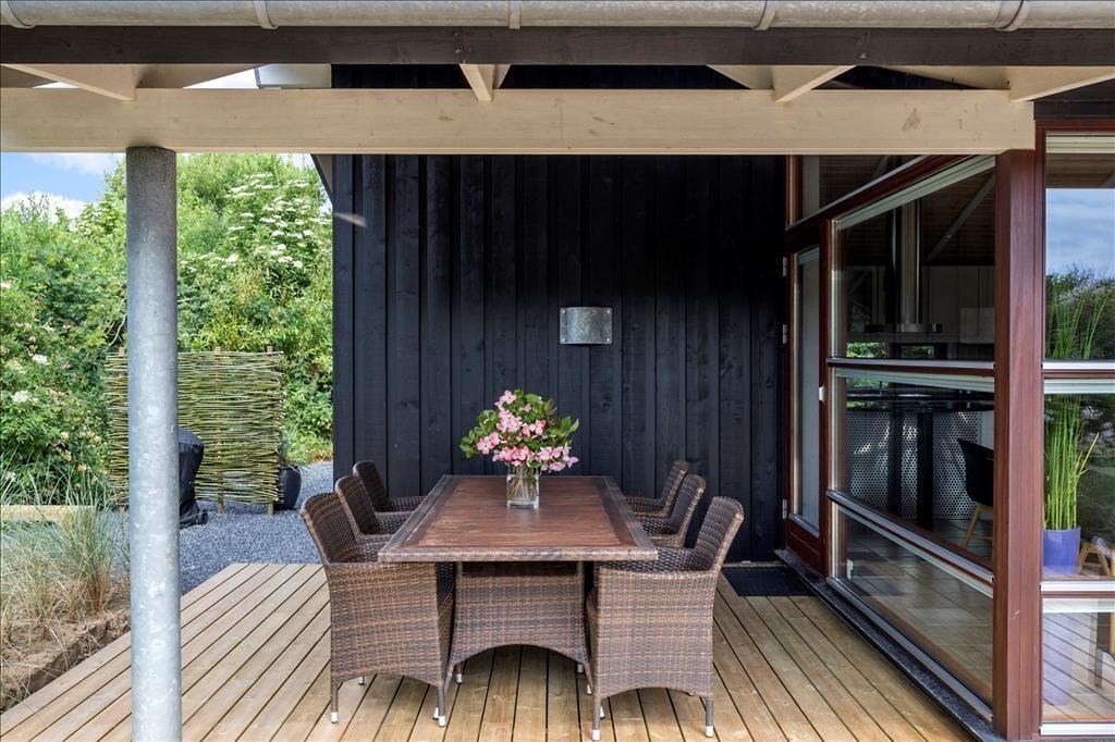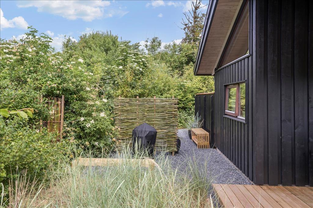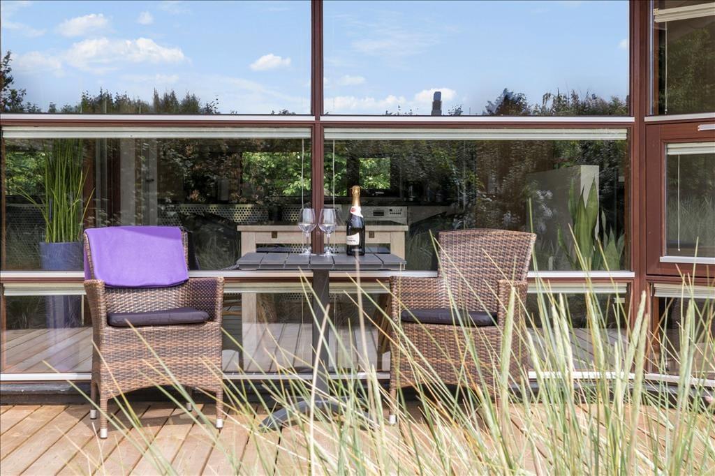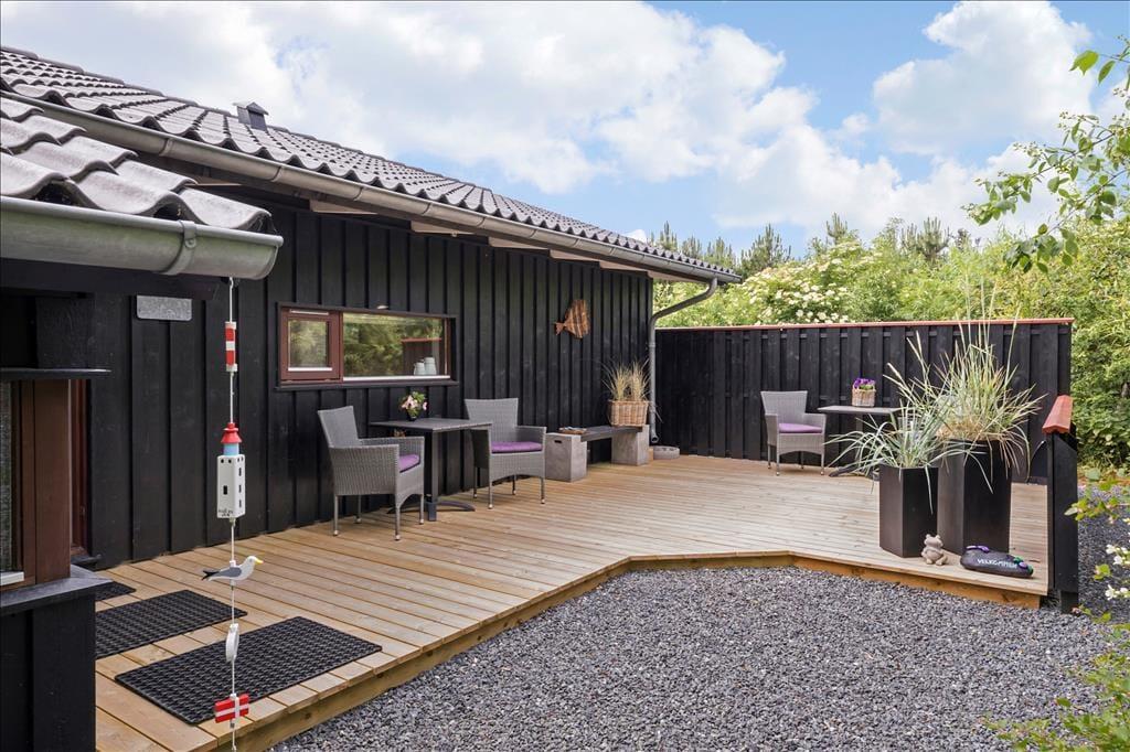 Sommerhuset har en dejlig og delvist overdækket terrasse med gode havemøbler, liggestole og grill. Her kan du sænke skuldrene og bare nyde den friske luft og de smukke omgivelser og i stille vejr lyden fra bølgerne, som slår ind mod kysten.