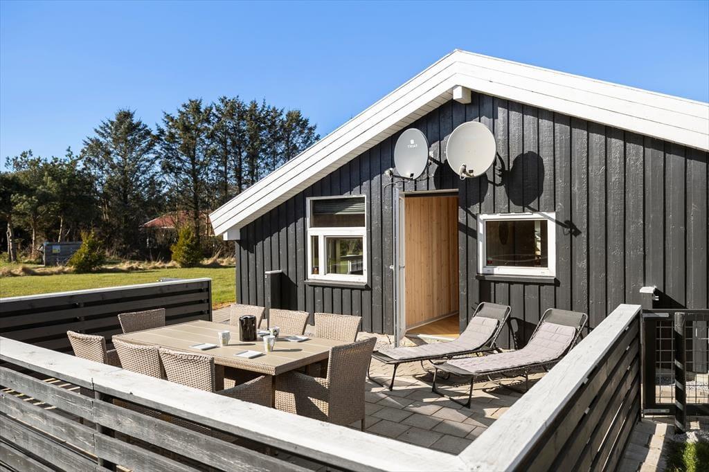 Udenfor fortsætter ferieidyllen i det store haveareal, hvor en del af haven er indhegnet – et kæmpe plus for børnefamilier og hundeejere, der gerne vil nyde ferien med ro i maven. Her er der masser af plads til boldspil, leg og afslapning, og på den overdækkede terrasse kan du starte dagen med en stille kop kaffe eller samle hele flokken til aftensmad ved grillen. Har du lyst til en stille stund i solen med en bog og et tæppe, eller måske til at sidde under overdækningen og høre regnen tromme på taget? Uanset vejret, kan terrassen noget særligt – og den gør det nemt at forlænge udelivet, også når duggen falder, eller solen går ned bag trætoppene. Her er plads til bare at være – og mærke nærværet.
