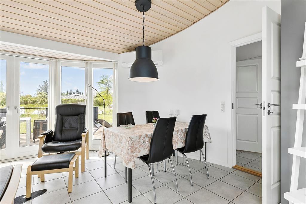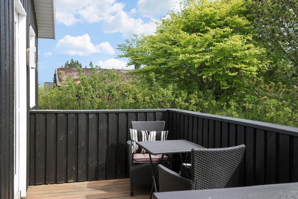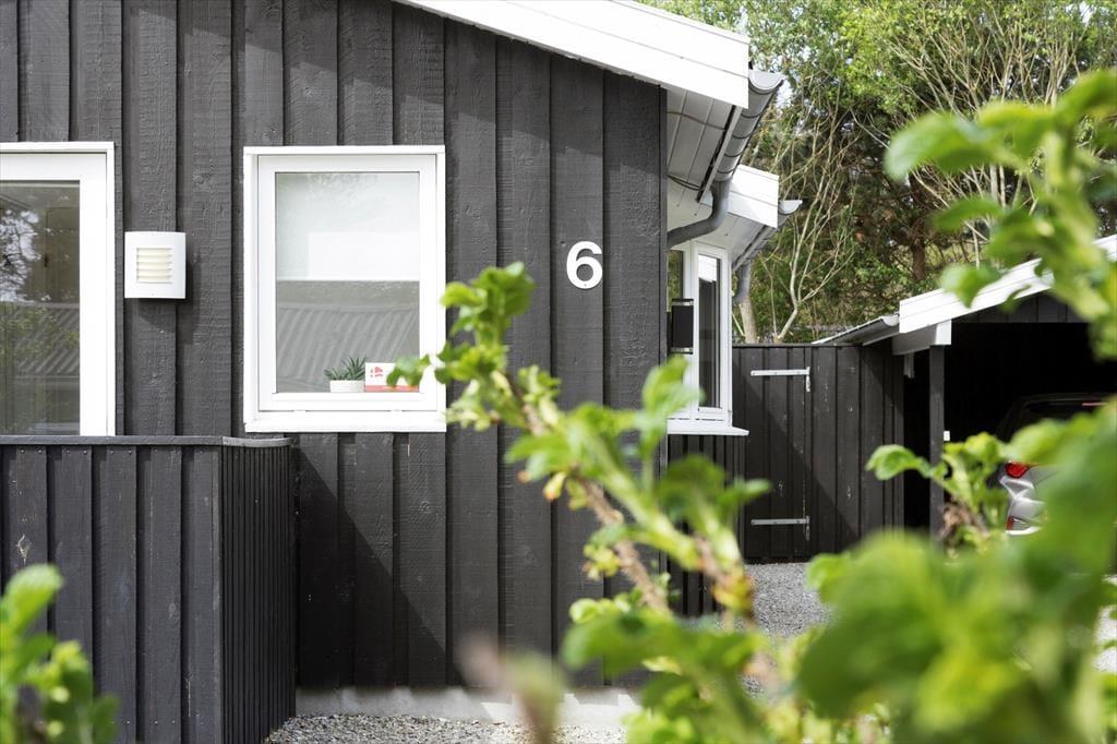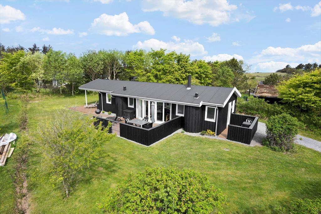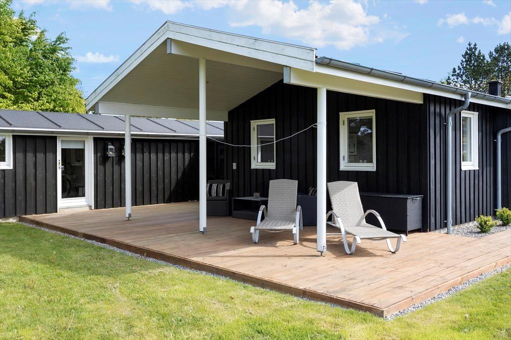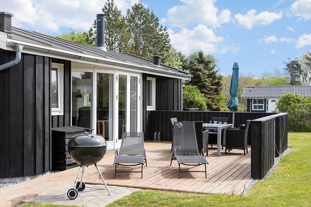 Sommerhuset ligger på en skøn naturgrund, som er lukket af træer og buske, her kan børnene lege i fred og ro, og man kan nyde sommerlivet helt ugeneret. Rundt om huset er flere dejlige terrasser: mod øst kan man nyde morgenkaffen, på sydsiden er der plads til at slikke sol og slappe af på ligggstolene, og mod vest er der godt med læ mellem hovedhuset og det tilhørende anneks og under den overdækkede del.