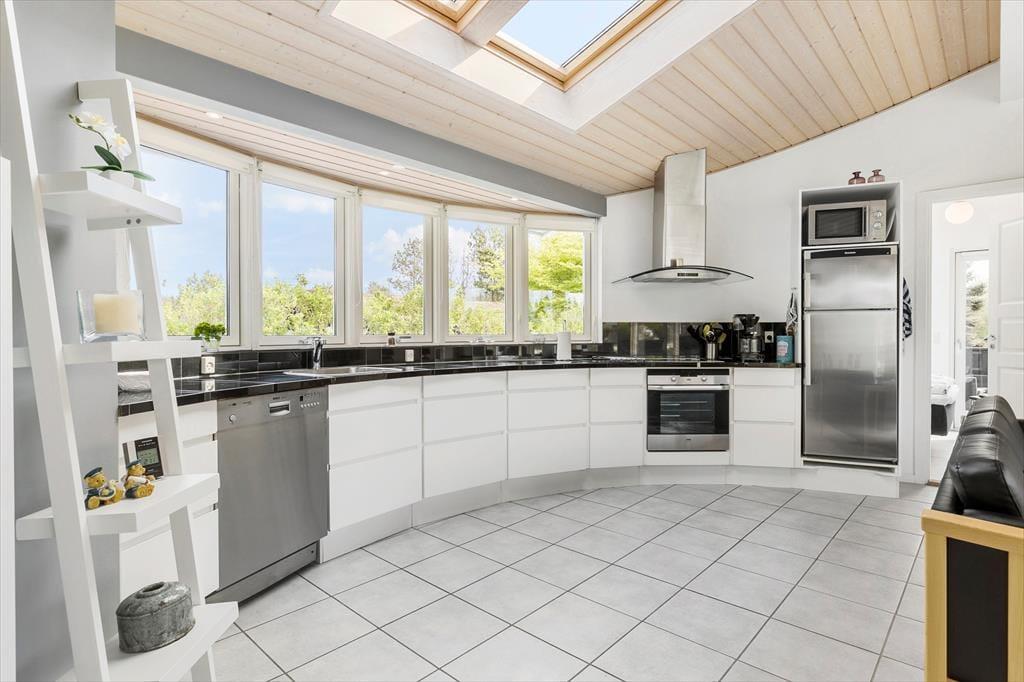I udkanten af Lønstrup by ligger dette flotte sommerhus med en anderledes og spændende arkitektur. Centrum af huset med et åbent køkken-opholdsrum er cirkelformet og domineret af store vinduespartier, som lukker en masse af det fantastiske nordjyske lys ind i det store rum. Formen gør også, at rummet ikke har nogle hjørner, og på den måde kan hele familien være sammen, selvom man er i gang med forskellige aktiviteter. Hele sommerhuset er flot og moderne indrettet med kvalitetsmøbler, alt i en sort, hvid og grå farveskala og udover et godt udvalg af hårde hvidevarer er her også kabel-tv og trådløst internet, så medbring gerne pc eller tablets hjemmefra. Sommerhuset råder over tre gode værelser med dobbeltsenge og to flotte badeværelser med fuldmurede brusenicher med sorte klinker og et spabadekar i det ene. Værelserne og badeværelserne er fordelt i hver sin ende af huset, så det er muligt at lave en voksen og en børneafdeling. I dette sommerhus er man sikker på at få en afslappende og komfortabel ferie i smukke og velfungerende rammer.