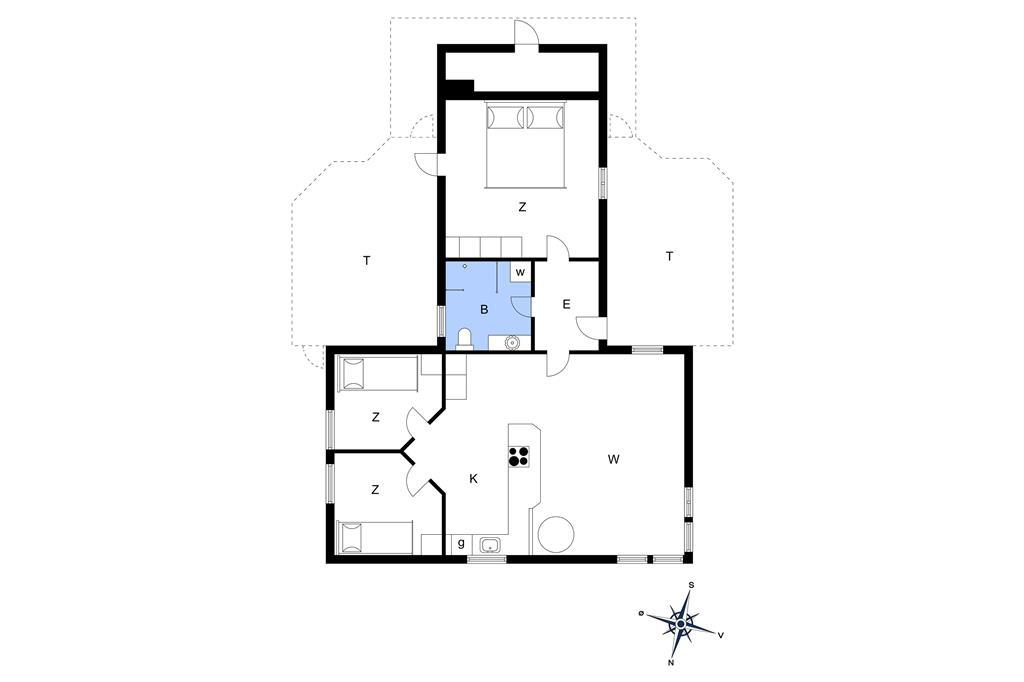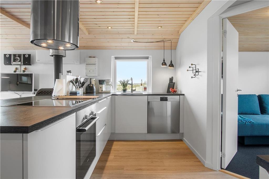 Det klassiske træhus er bygget i 1957 og er løbende renoveret med respekt for den oprindelige arkitektur, så sommerhuscharmen stadig er intakt. Efter seneste modernisering er indretningen lys og indbydende, hvilket går godt i spænd med vinduernes dejlige lysindfald. I stuen sørger de vestvendte vinduer samtidig for udsigt til havet, så når I sidder ved spisebordet, kan I nyde synet af vandet – og sidst på dagen også de fantastiske solnedgange. Er det køligt udenfor, kan stuens brændeovn sprede både varme og hygge, og hvis der derimod er sommerlunt, kan varmepumpen også køle. Stuen byder blandt andet på Smart TV, radio og wi-fi, og et veludstyret køkken ligger på velfungerende vis som del af opholdsrummet. Husets badeværelse har brus, gulvvarme og vaskemaskine, og endelig byder planløsningen på tre soveværelser: To af soveværelserne er ikke så store, men er udstyret med nye sovesofaer af god kvalitet, der kan slås ud til 150 centimeters bredde. Det store soveværelse er indrettet med dobbeltseng og har direkte udgang til en østvendt terrasse.