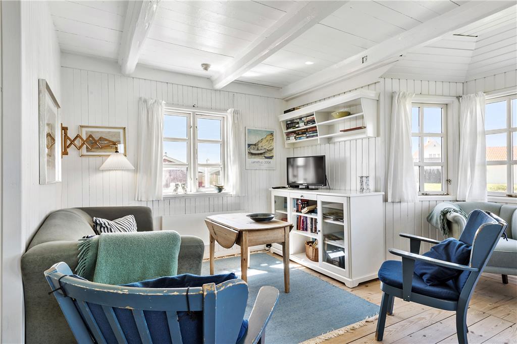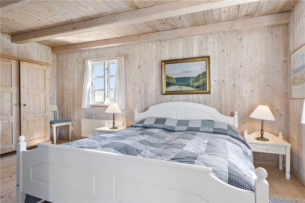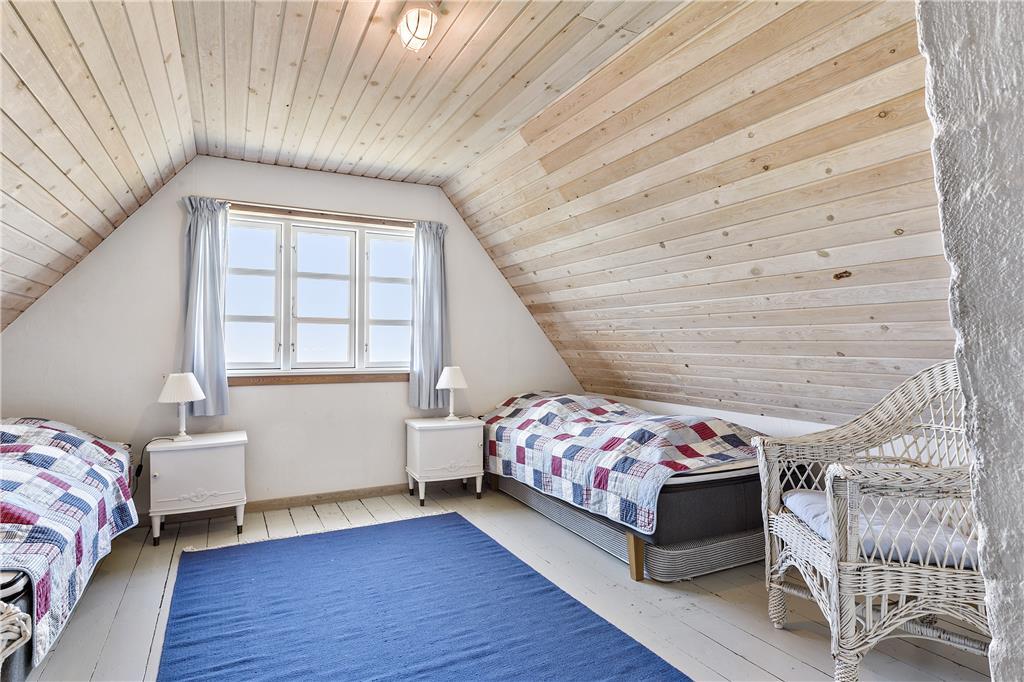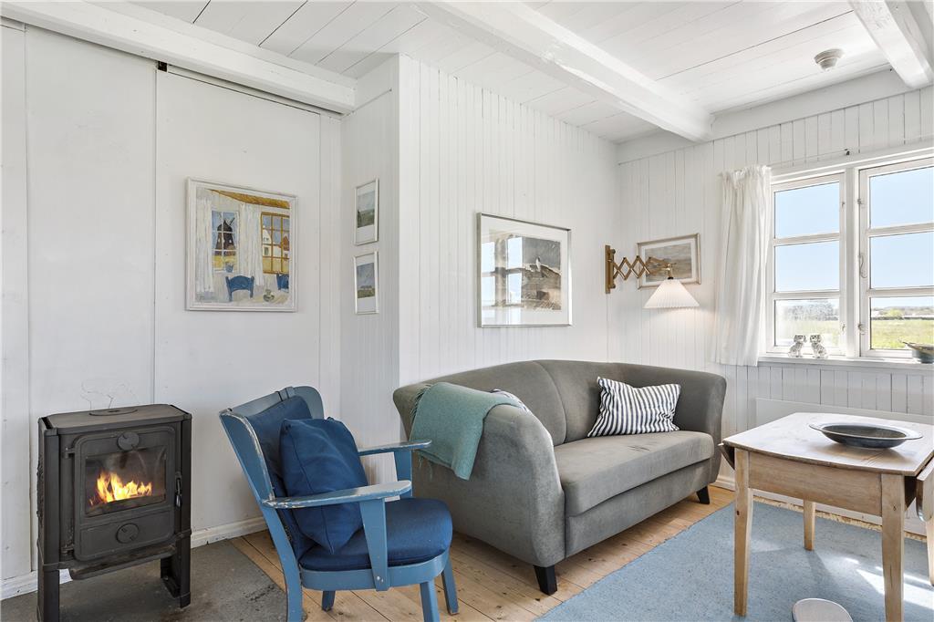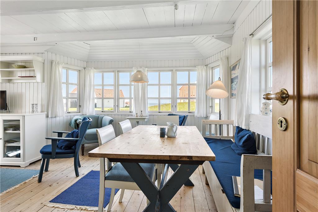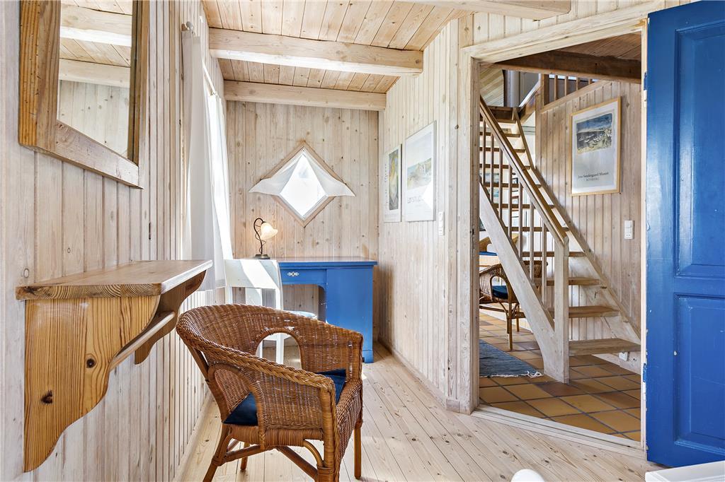 Sommerhuset er hyggeligt indrettet i to etager. I stueplan finder du køkkenet med udgang til den østvendte terrasse. Stuen er hyggelig indrettet med charmerende ældre og komfortable møbler. Overalt fra stuen har man den smukkeste udsigt over Vesterhavet og nogle af byens ældste og smukt renoverede sommerhuse. I stueplan findes et stort soveværelse samt husets badeværelse. På første salen finder du sommerhusets andet soveværelse med to enkeltsenge og også herfra kan man nyde den flotte havudsigt.