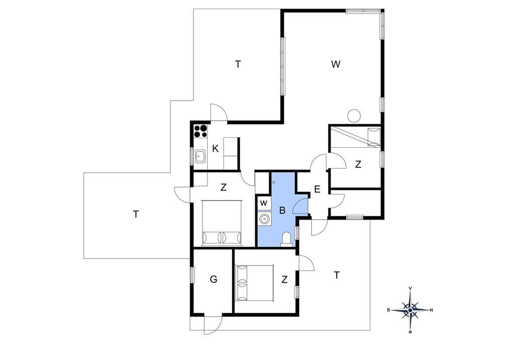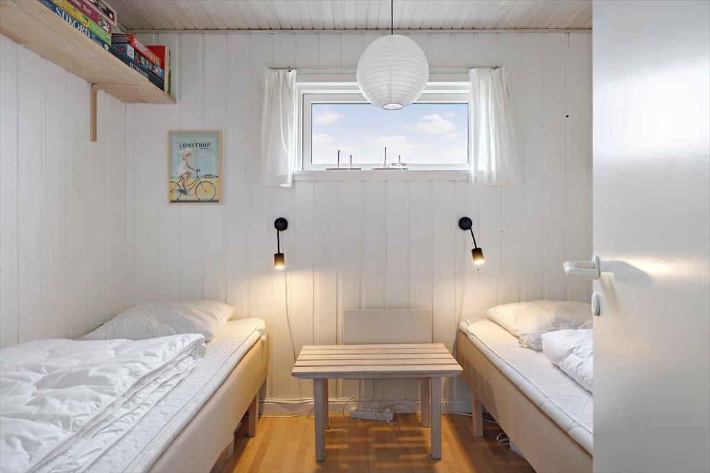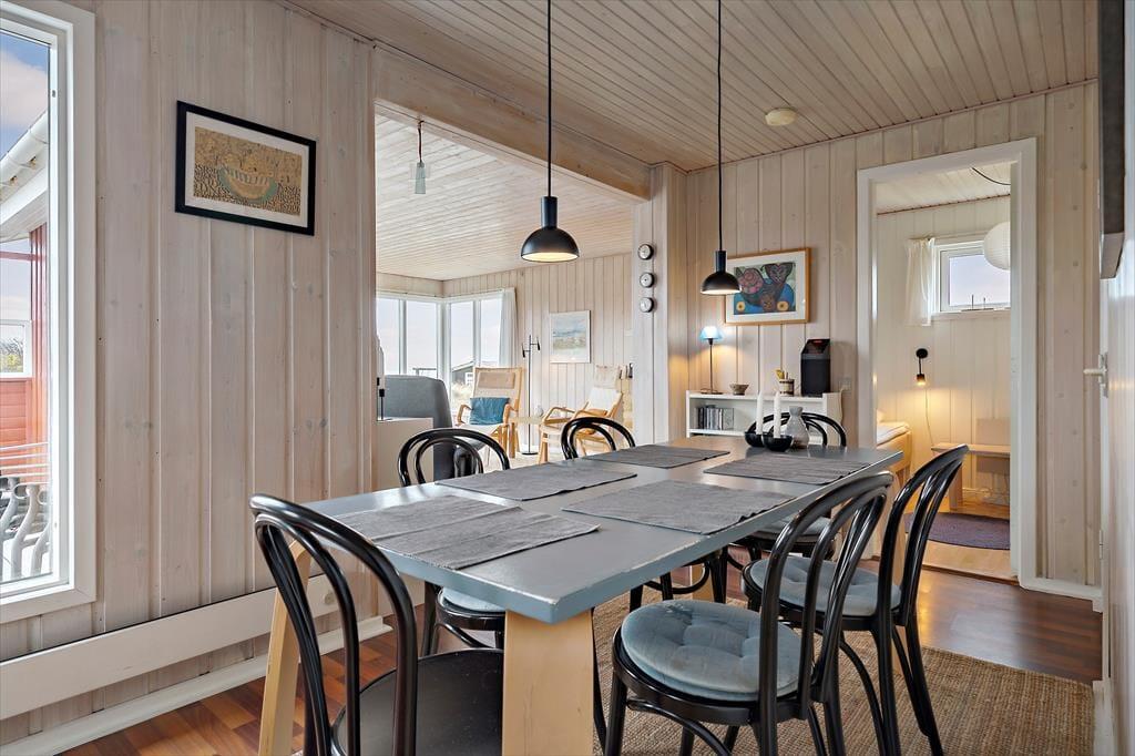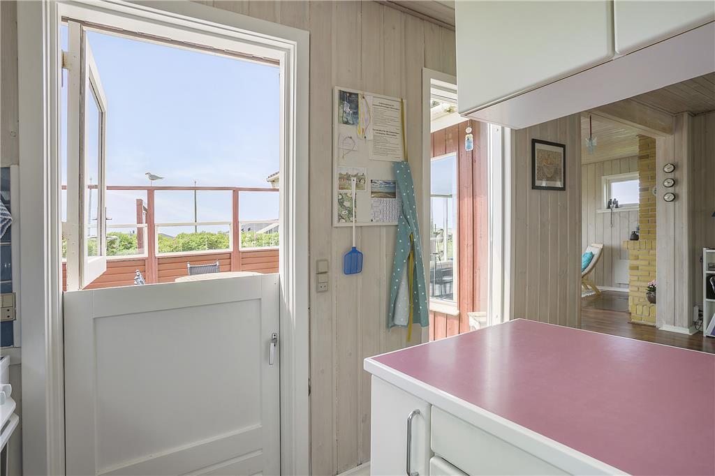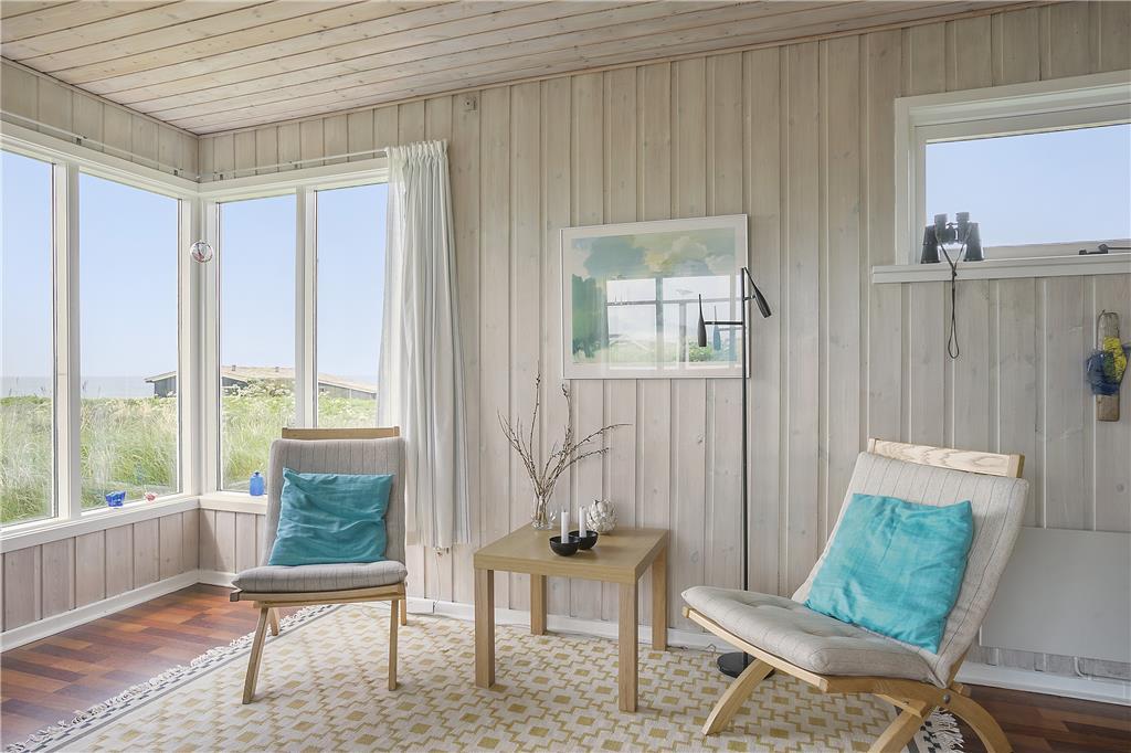 Sommerhuset er lyst og indbydende indrettet med smarte og komfortable møbler. Her er store vinduer som giver et fint lysindfald og skøn udsigt til havet. En brændeovn er med til at give både varme og hygge. Køkkenet ligger i åben forbindelse til stuen. Sommerhuset har tre værelser, to med dobbeltsenge og et med to enkeltsenge. Det ene værelse har adgang via terrassen. Badeværelset et pænt og lyst og har vaskemaskine.