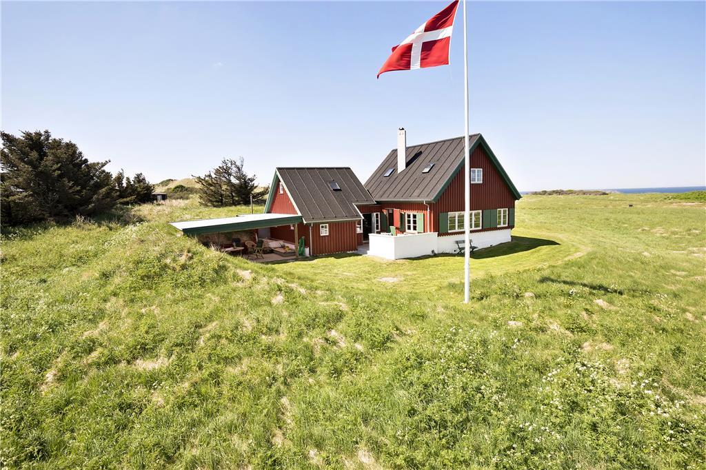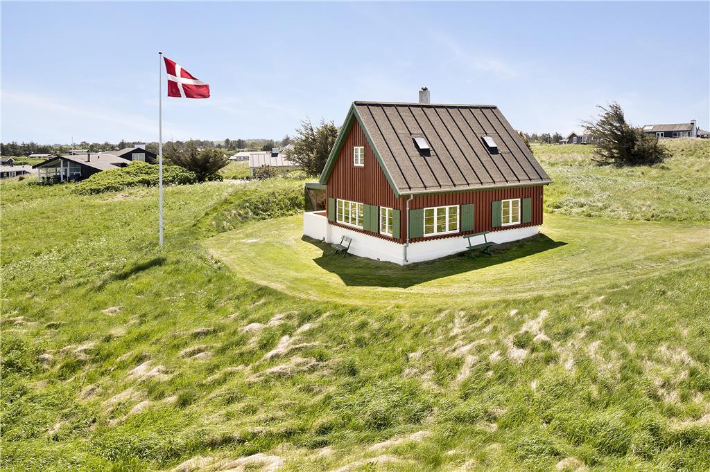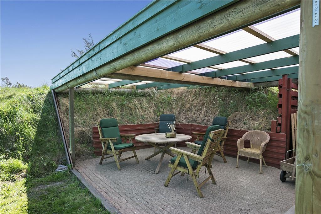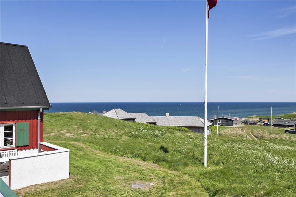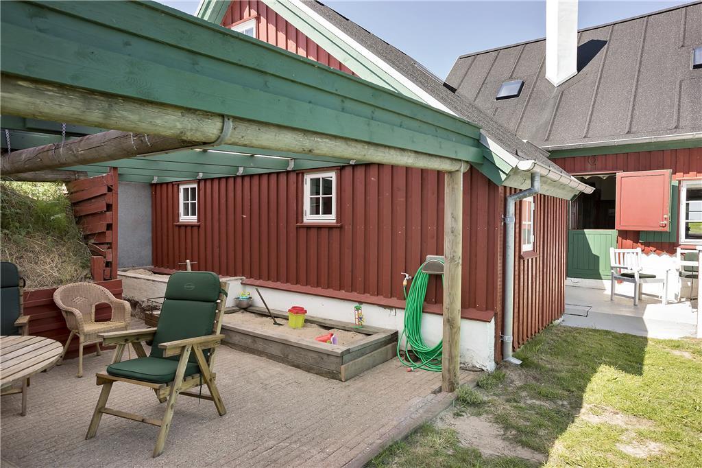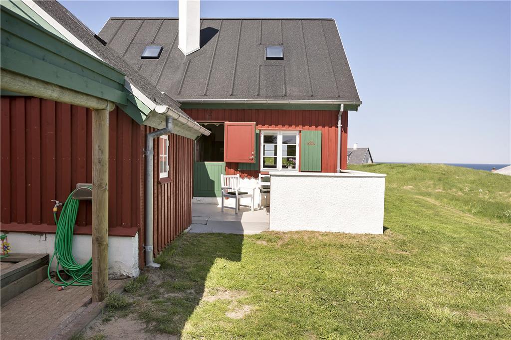 Sommervillaen er højt beliggende på en smuk stor naturgrund. Der er en østvendt terrasse lige udenfor køkkendøren, hvor det er oplagt at drikke morgenkaffen og for enden af huset er der en stor fin overdækket terrasse, hvor der er en sandkasse til børnene. Græsplænen er ideel til solbadning, leg og afslapning på de lange lyse sommeraftner og overalt fra grunden og huset kan man nyde den smukke udsigt og Vesterhavet. Der er et lille ekstra toilet, som man kommer til udefra.