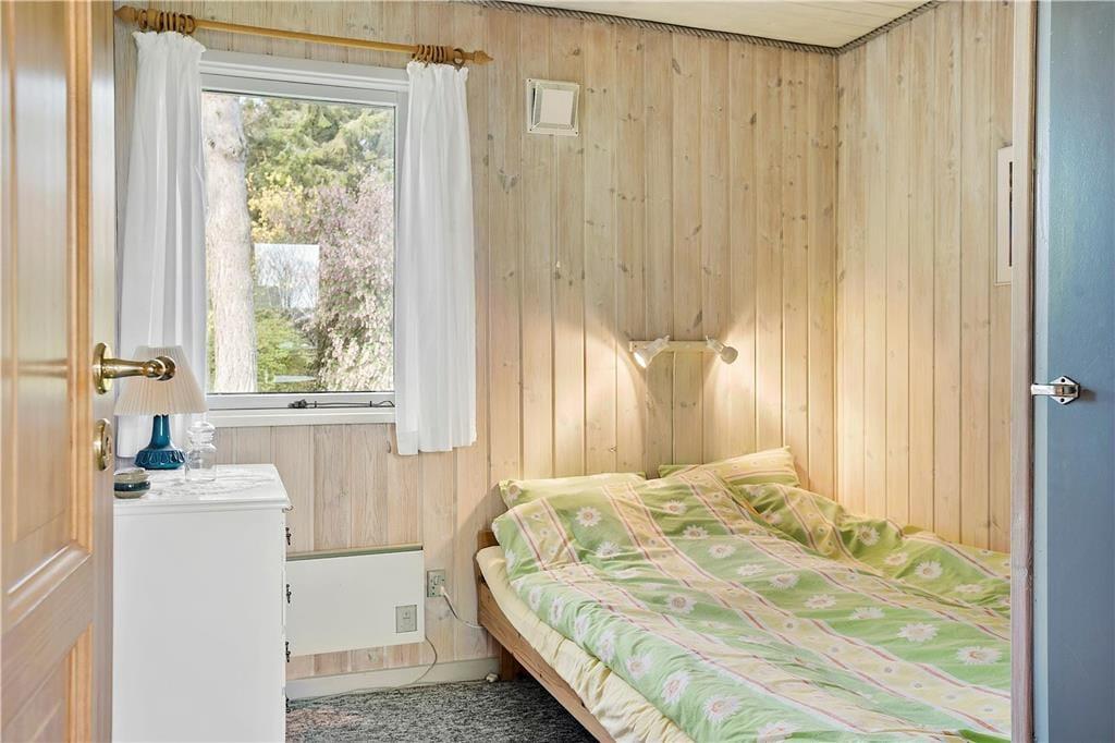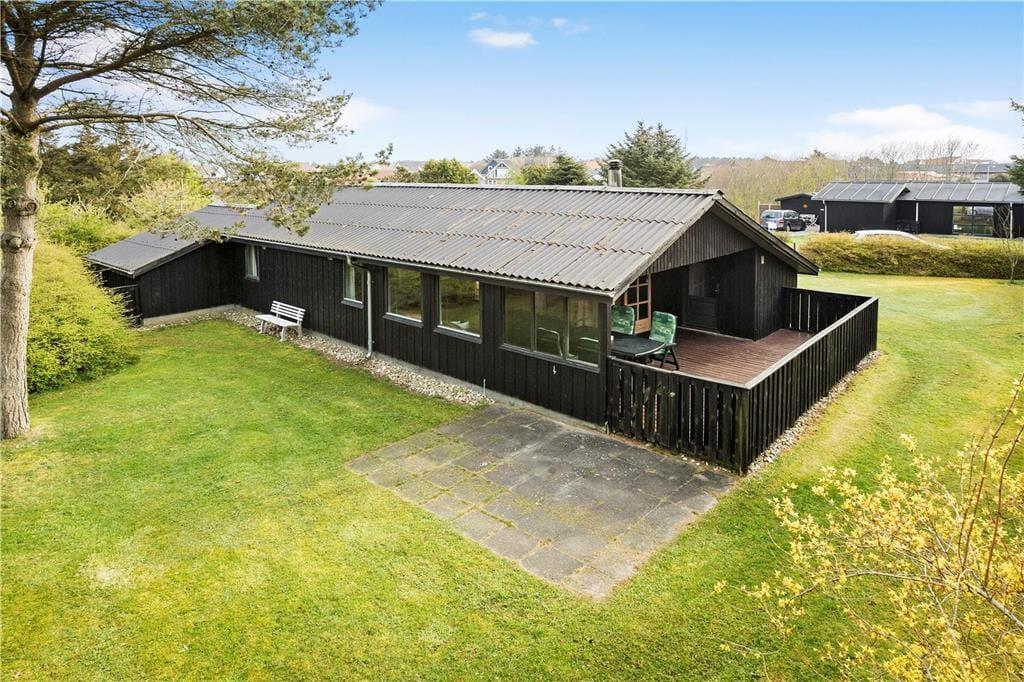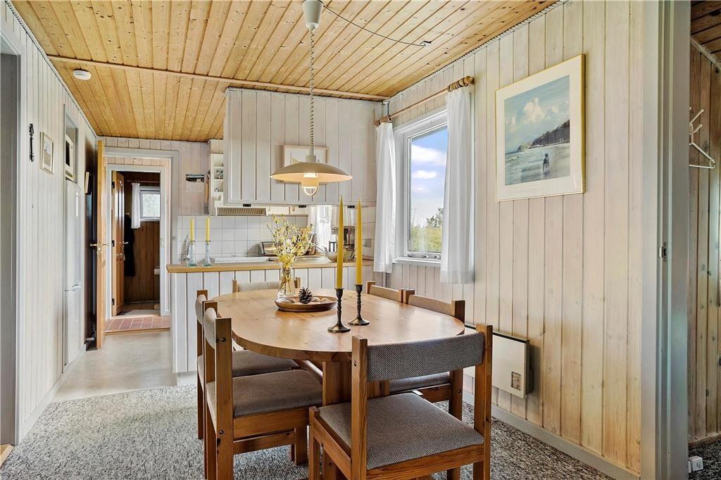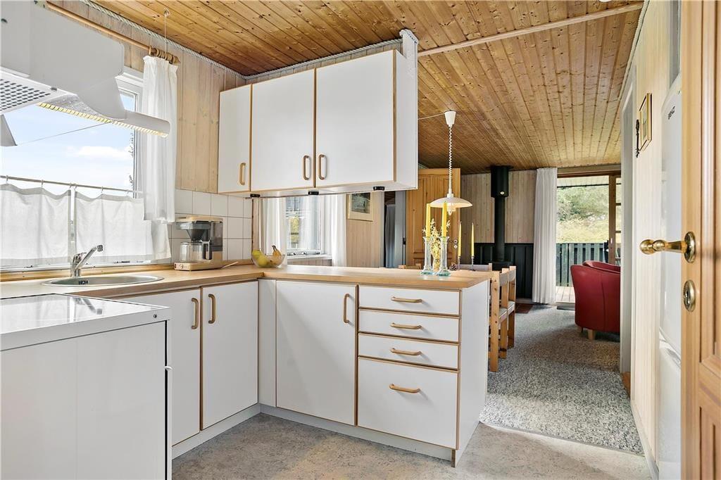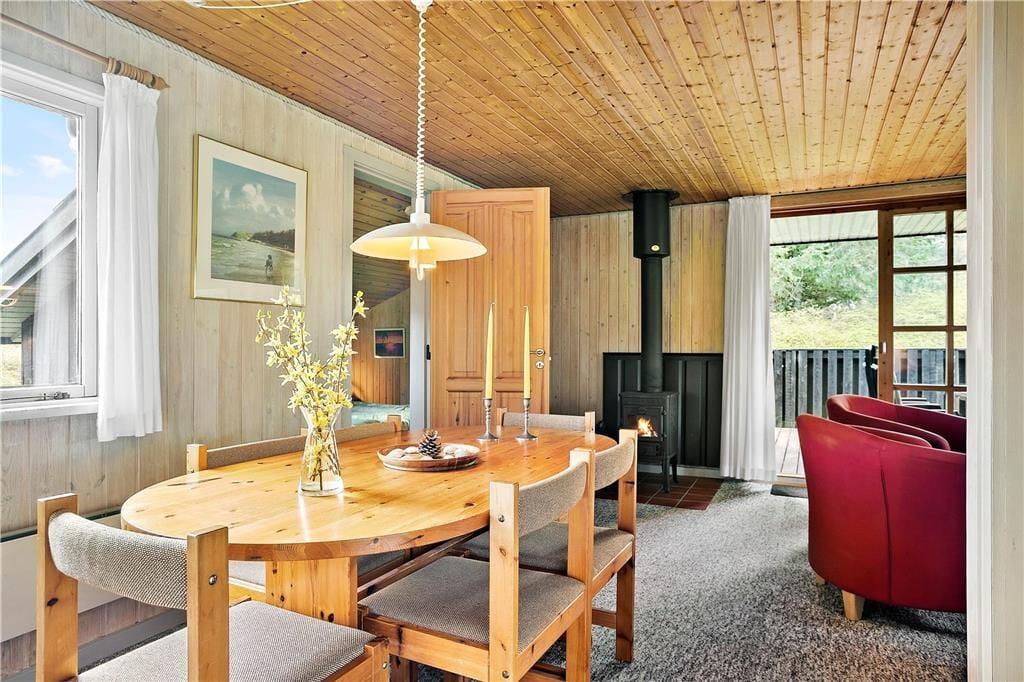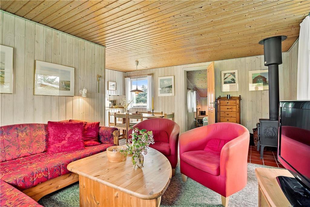 Med sort træfacade og flere terrasser præsenterer sommerhuset sig på klassisk vis midt på den grønne grund. Den klassiske sommerhusfornemmelse gør sig også gældende indenfor, for her er der træbeklædning på vægge og lofter, og en brændeovn bidrager med hyggestemning og varme temperaturer i stuen. Her kan I samles for at spille brætspil, se TV eller bare slappe af i sofaafdelingen – og hvis I er ved at blive sultne, kan I gå i gang med at forberede aftensmaden i den åbne køkkenafdeling. Et badeværelse hører selvfølgelig også med til planløsningen, og endelig er der tre soveværelser, der alle er indrettet med dobbeltseng.